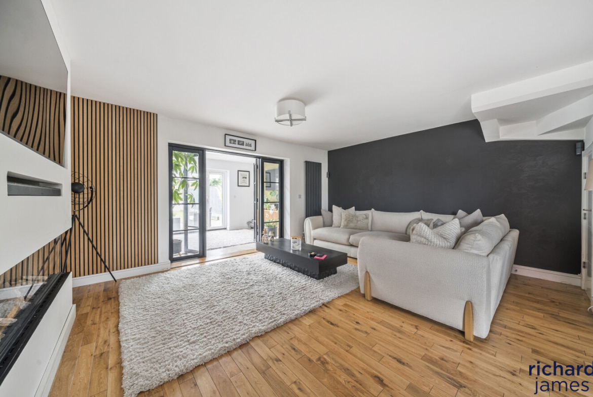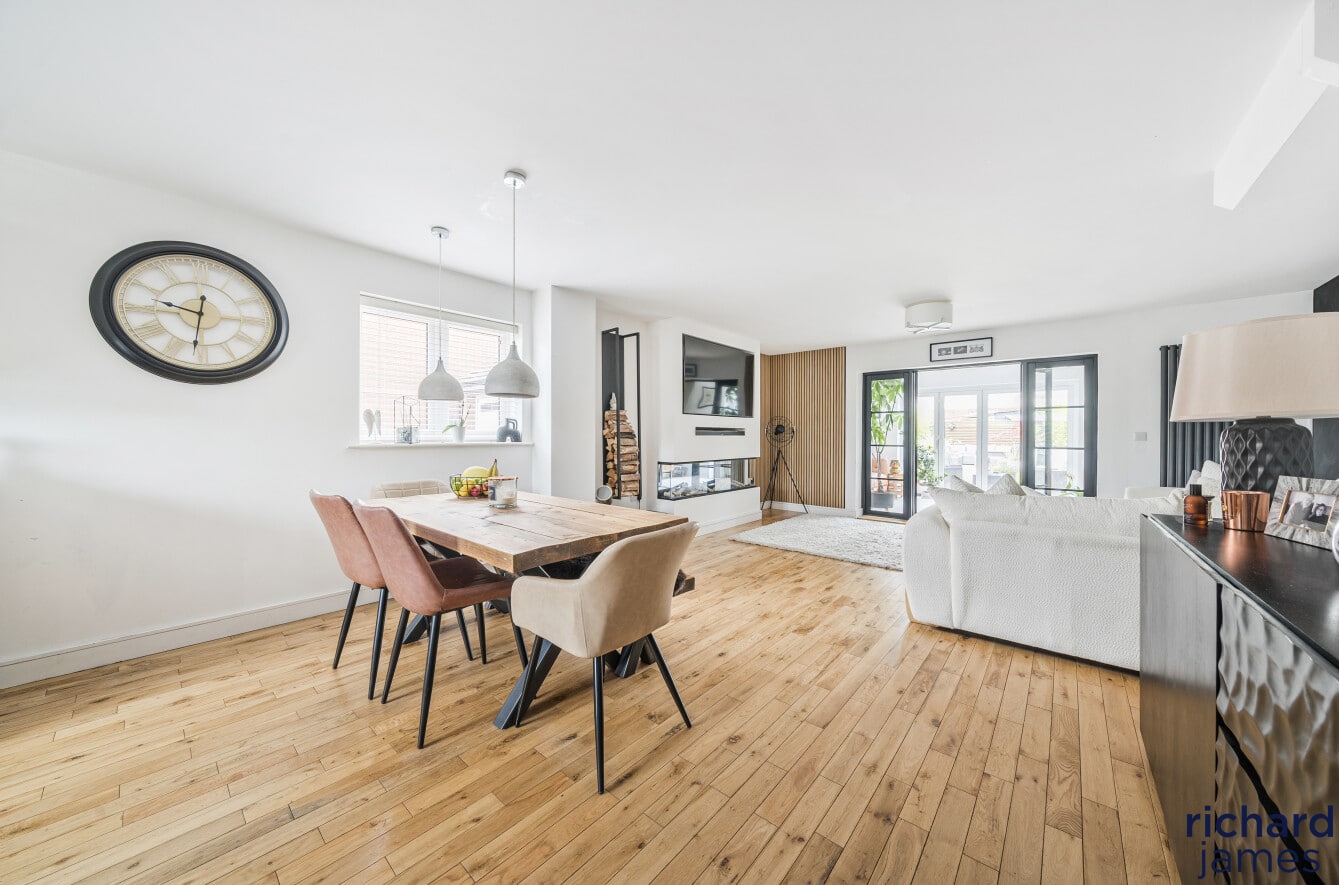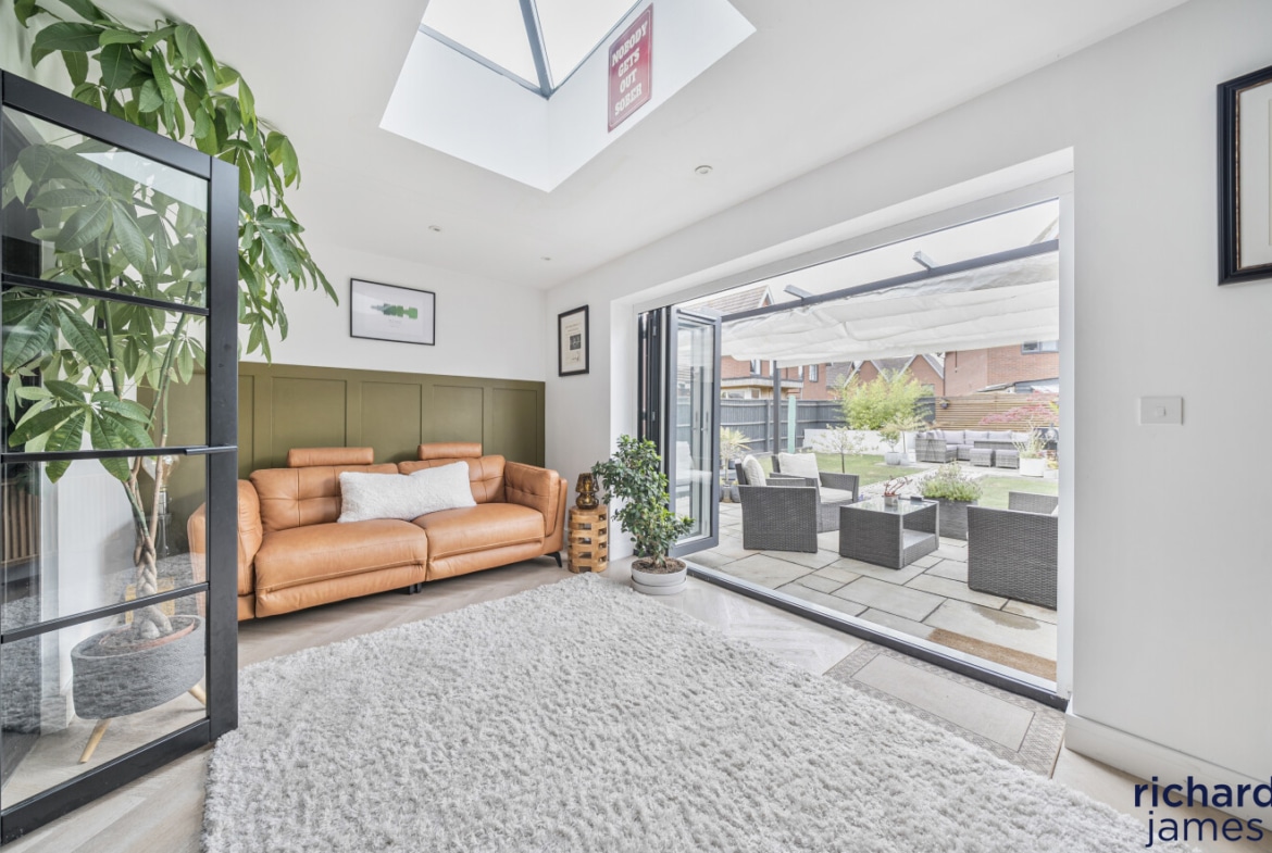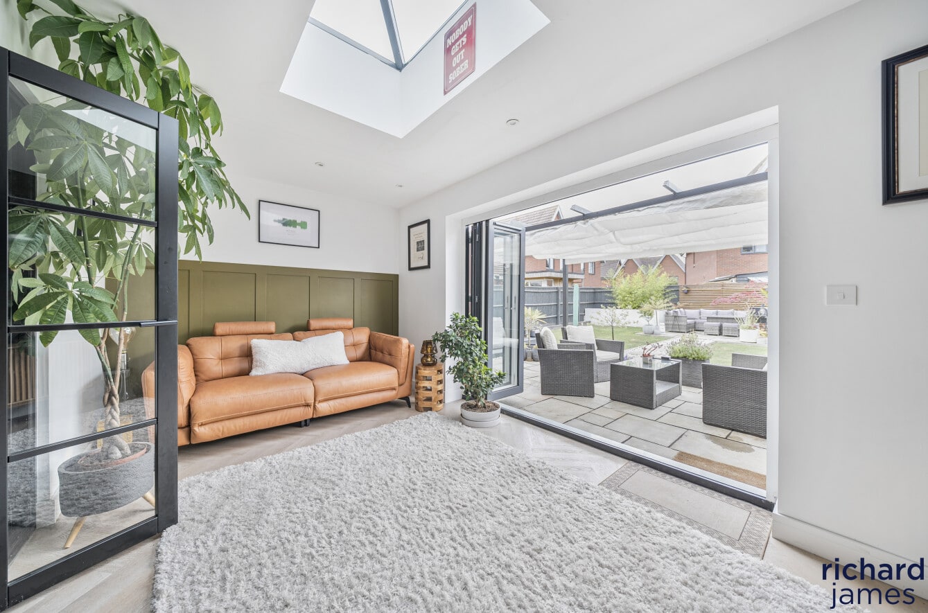 This immaculate property comprises; Entrance Hallway, Cloakroom, a large open plan Living/Dining area and Kitchen with all white goods, a media wall has also been installed with a feature evonic fire providing a real focal point to the room. There is a second reception room separated by crittal design doors allowing lots of lights through the home, this room further benefits from a sky lantern, bifold doors leading to the Garden and herringbone flooring. To the first floor are three good sized Bedrooms with the Master benefitting from built in wardrobes and an En-Suite and a family Bathroom.