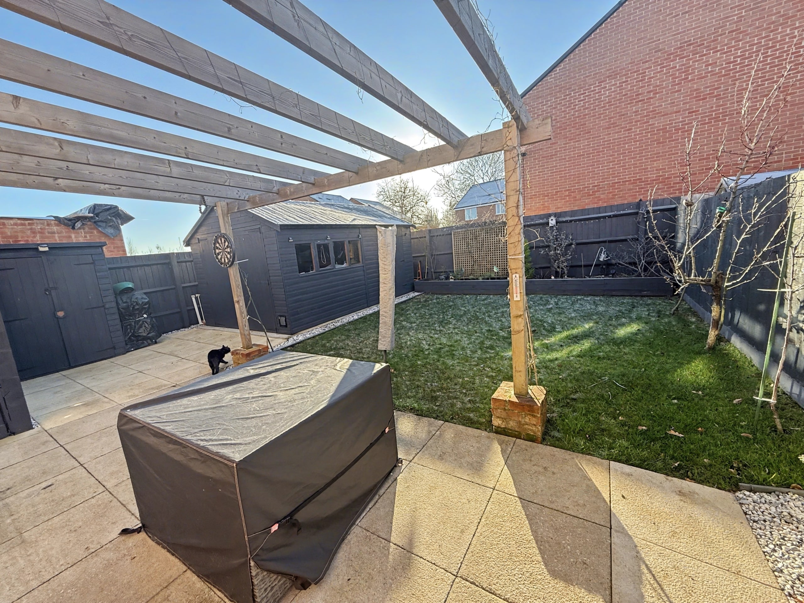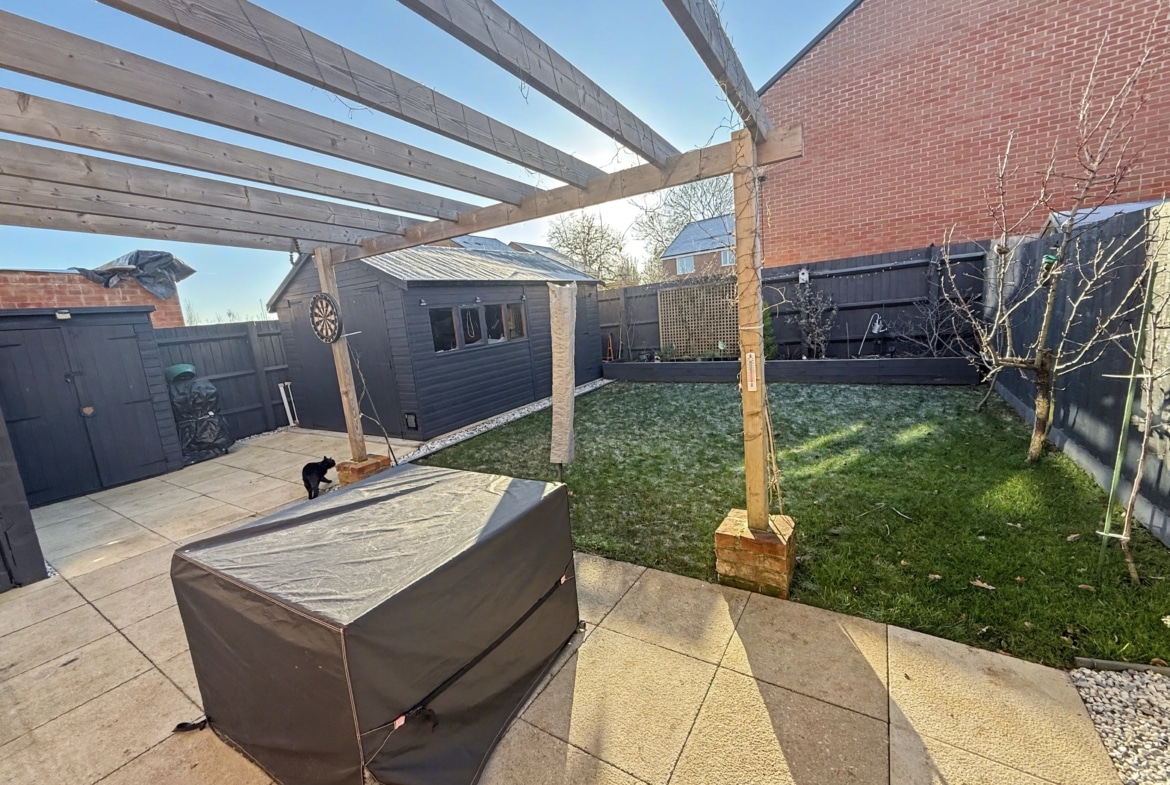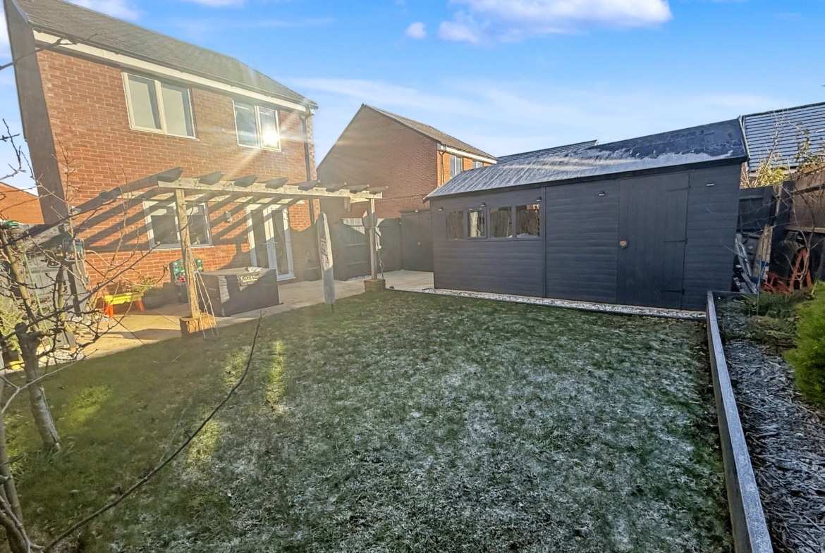 Accessible via French doors from the kitchen, the delightful rear garden beckons, boasting a patio area, large shed, pergola, and generous lawn, ideal for outdoor entertaining or peaceful relaxation. Further enhancing the outdoor experience, gated side access onto the driveway provides added convenience.