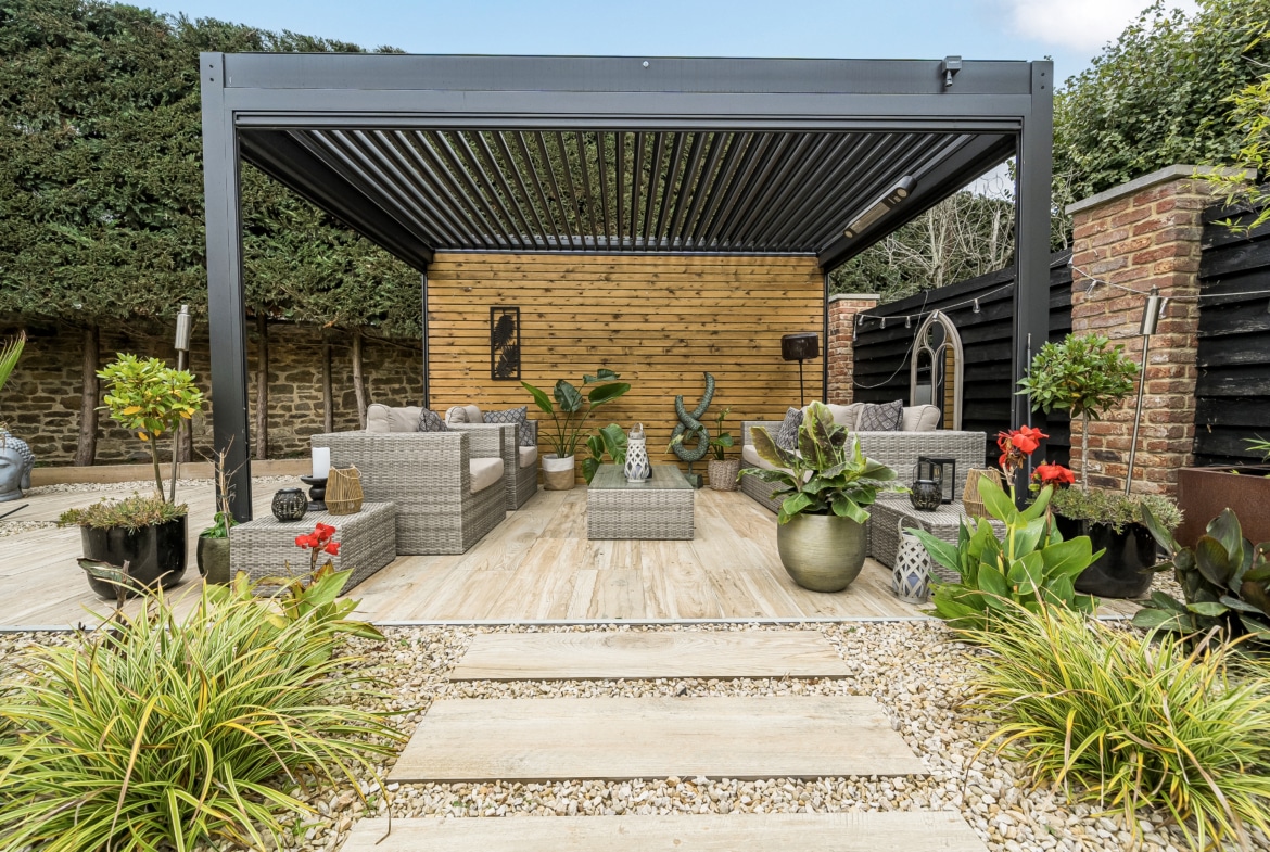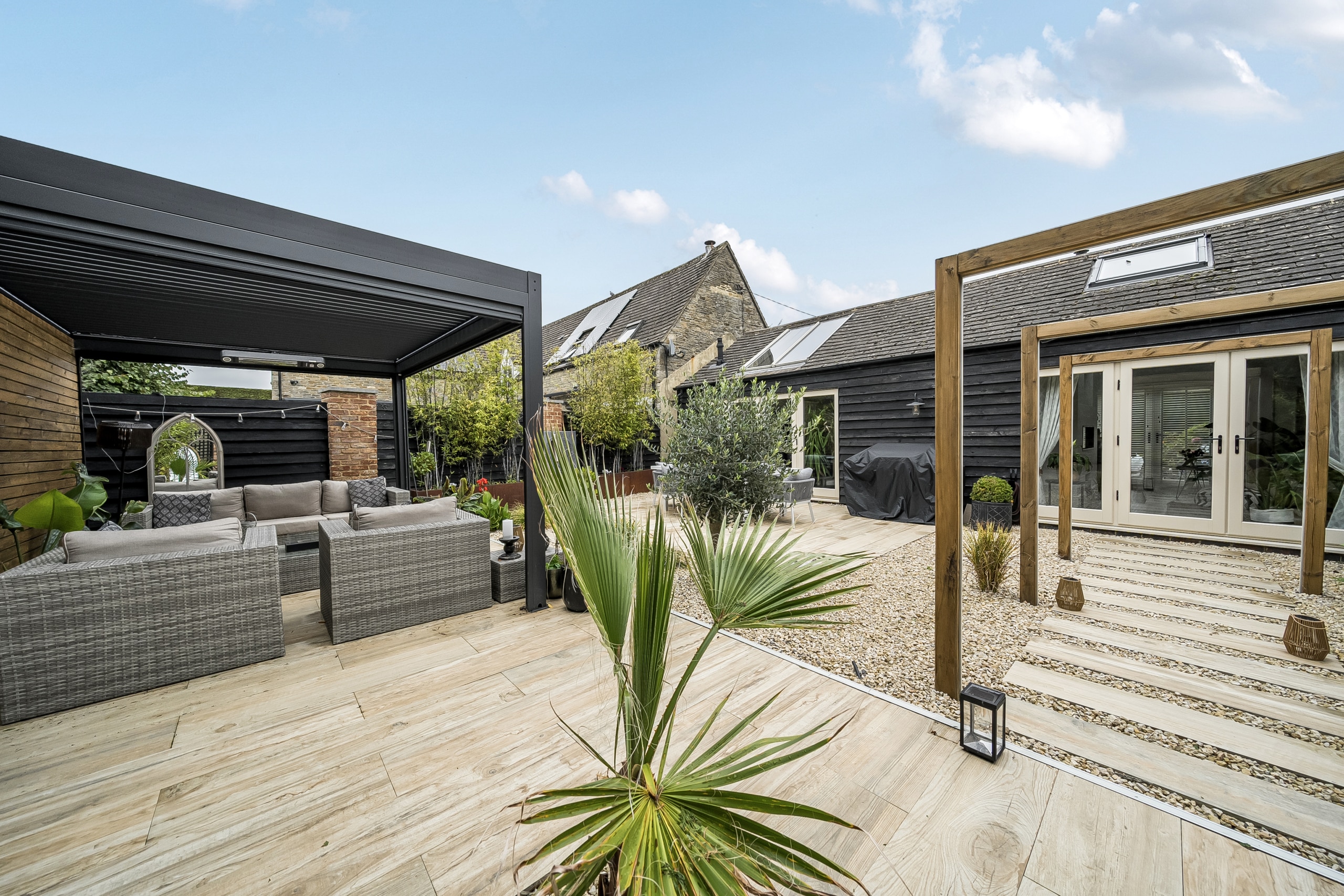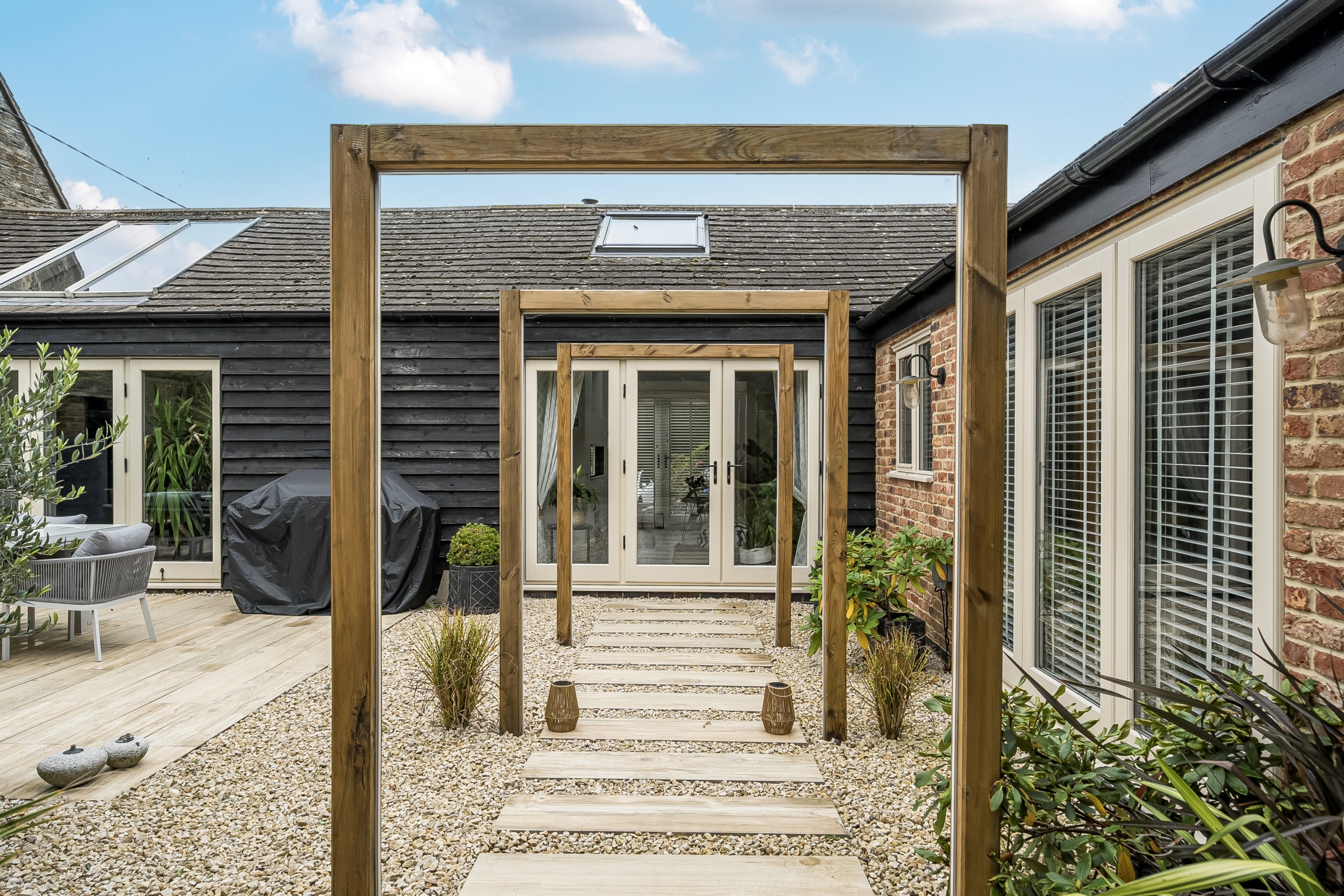 Outside, the property boasts a meticulously landscaped rear garden, enhanced with subtle lighting, a pergola, and multiple seating areas ideal for year-round enjoyment and alfresco living. Shared shingled driveway.
