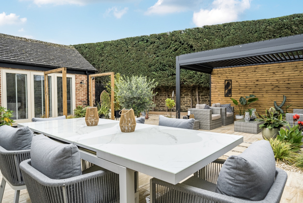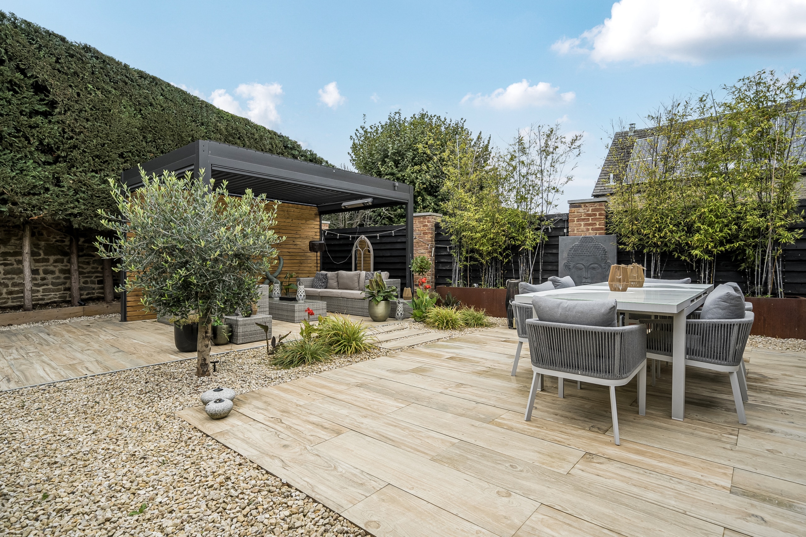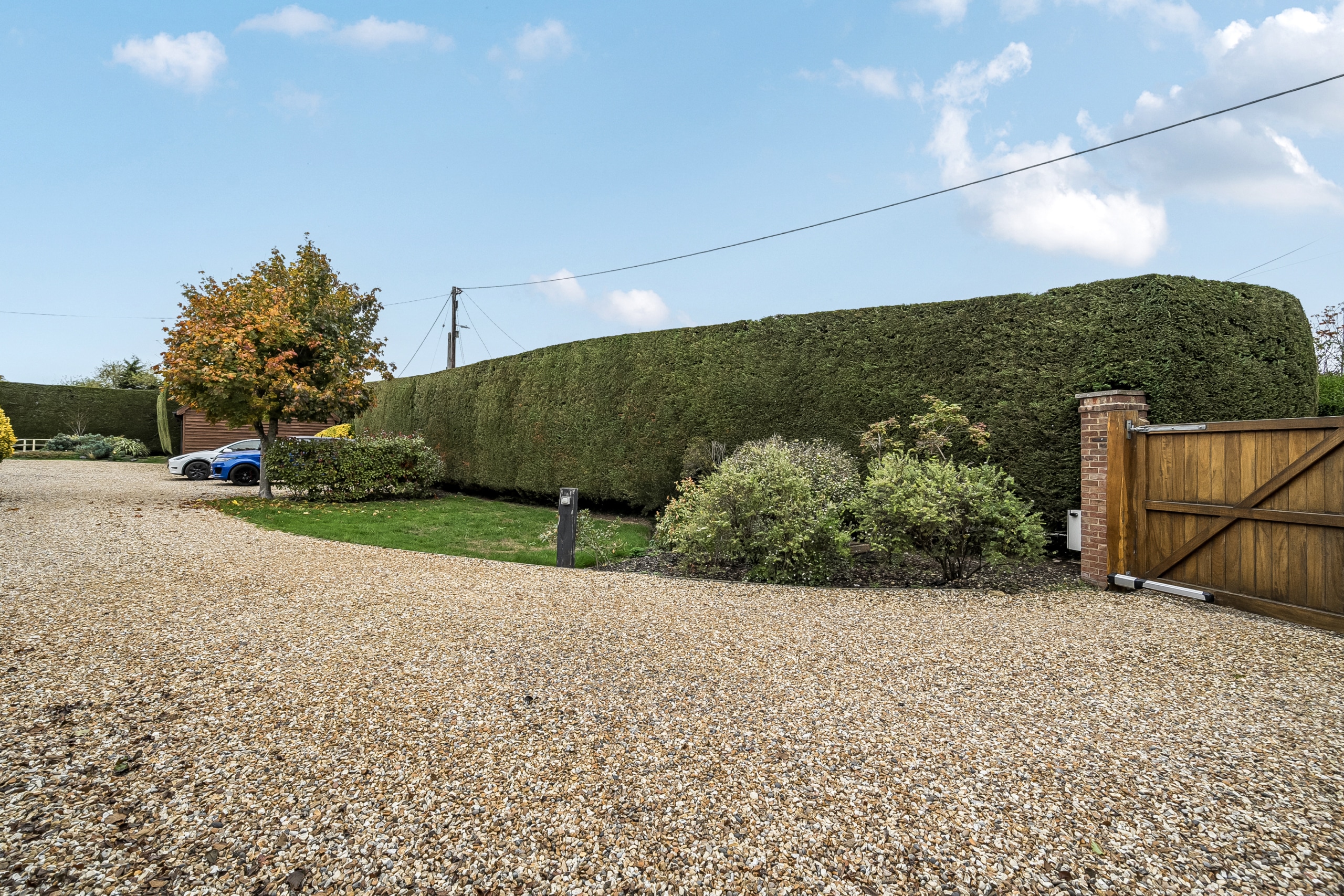 Outside, the property boasts a meticulously landscaped rear garden, enhanced with subtle lighting, a pergola, and multiple seating areas ideal for year-round enjoyment and alfresco living. Shared shingled driveway.