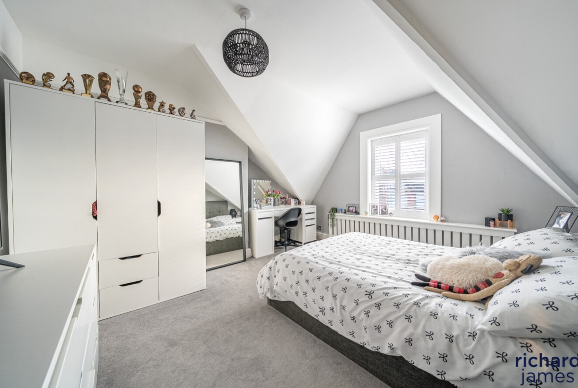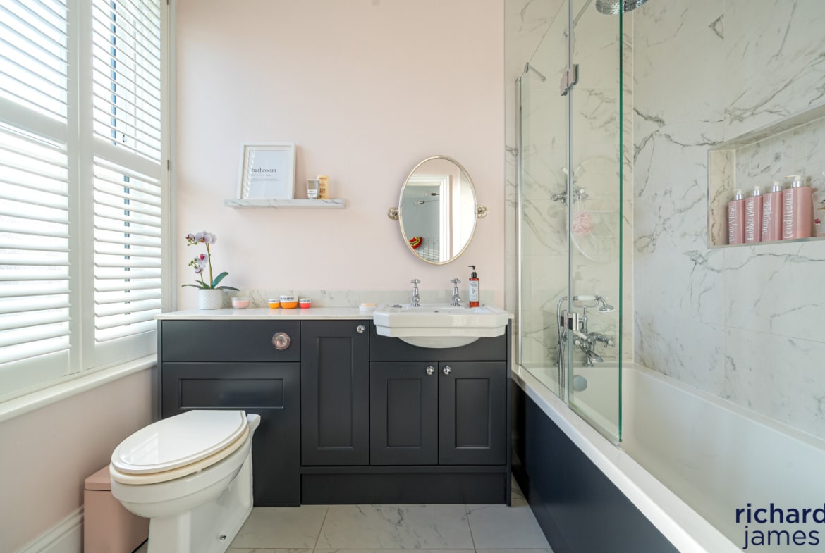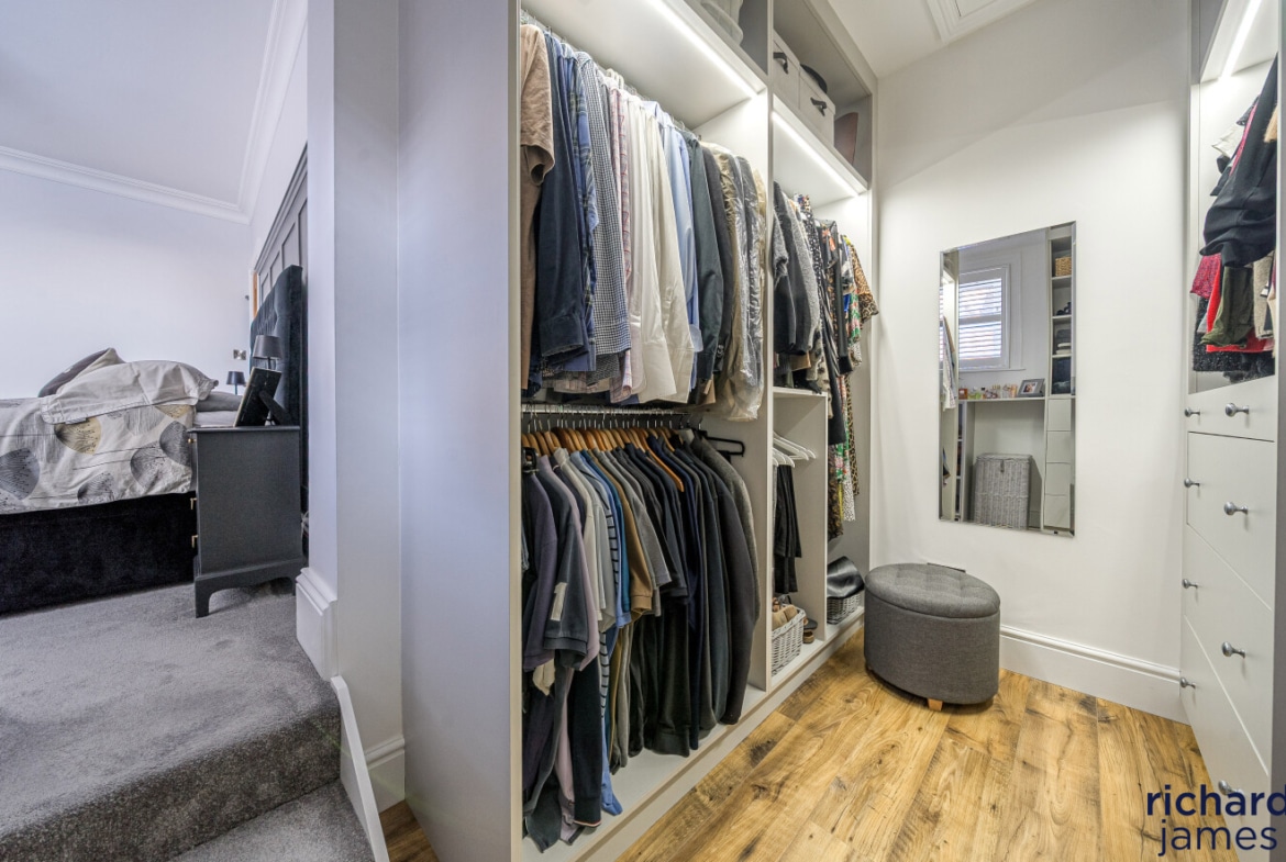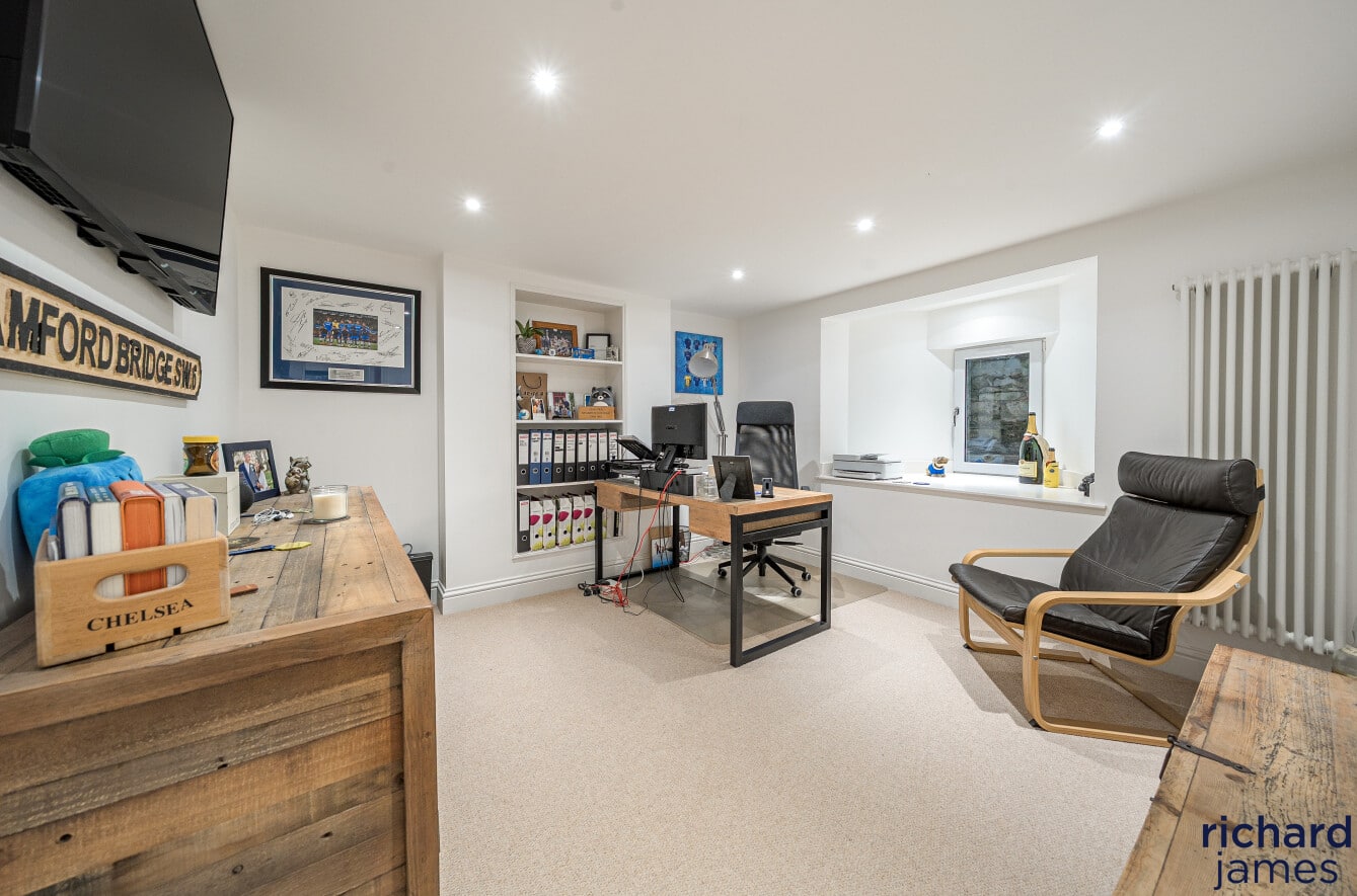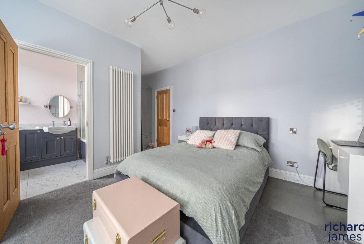 A striking staircase leads to the first floor, where you will find two spacious double Bedrooms. Bedroom One benefits from a large Dressing Room with fitted wardrobes and a refitted Ensuite Shower Room. Bedroom Two features an elegant bay window and a modern Ensuite Bathroom. The top floor offers two further double Bedrooms and an additional refitted Shower Room. To the Lower Ground Floor lies a generous Study and useful storage space.