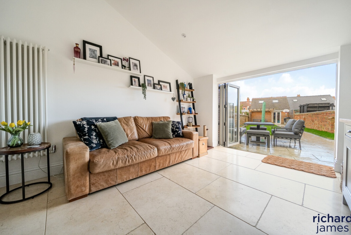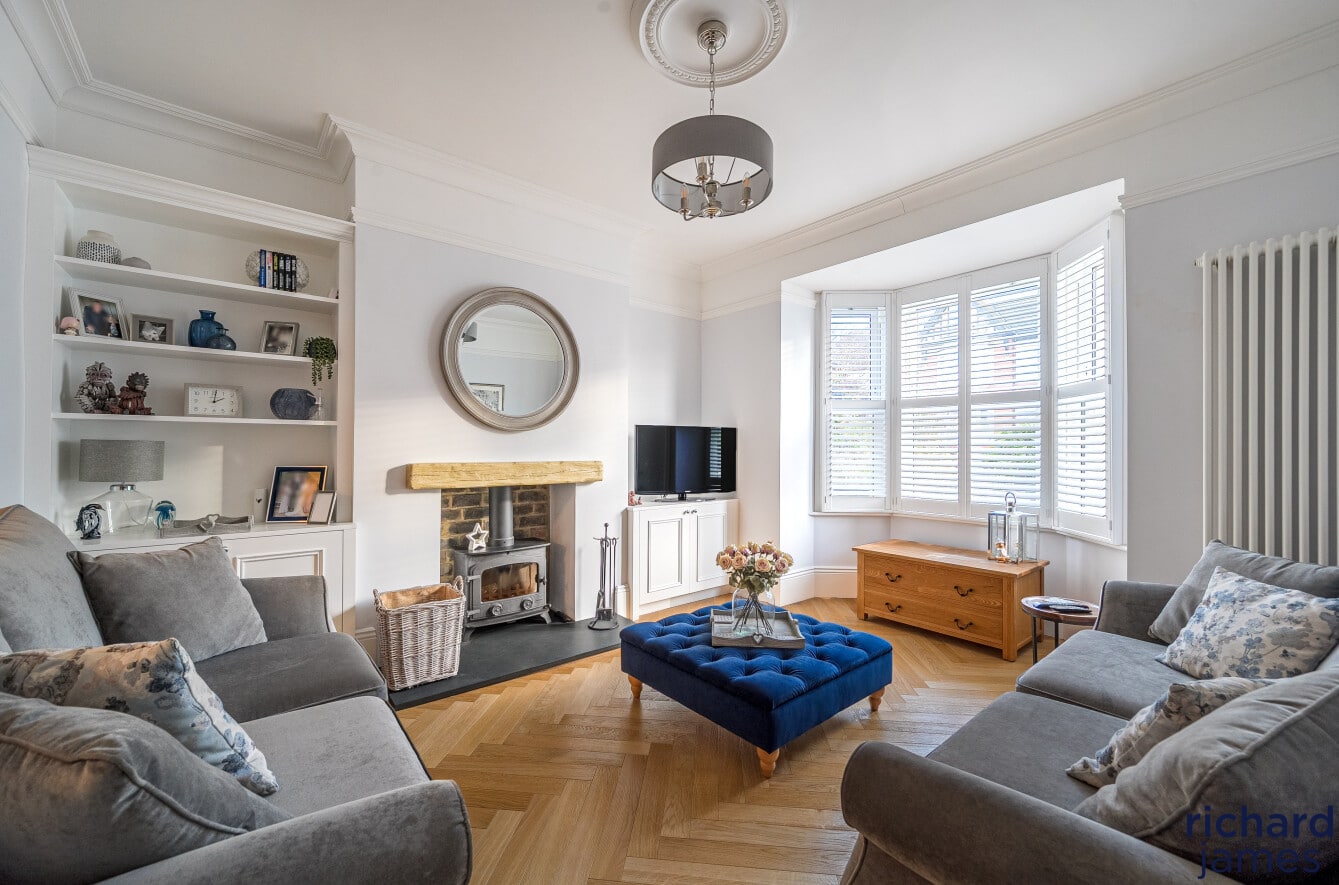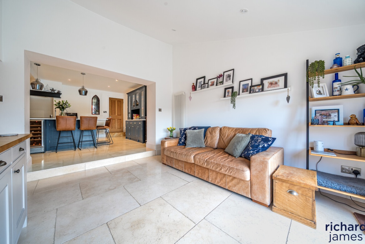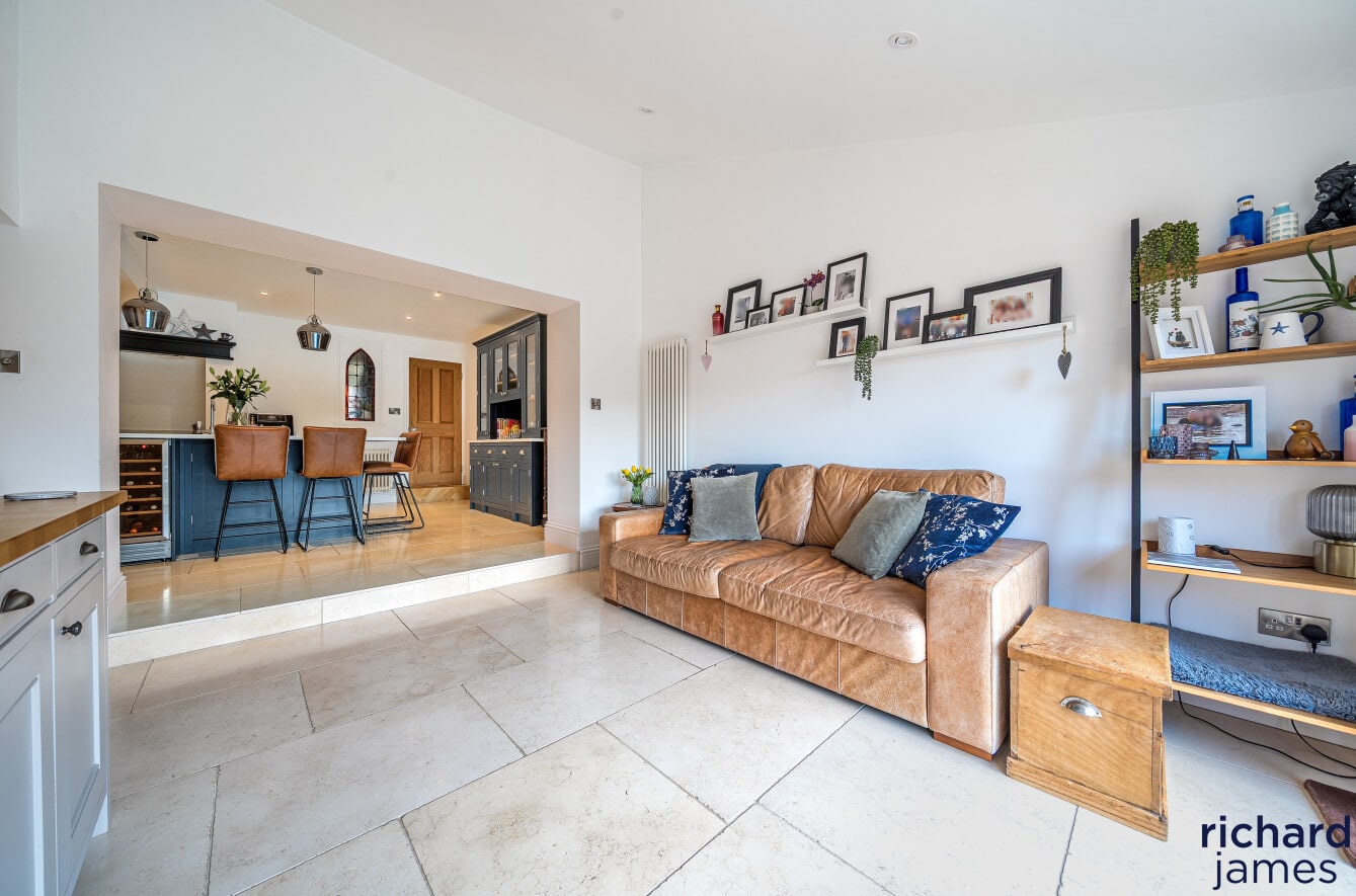 Immaculately presented throughout, the home provides approaching 2,300 sq ft of versatile accommodation. An impressive Entrance Hall with attractive oak flooring leads into the bright and airy Sitting Room, featuring a bay window and log burner. This in turn opens seamlessly into the Dining Room. The stunning 18′ refitted Kitchen/Breakfast Room showcases bespoke Olive & Barr cabinetry, integrated appliances, and a generous island unit. This space flows into the Family Room, where bi-fold doors open onto the landscaped Rear Garden. A separate refitted Utility Room and Cloakroom complete the ground floor.