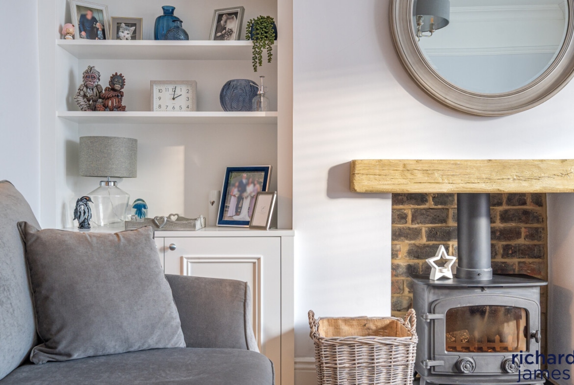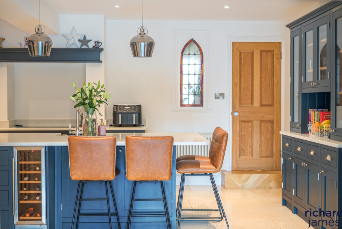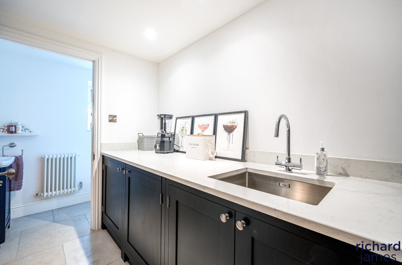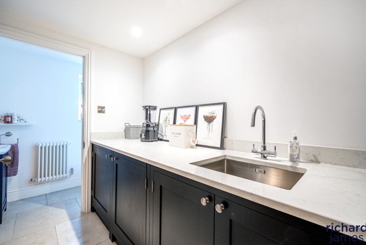 Immaculately presented throughout, the home provides approaching 2,300 sq ft of versatile accommodation. An impressive Entrance Hall with attractive oak flooring leads into the bright and airy Sitting Room, featuring a bay window and log burner. This in turn opens seamlessly into the Dining Room. The stunning 18′ refitted Kitchen/Breakfast Room showcases bespoke Olive & Barr cabinetry, integrated appliances, and a generous island unit. This space flows into the Family Room, where bi-fold doors open onto the landscaped Rear Garden. A separate refitted Utility Room and Cloakroom complete the ground floor.