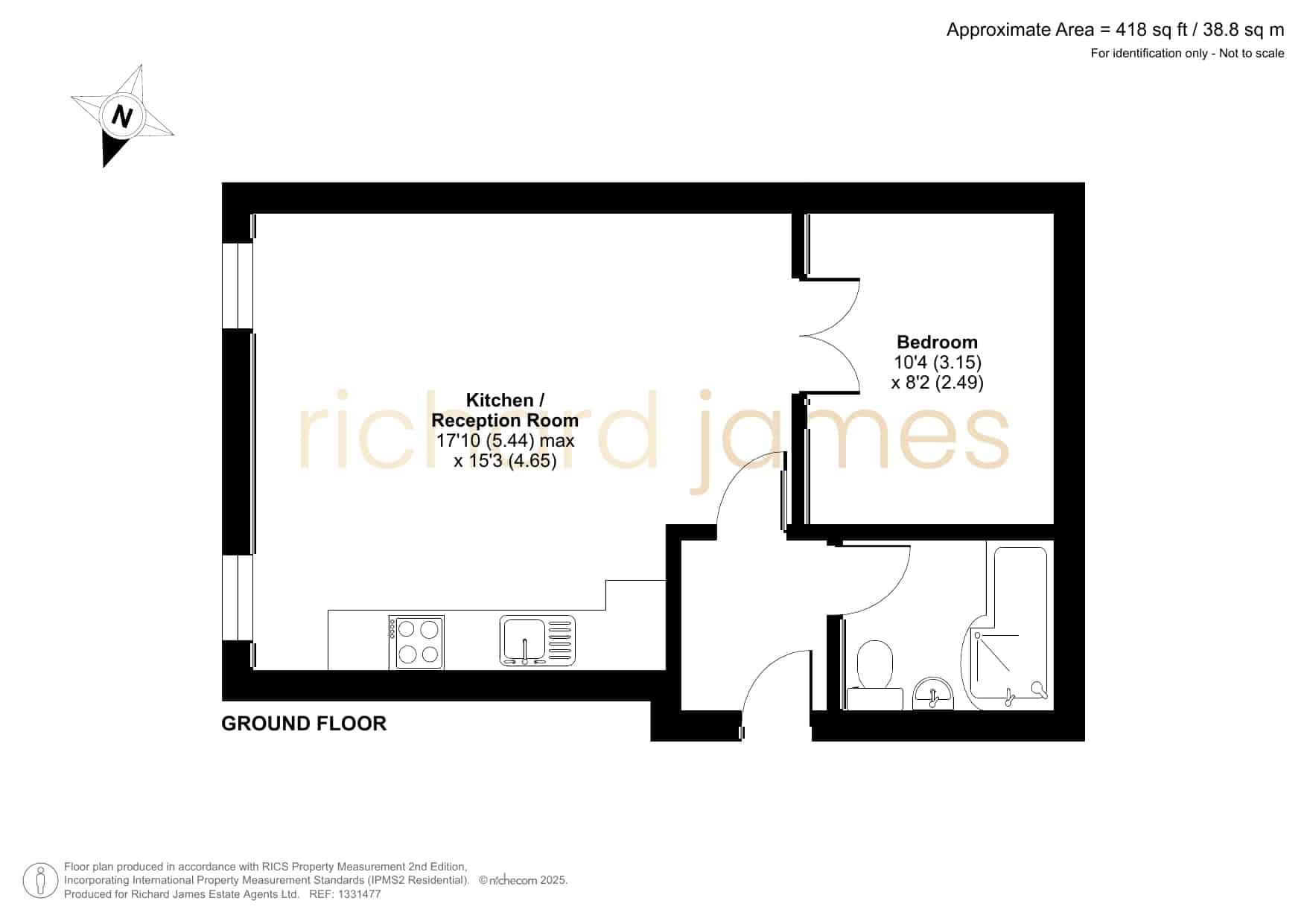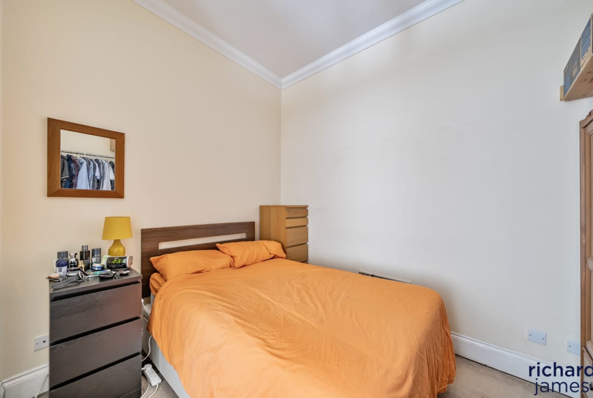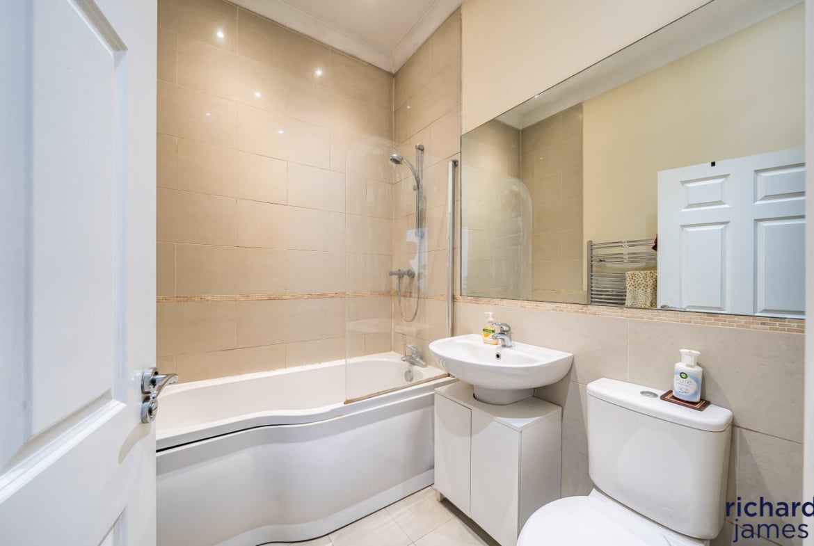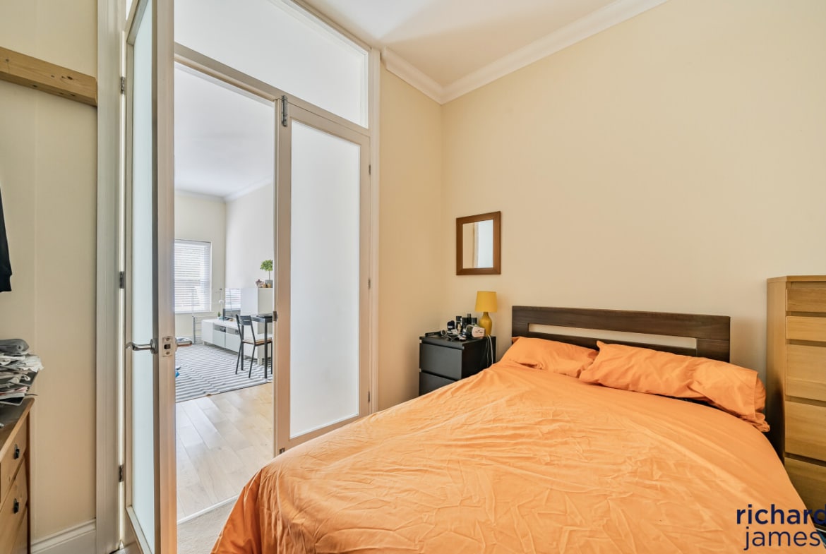 The bedroom is a comfortable double, offering a peaceful retreat with room for storage and furnishings. The bathroom includes a full-size bath with shower, WC, and basin, all neatly arranged for functionality.