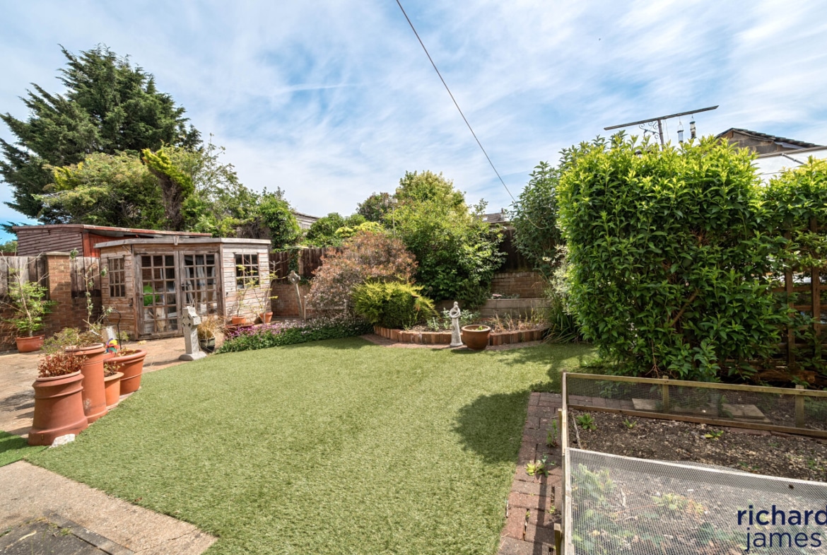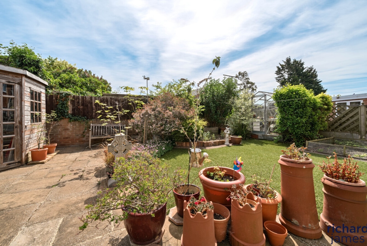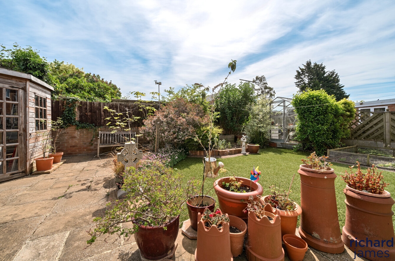 To the rear is an enclosed rear garden with a patio seating and barbecue area leading to a large lawn and summer-house.