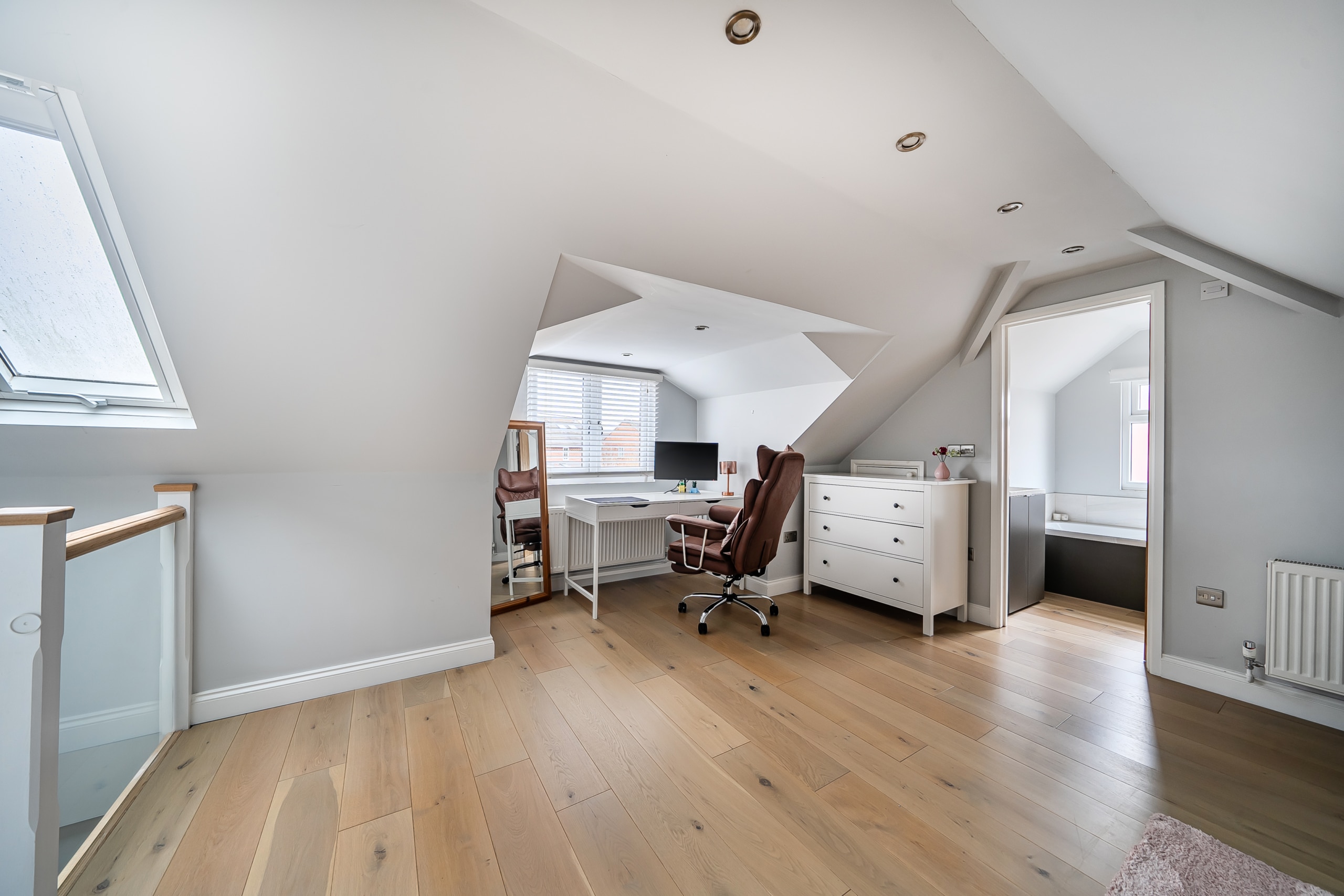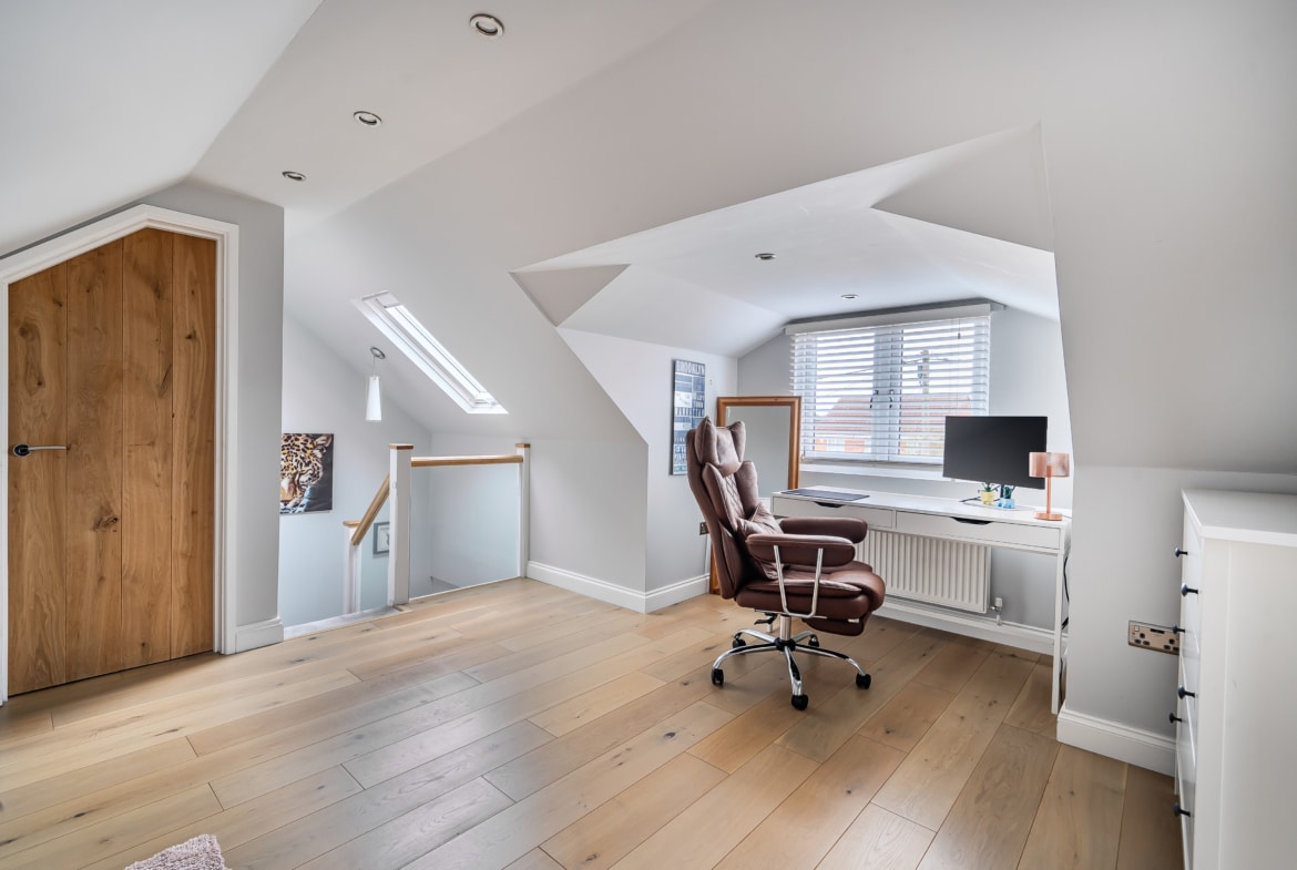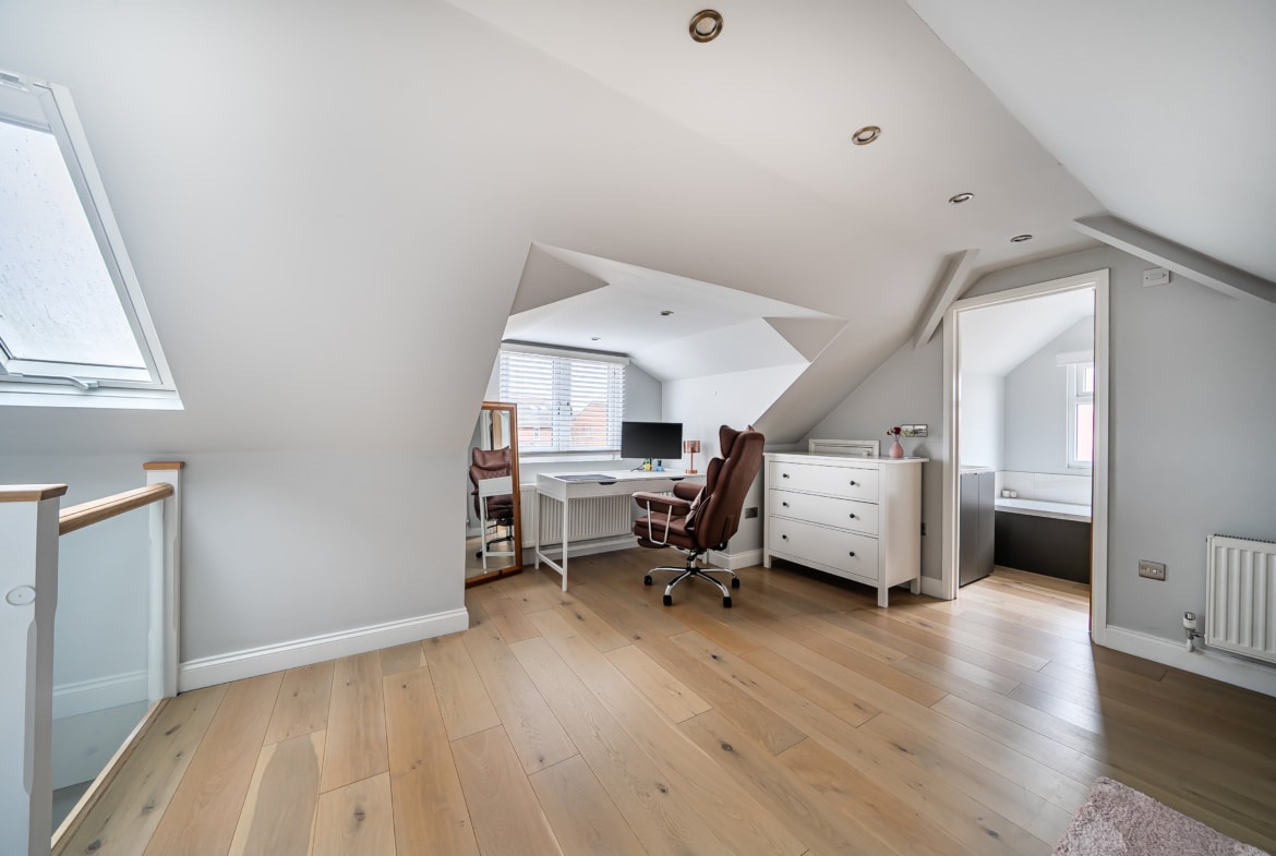 Upstairs, a generous double bedroom spans the entire top floor, offering a peaceful and private retreat. It features built-in storage, excellent head height, and a stylish en-suite bathroom—making it an ideal option as a principal suite or the perfect guest space.