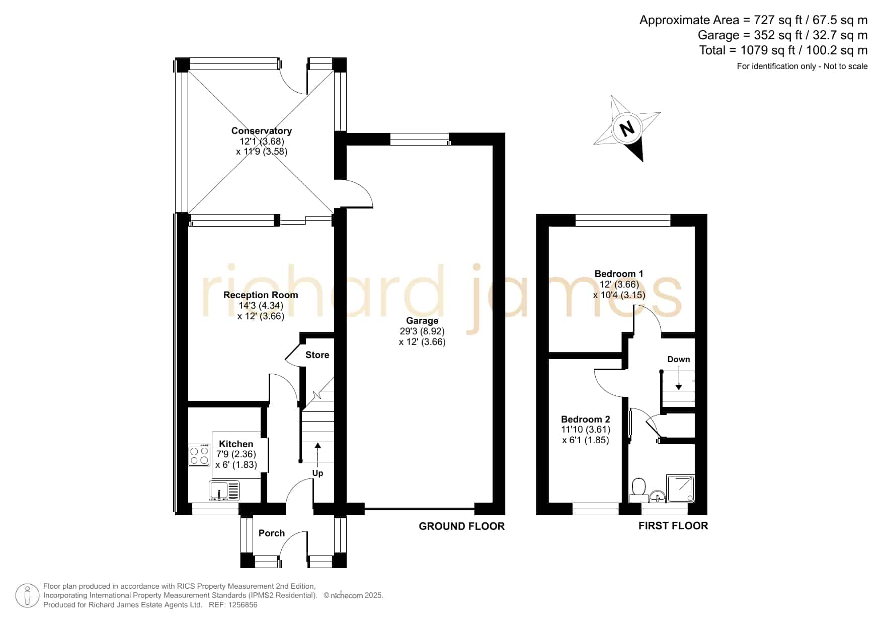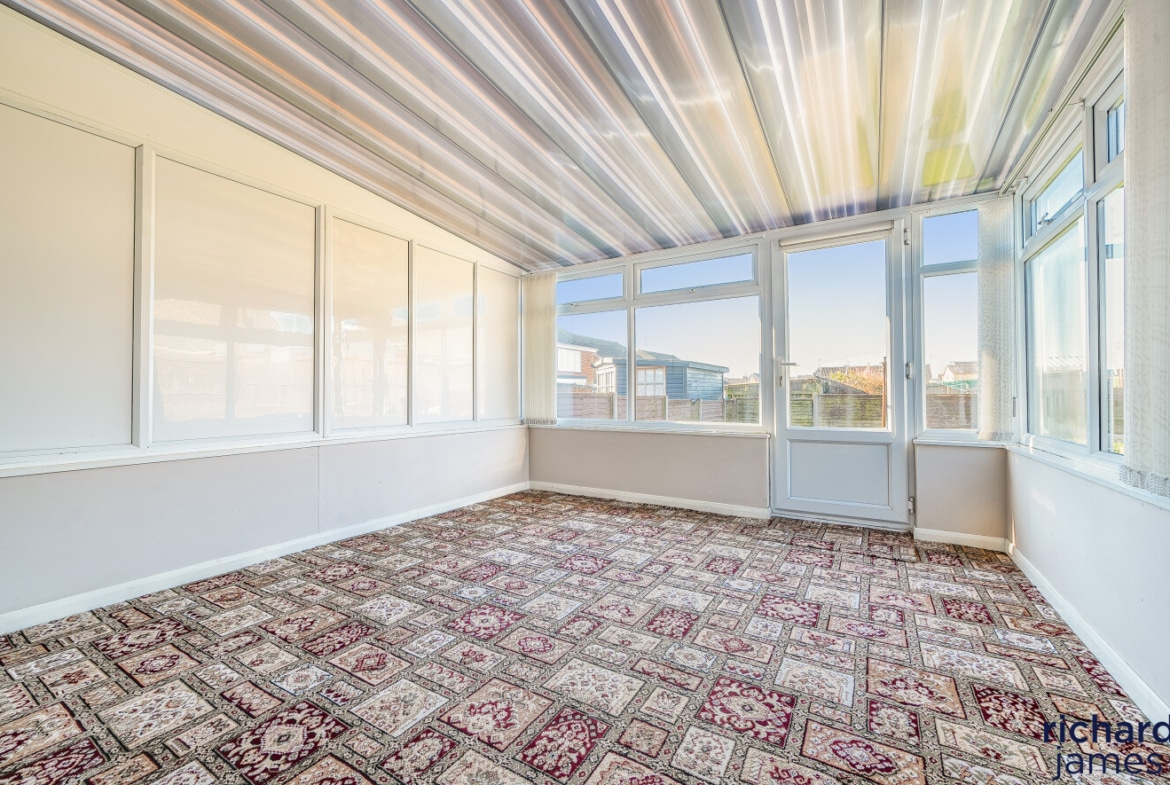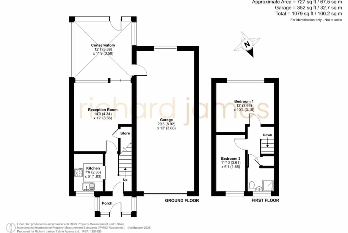 The property features a porch, entrance hall, kitchen, and a spacious lounge with under-stair storage, leading to a conservatory. Upstairs, you’ll find two well-proportioned bedrooms (one double and one large single) and a bathroom.