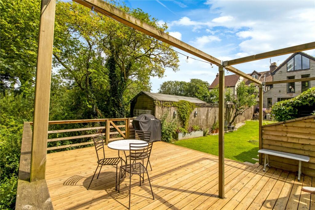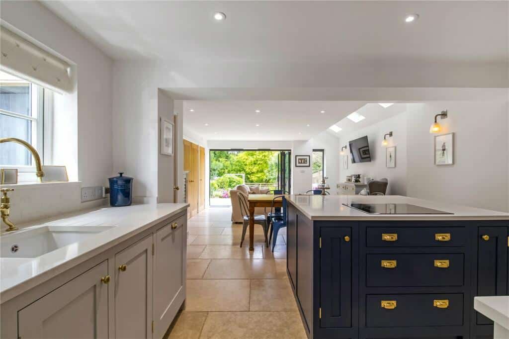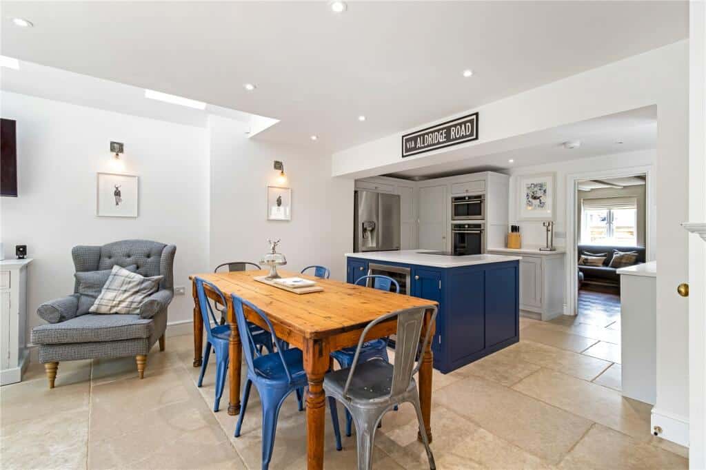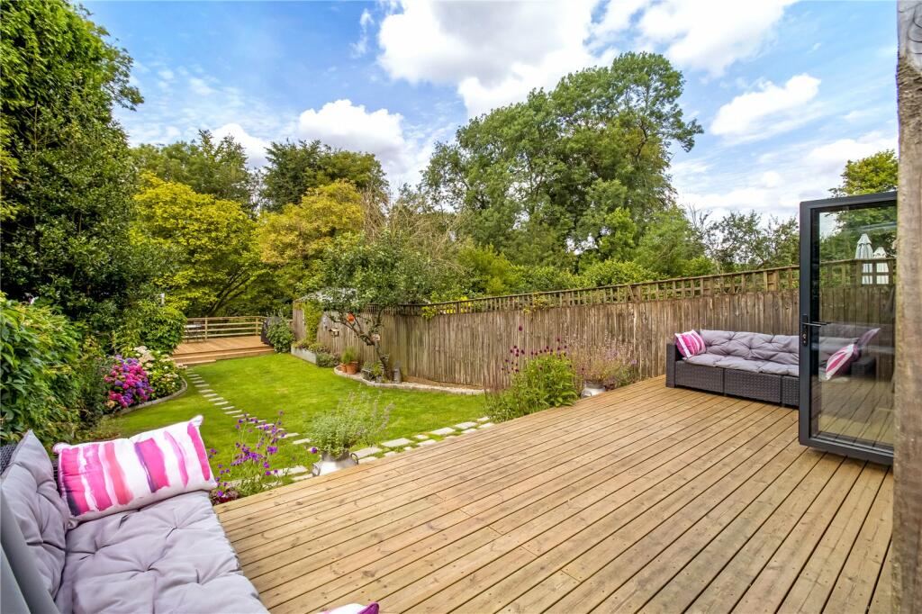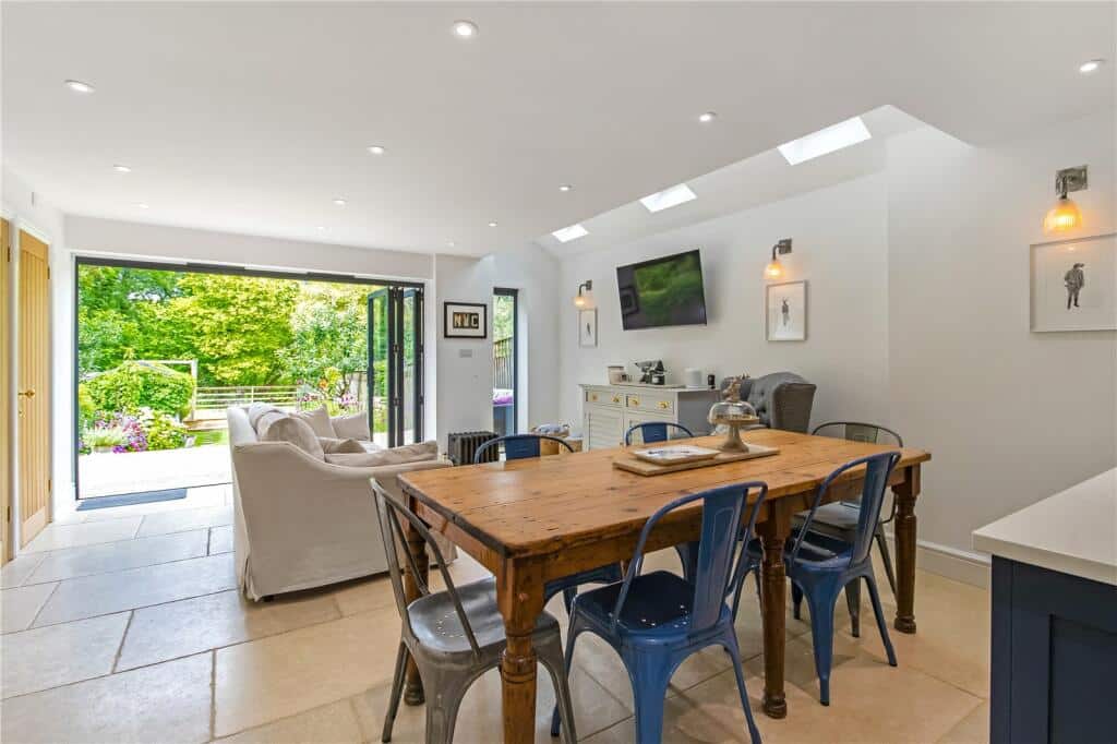 The ground floor features a stylish open-plan layout incorporating the kitchen, dining, and living areas, along with a WC. Bi-fold doors open onto a decked terrace that leads down into an established private garden with side gated access. The kitchen is well-equipped with quartz worktops, brass swan-neck taps, a central island with hob, integrated dishwasher and wine chiller, and a useful utility cupboard. This space flows into a cosy sitting room with parquet flooring and a traditional open fireplace with a log-burning stove.