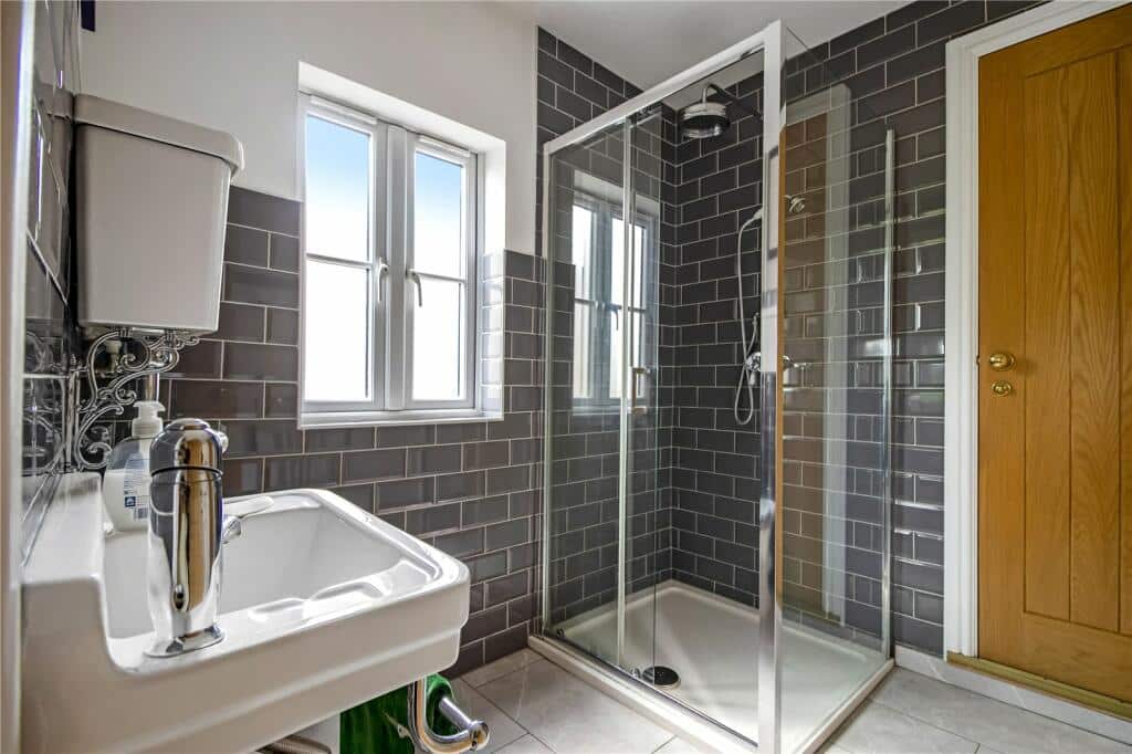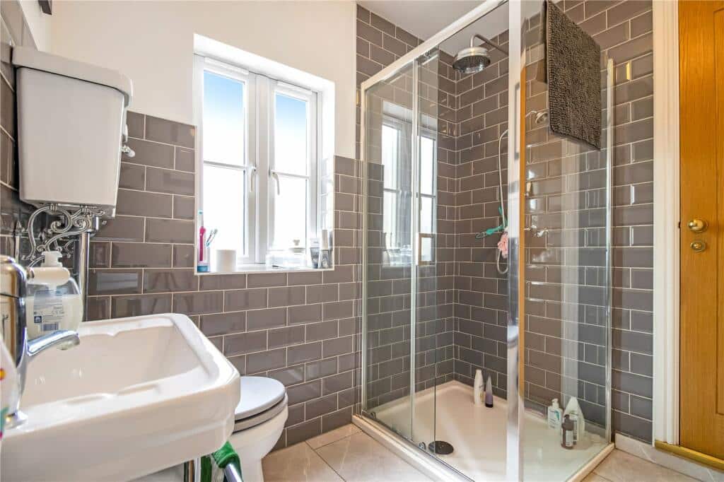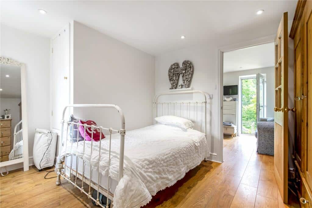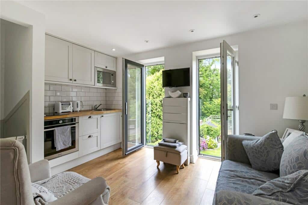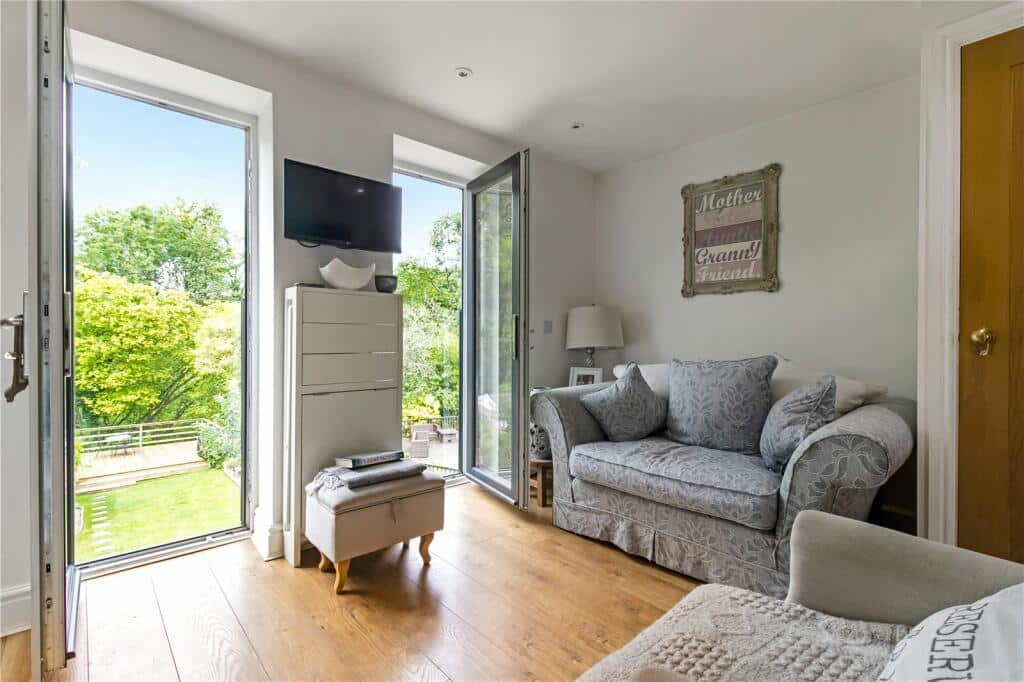 On the first floor, two separate staircases enhance the home’s versatility. One leads to two generous bedrooms sharing a modern shower room, while the other provides access to a self-contained area featuring a kitchenette with dining space, a Juliet balcony overlooking the garden, and a double bedroom with shared use of the same shower room—ideal for multi-generational living.