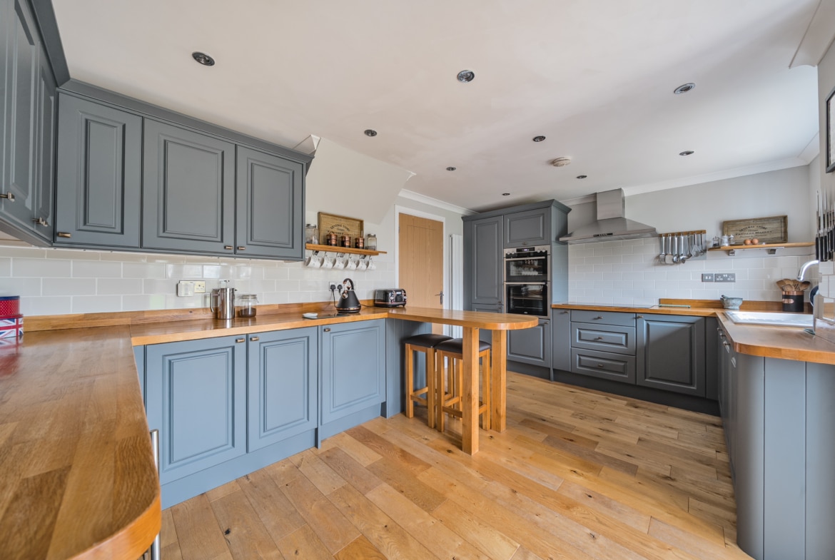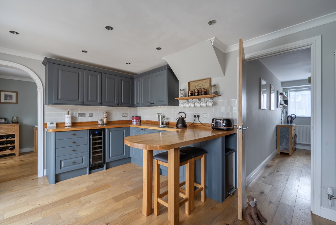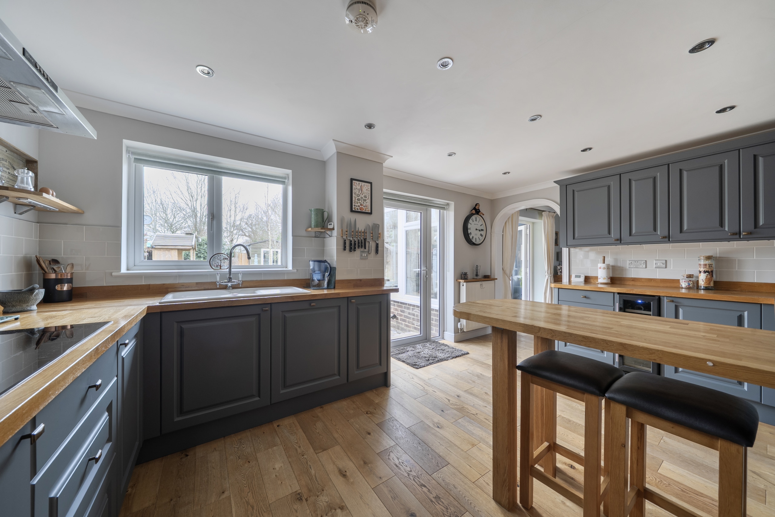 To the other side of the dining area is the beautifully extended kitchen, refitted with stylish units and wooden worktops, complemented by a breakfast bar and a range of integrated appliances, including a wine fridge. The former garage has been cleverly converted to provide a practical utility room and cloakroom, both accessed directly from the kitchen.