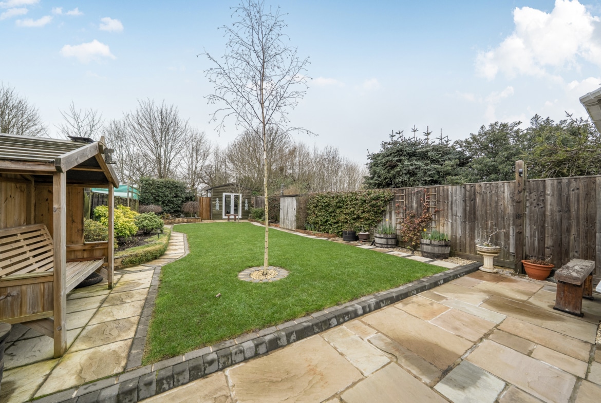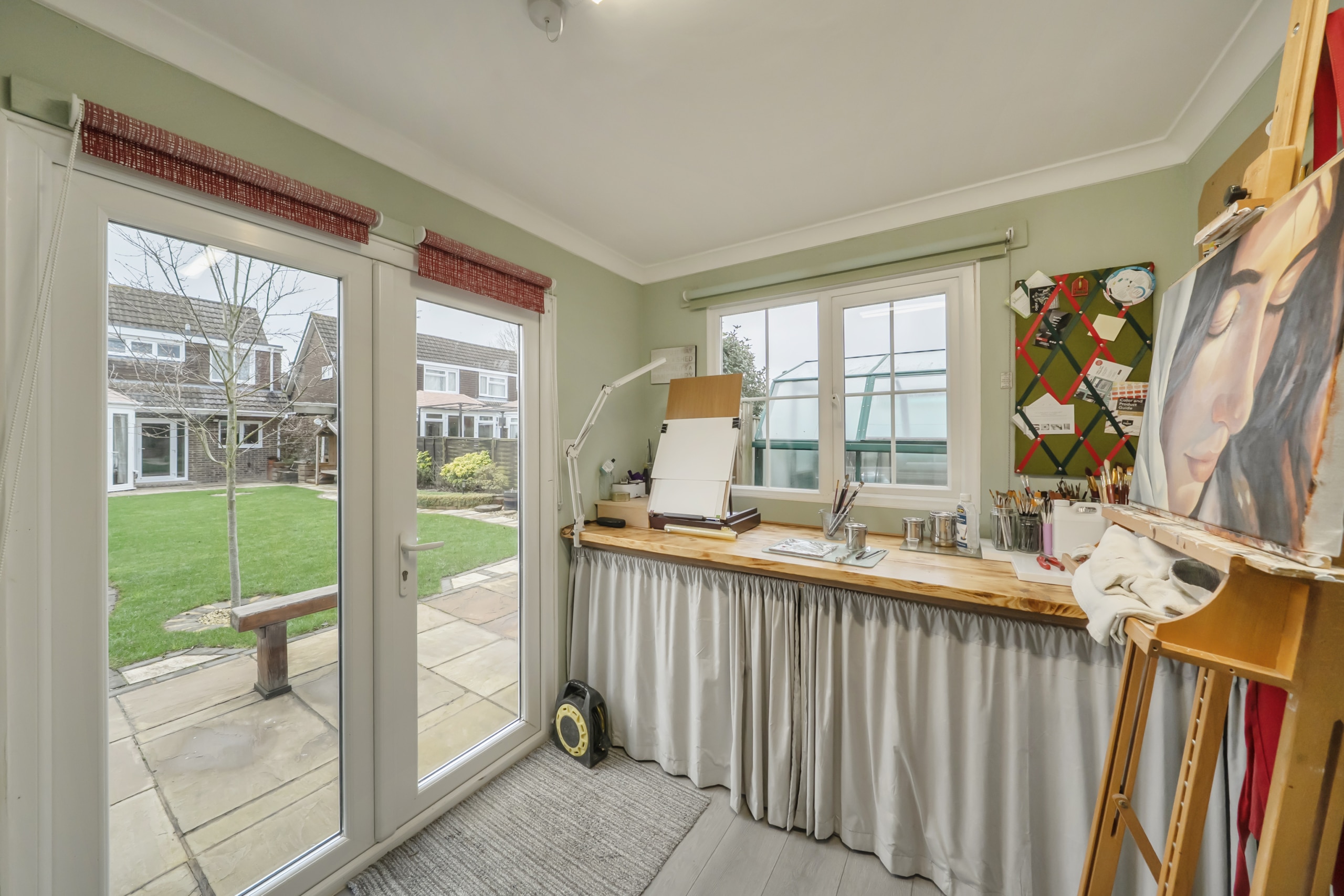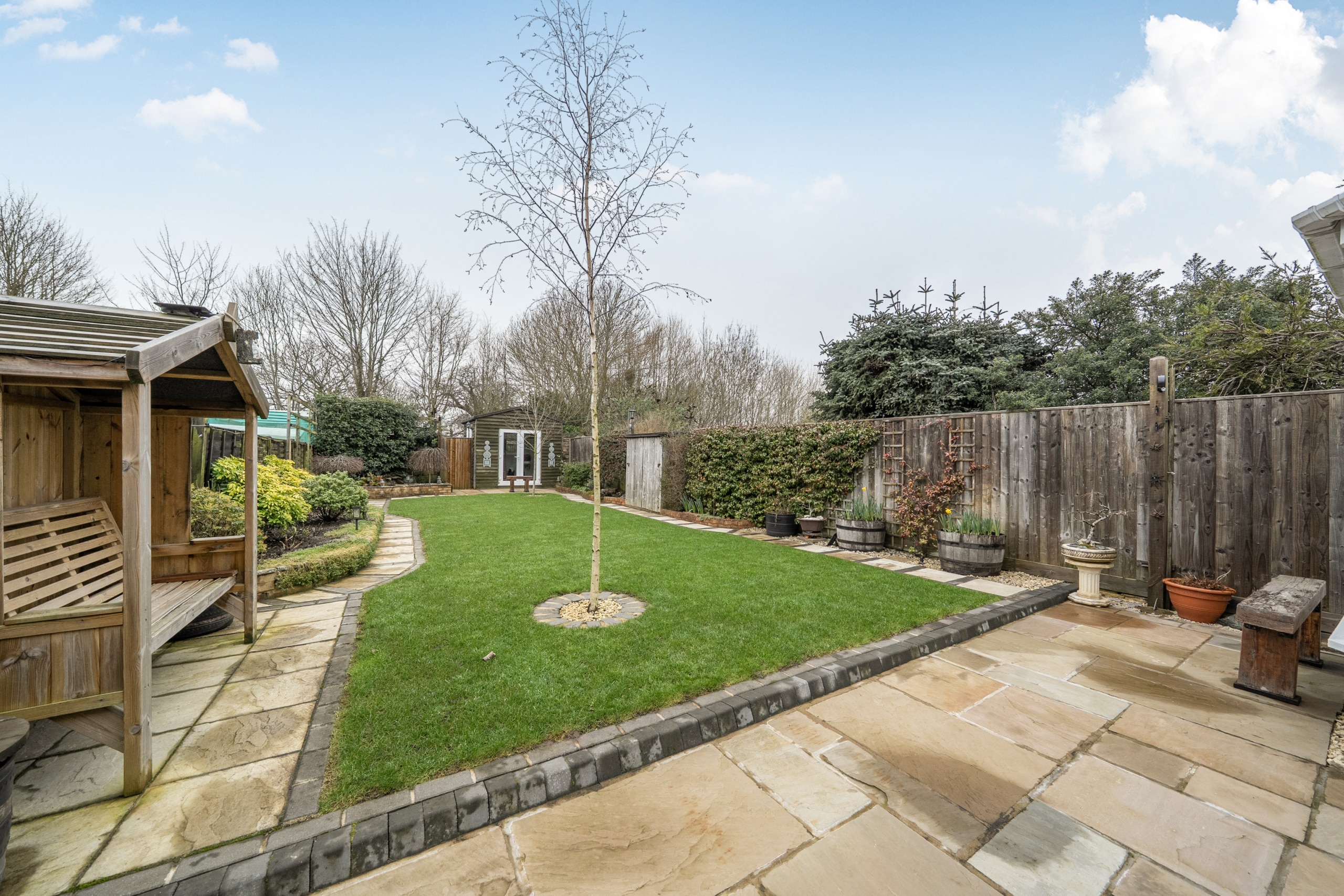 Externally, the rear garden has been beautifully landscaped and offers a combination of lawn and patio areas, ideal for outdoor dining and relaxation. An outbuilding with power, currently used as an art studio, adds further versatility. A separate gate allows access to a greenhouse and raised bed for gardening. Beyond this is a secure gate allowing field access, perfect for dog walks and enjoying the outdoors.
