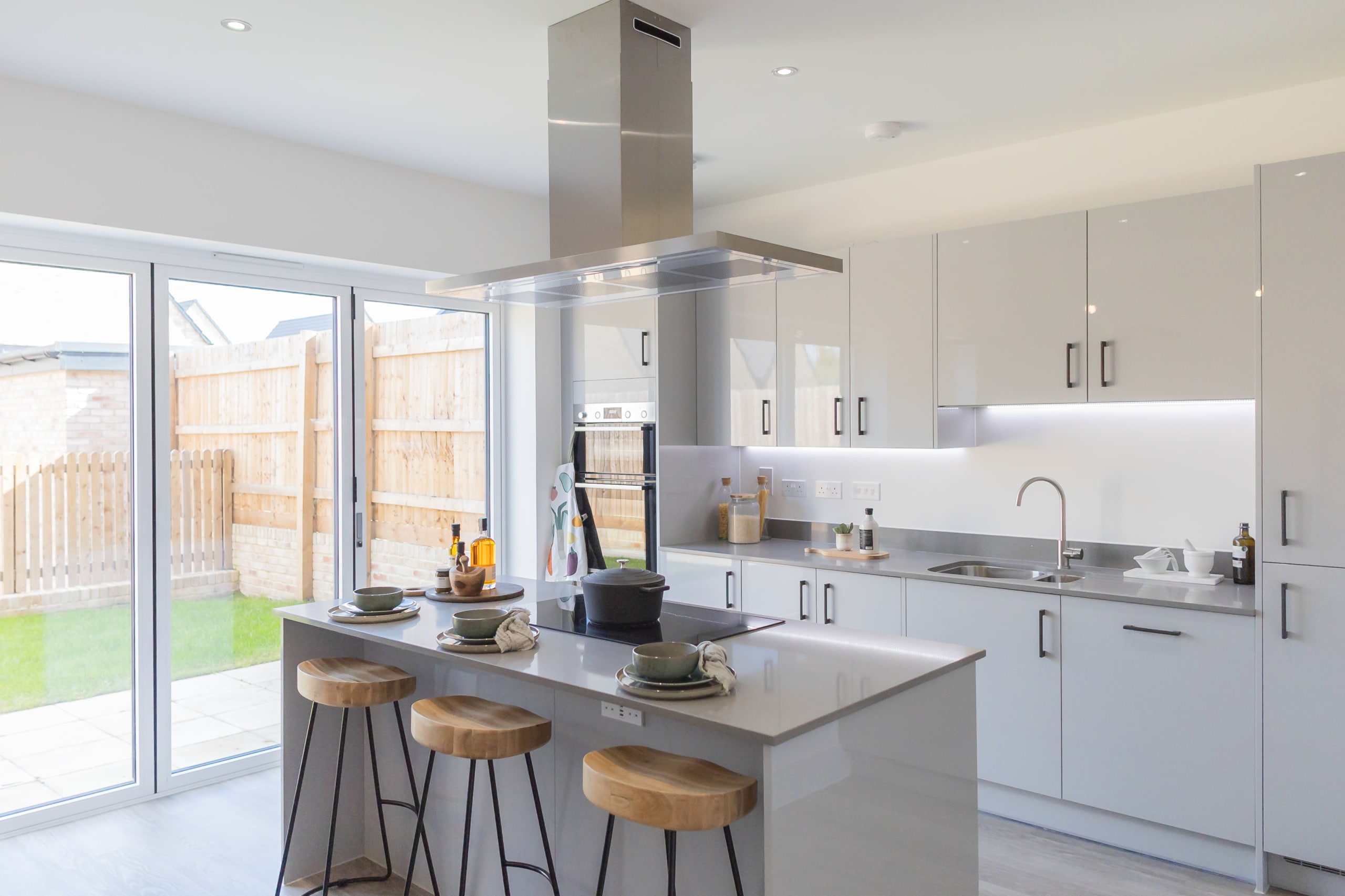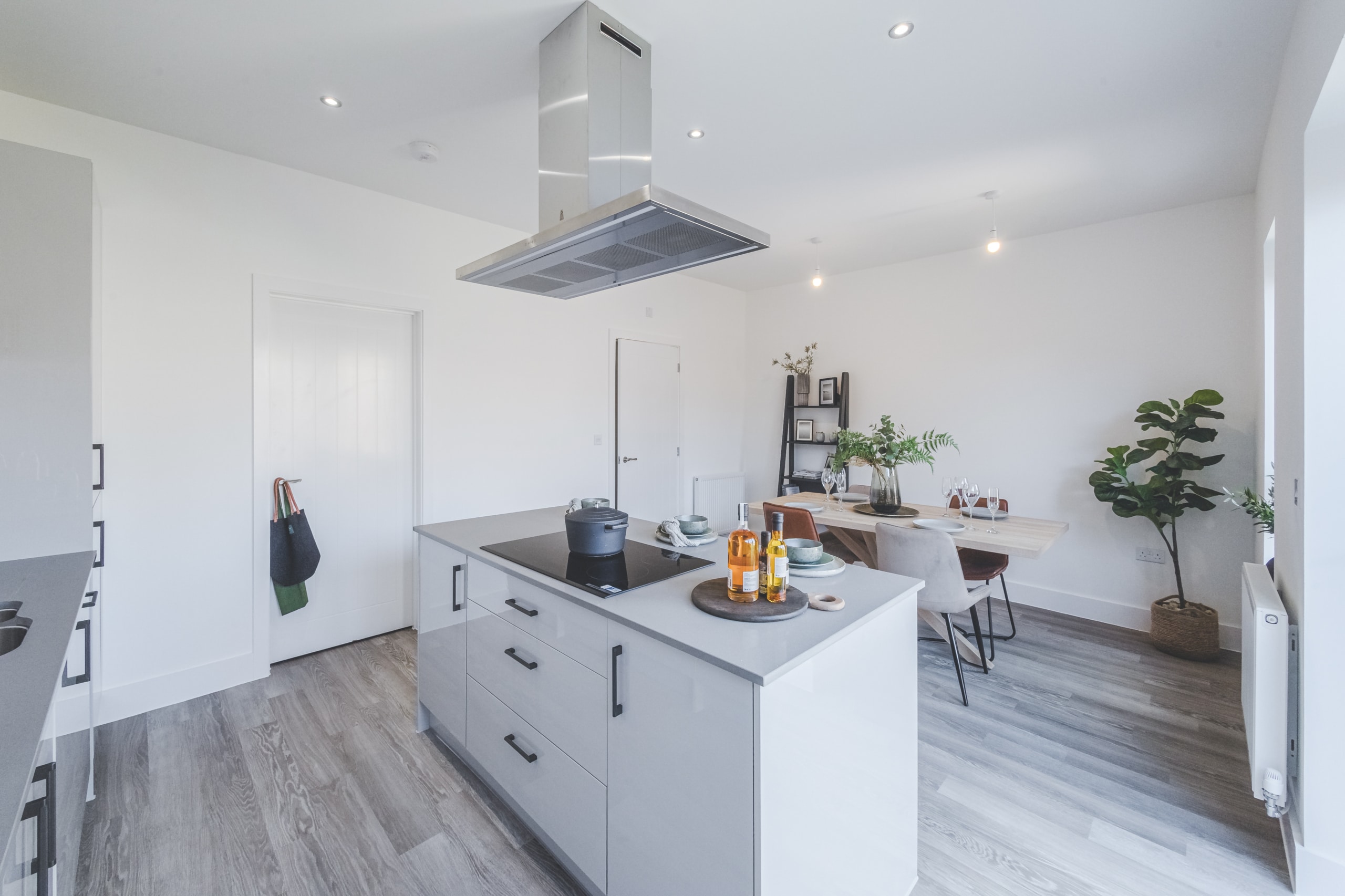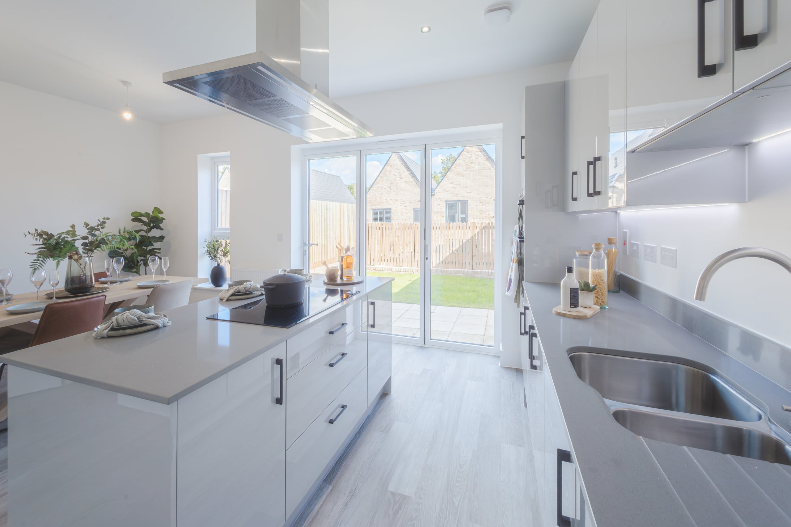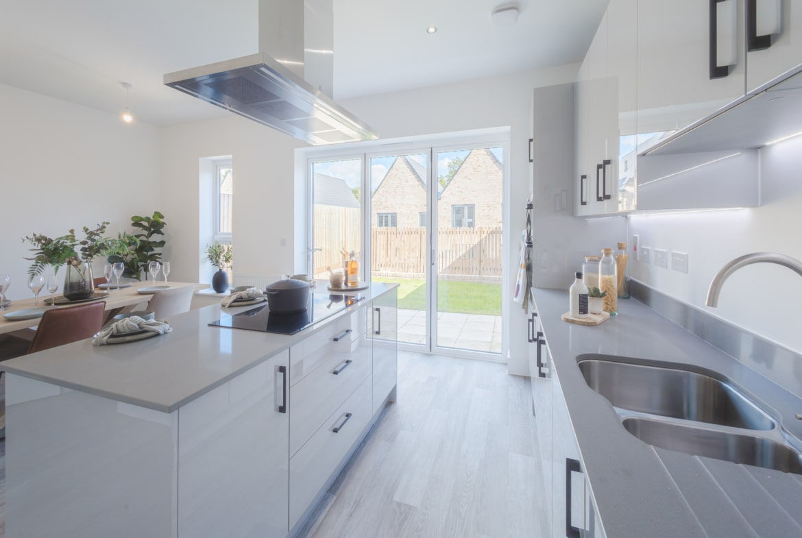 This home consists of an open-plan kitchen/dining area with bi-folding doors to the garden, as well as a separate utility room and living room downstairs.