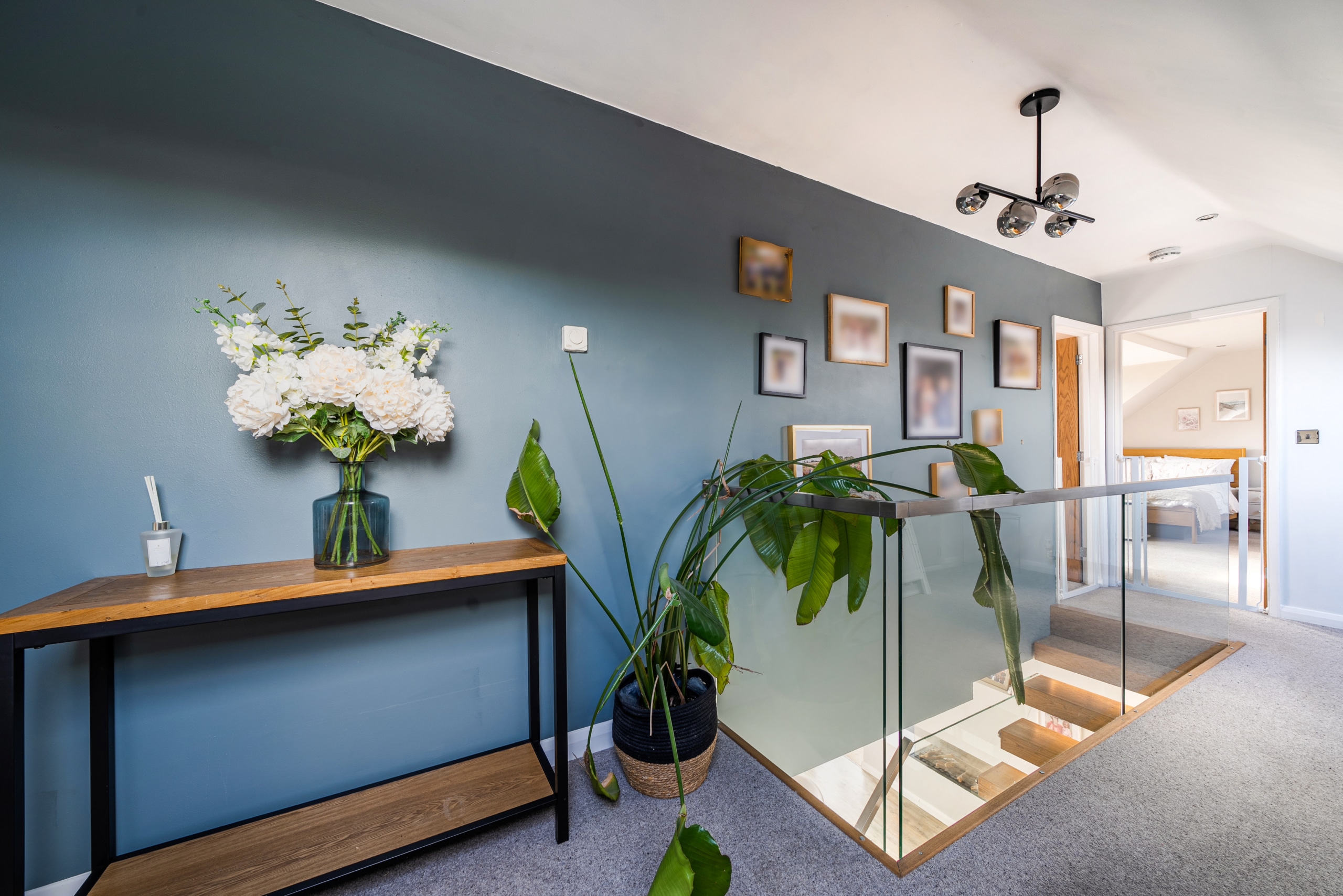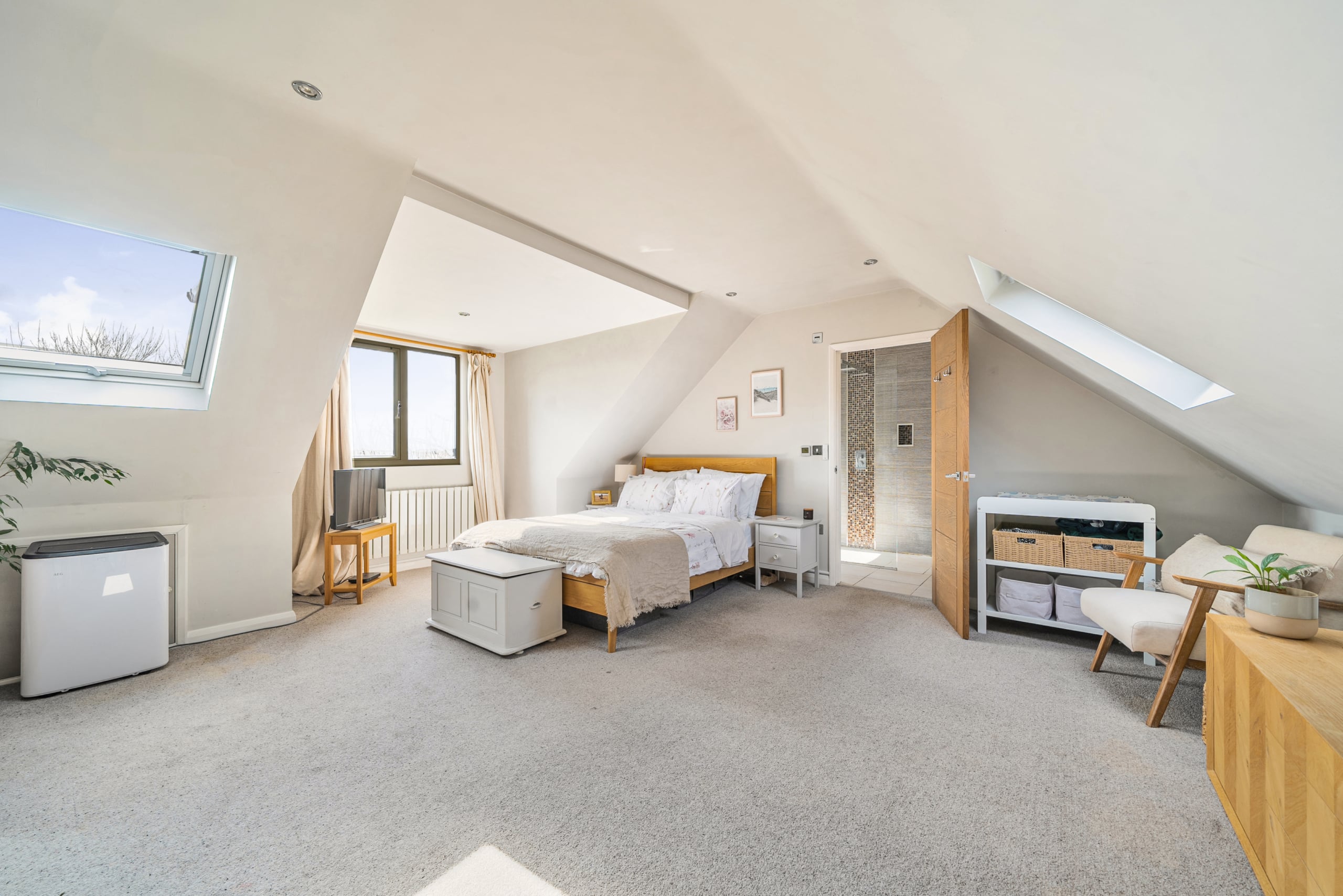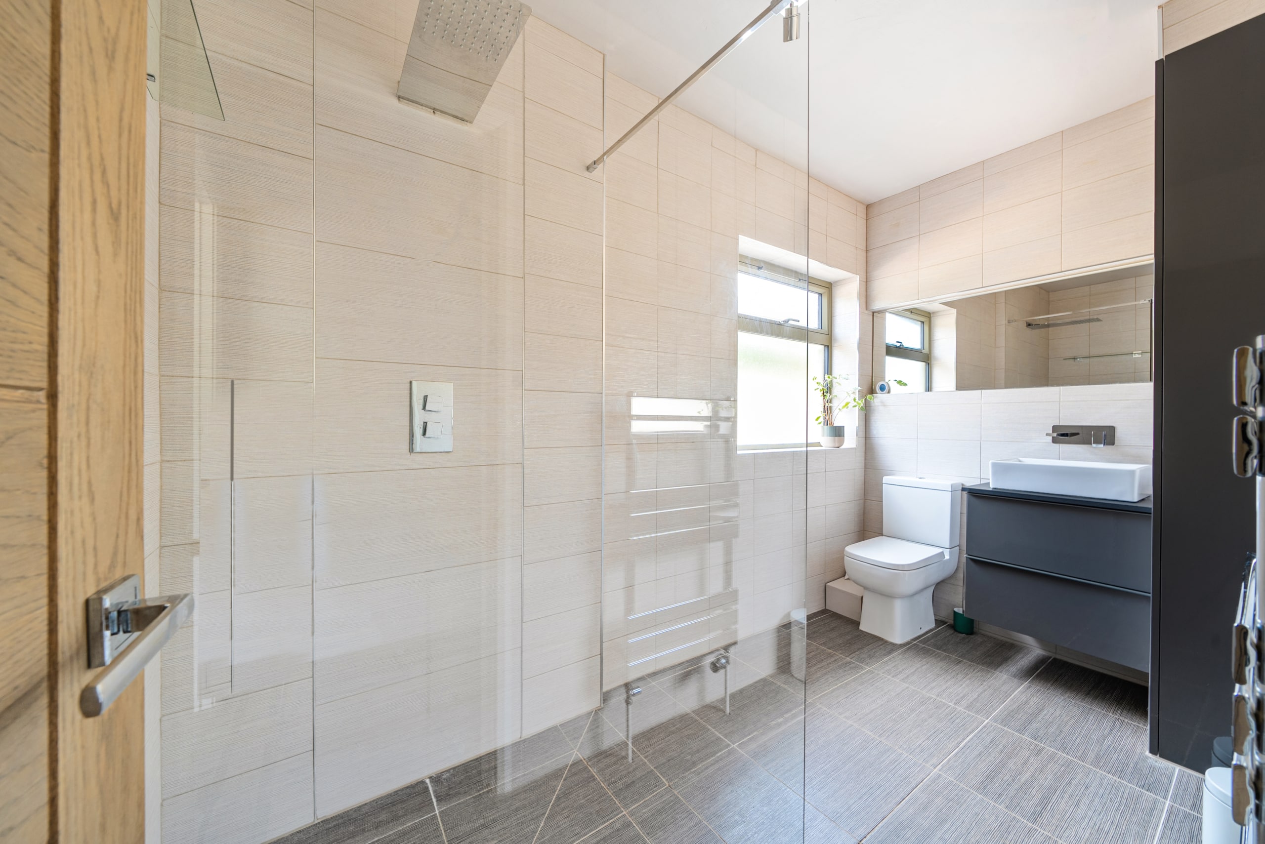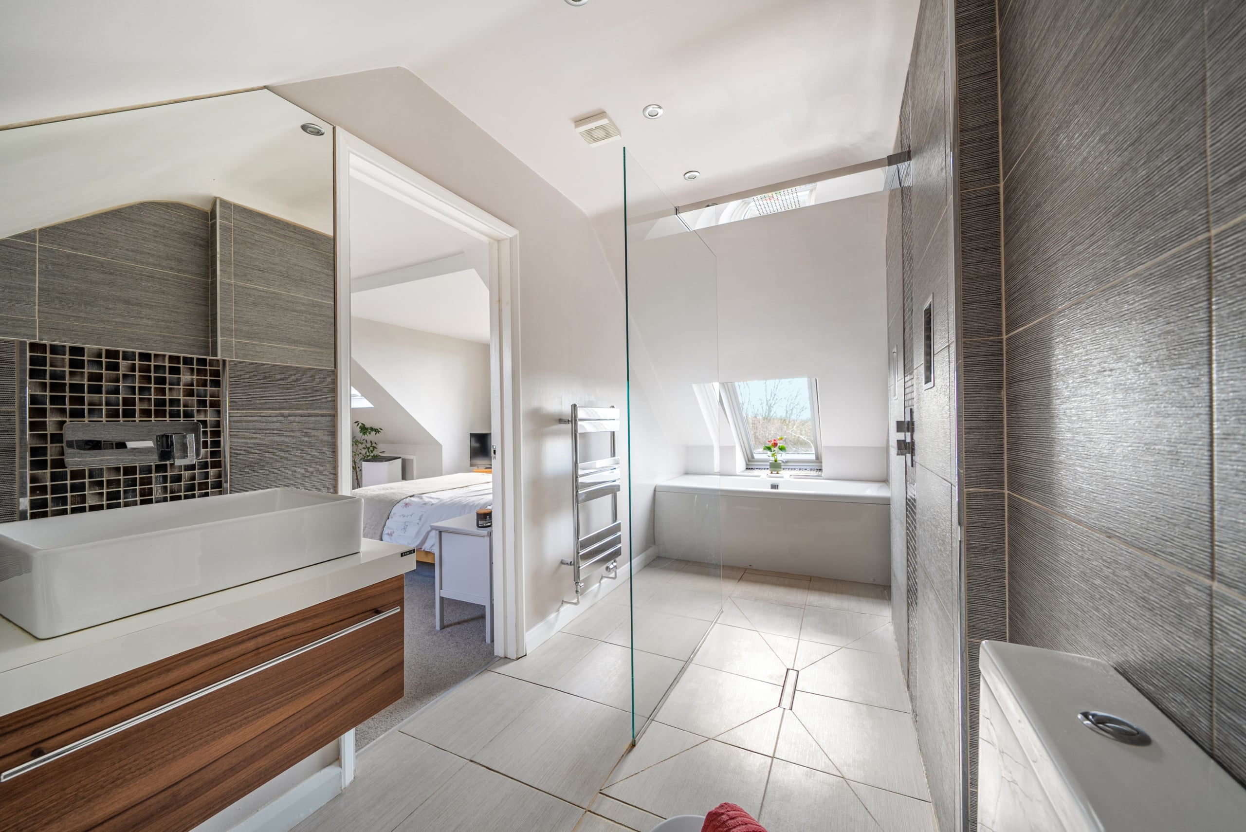The striking floating wood and glass staircase leads to the first floor, where a spacious landing connects three generous double bedrooms, all with stylish en-suite facilities. The two principal bedrooms feature bath and wet-room shower suites, while the third enjoys a sleek wet-room en-suite. All bathrooms benefit from underfloor heating for added comfort.