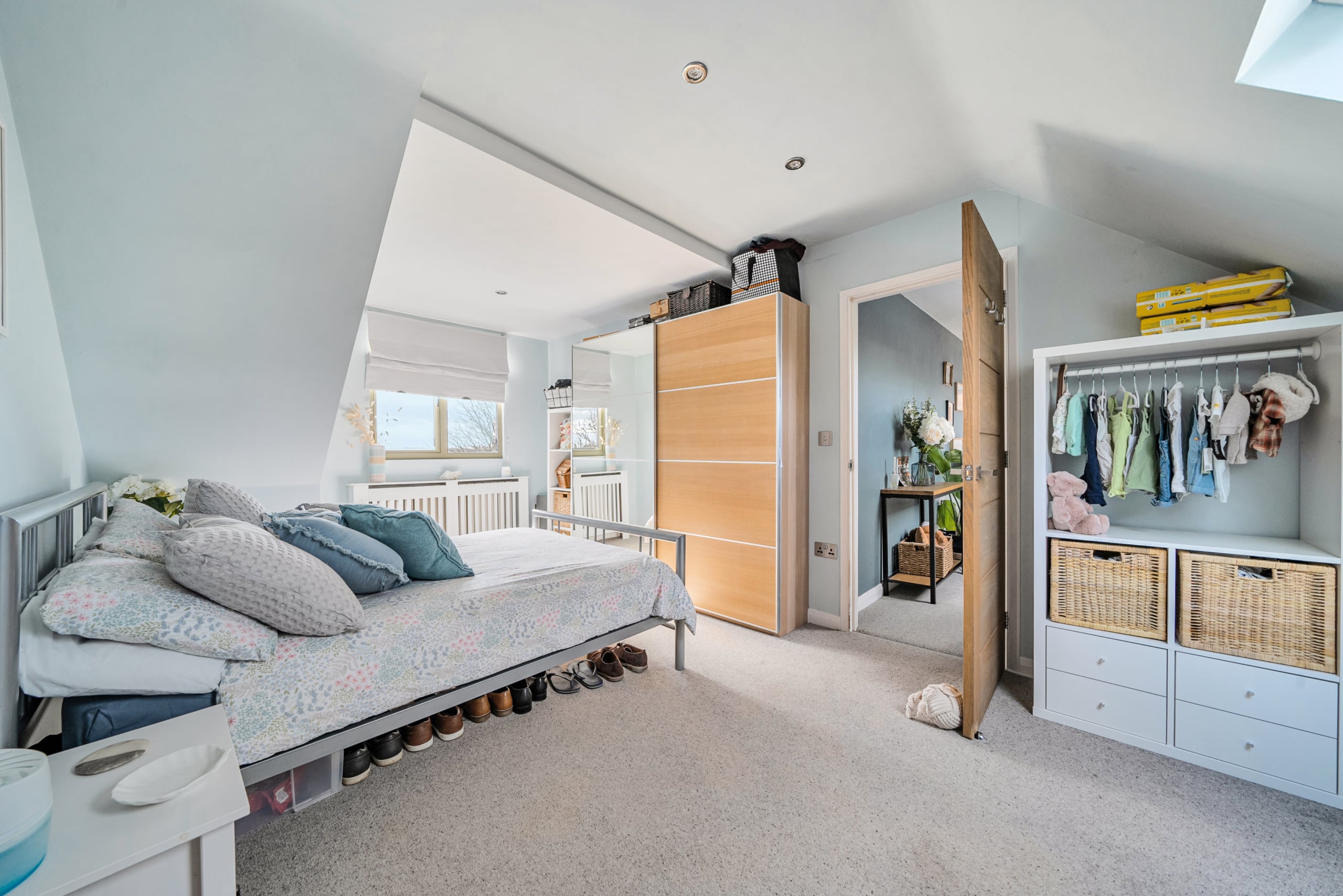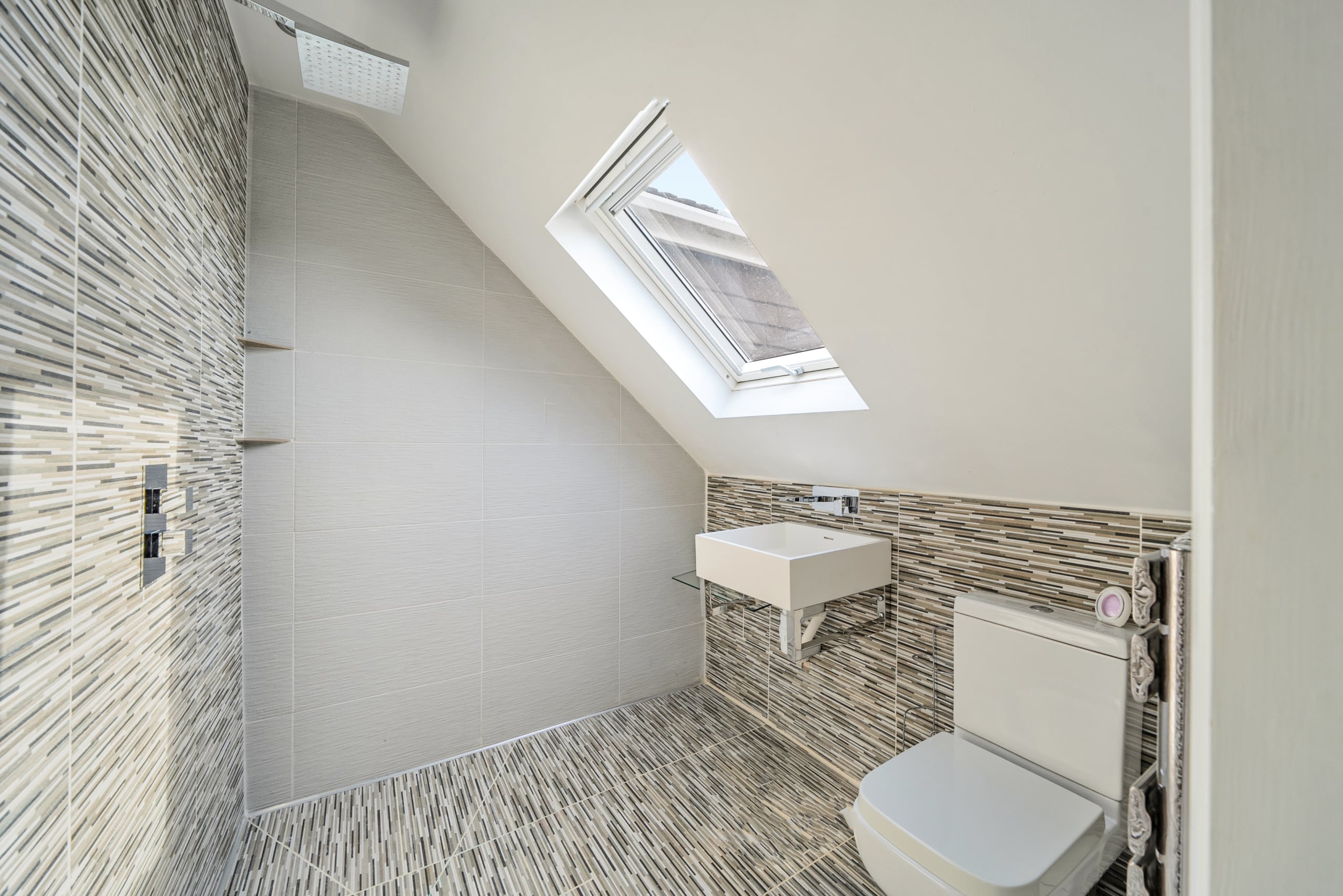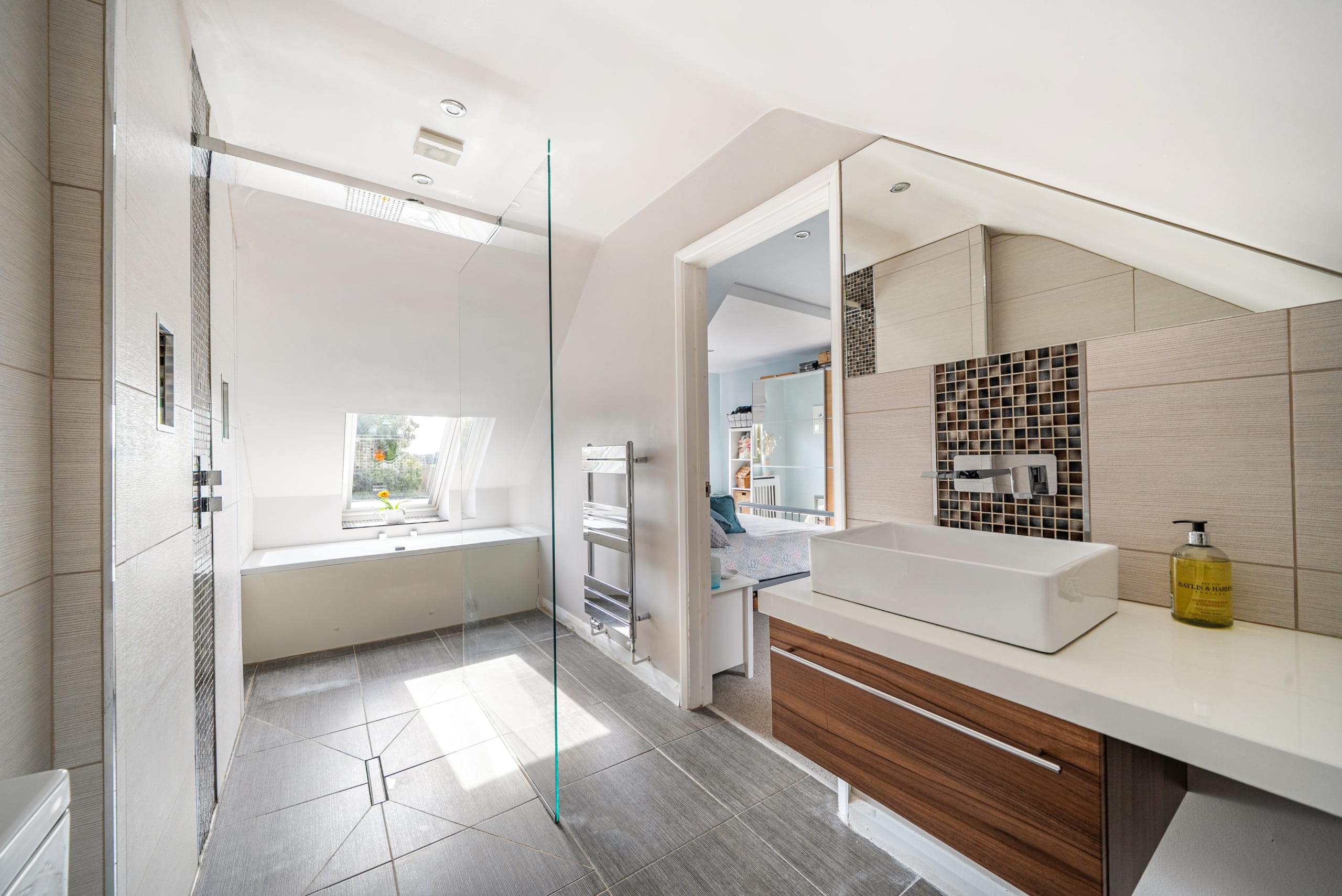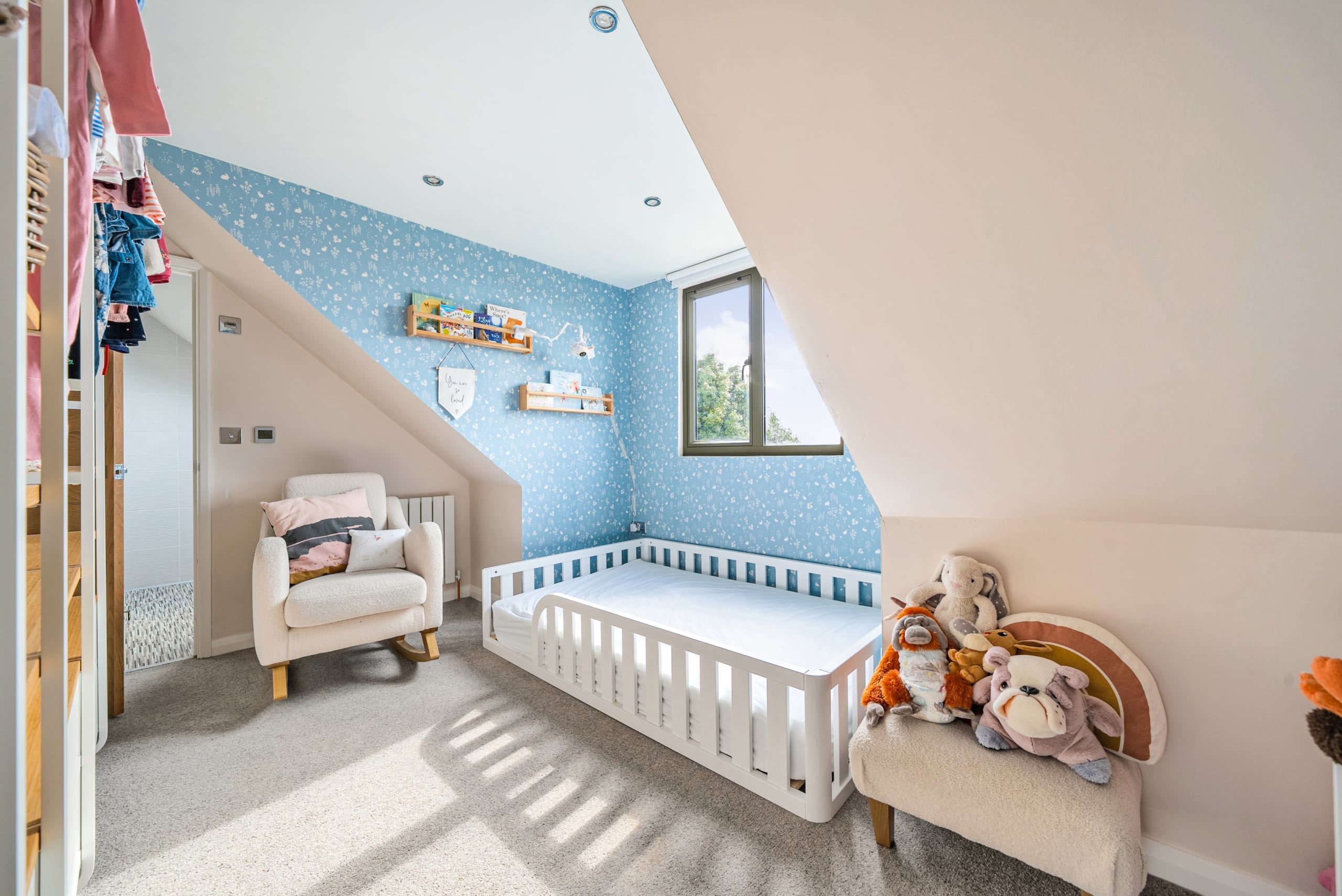 The striking floating wood and glass staircase leads to the first floor, where a spacious landing connects three generous double bedrooms, all with stylish en-suite facilities. The two principal bedrooms feature bath and wet-room shower suites, while the third enjoys a sleek wet-room en-suite. All bathrooms benefit from underfloor heating for added comfort.