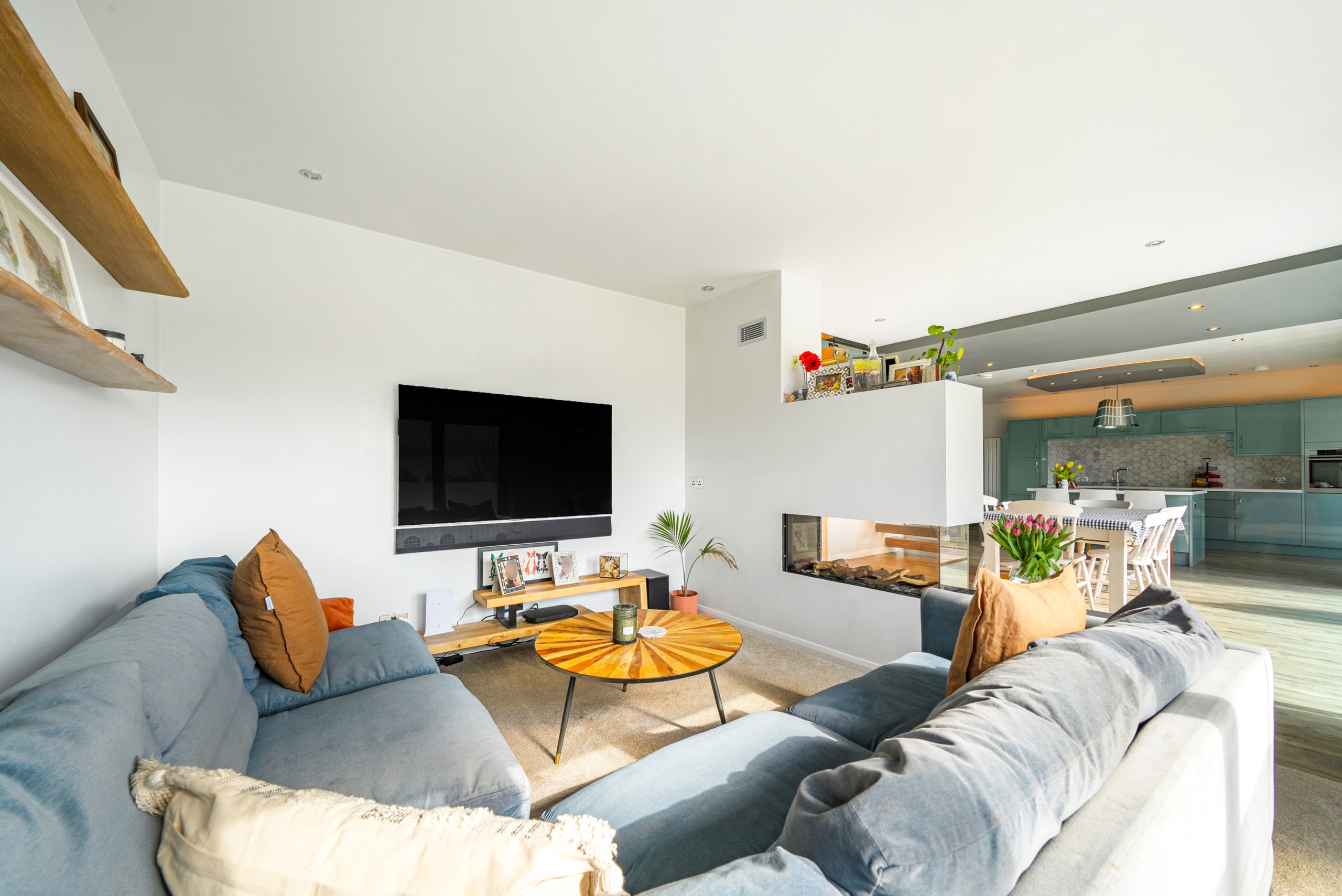 Designed for modern living, the open-plan ground floor features a vast, flexible layout with zone-controlled underfloor heating throughout all non-carpeted areas. A welcoming entrance hall leads into the heart of the home—a stunning kitchen/dining/reception space measuring 39’3″ (11.96m) x 19’4″ (5.93m), seamlessly integrating a fully fitted kitchen, dining area, TV lounge, and comfortable seating zones. Multiple south-facing bifold doors open onto an expansive composite deck, perfect for indoor-outdoor living.