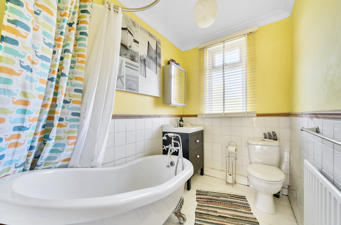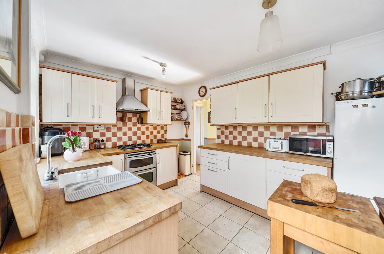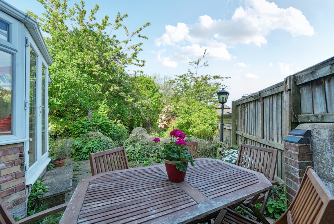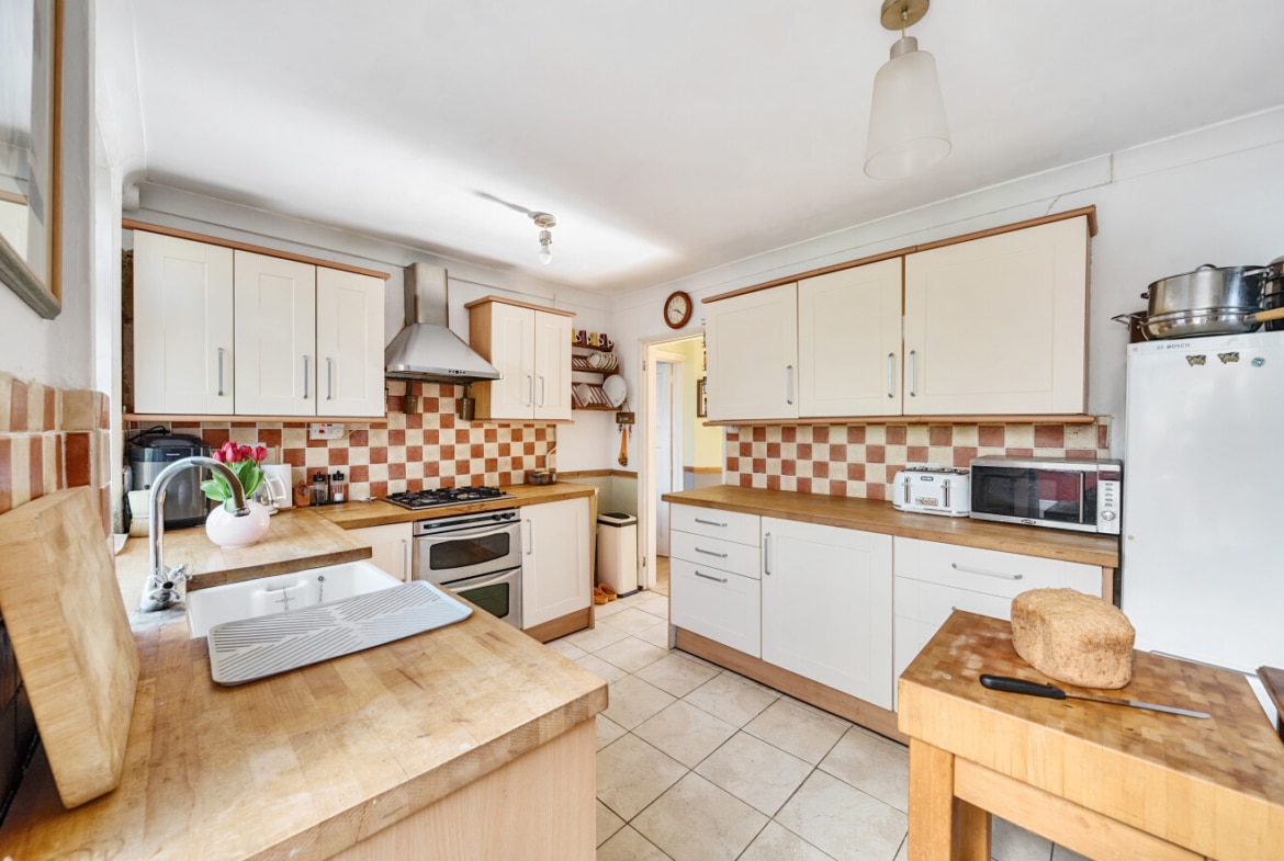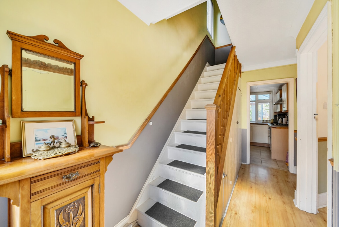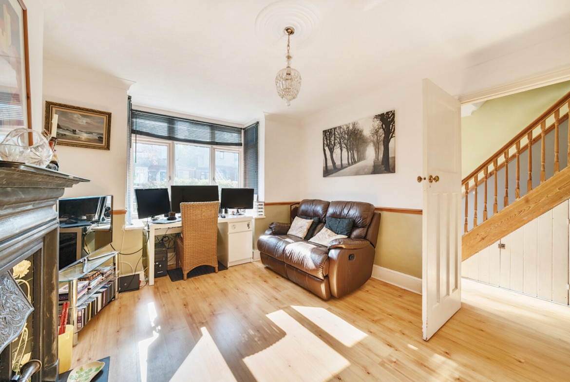 The spacious accommodation comprises: Hall, two generous Reception Rooms including Sitting Room and Dining Room, both with bay windows, 12′ fitted Kitchen and large PVCu Conservatory, which overlooks the mature Rear Garden. With the Three Bedrooms and Bathroom with roll top bath, to the first floor.