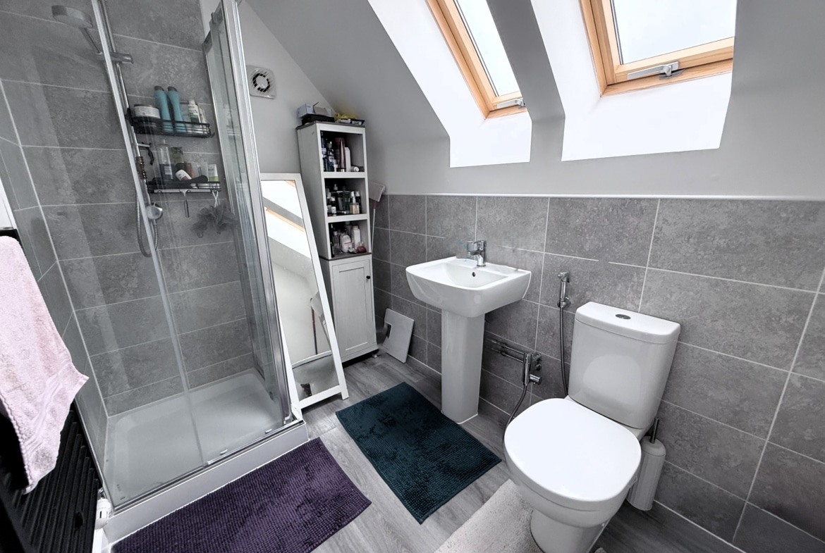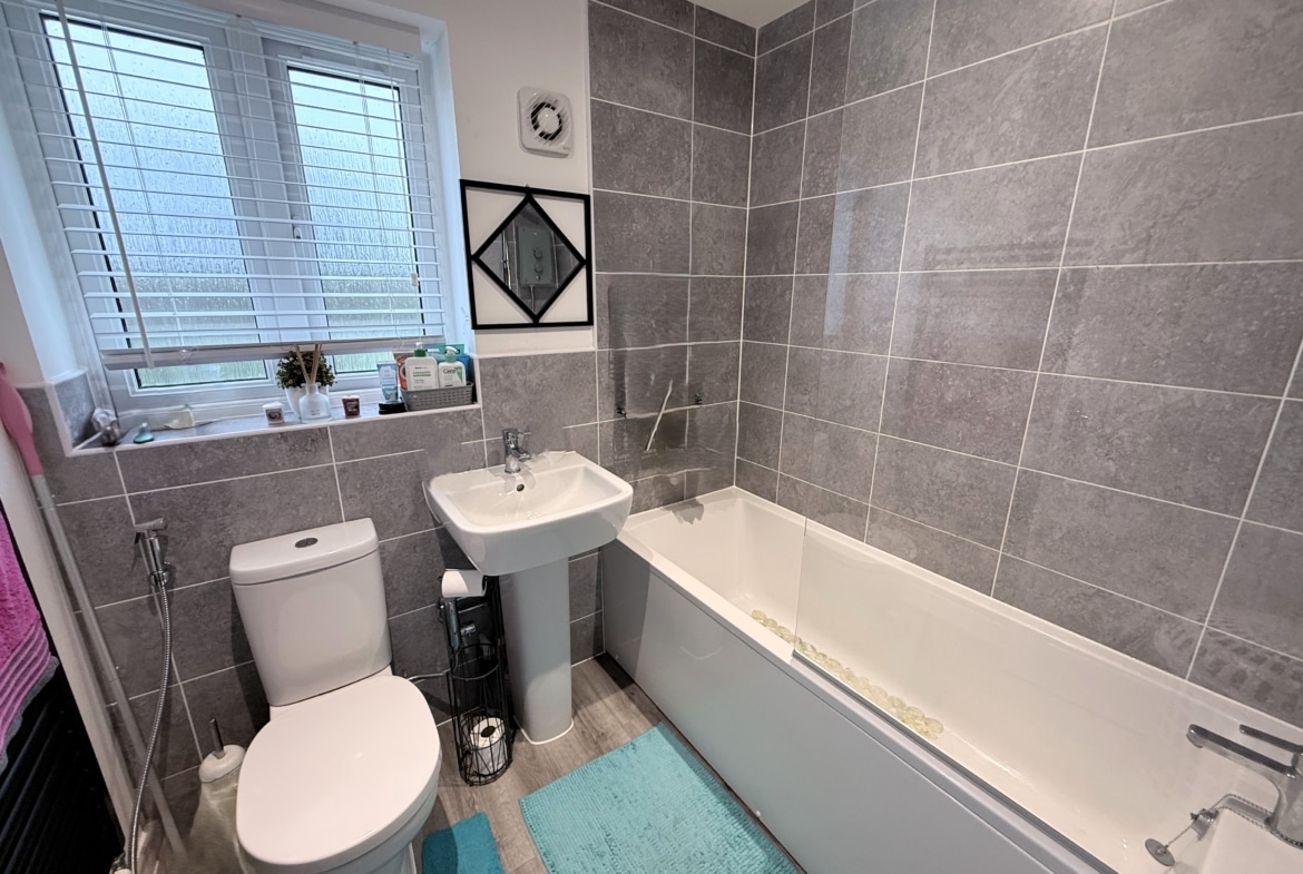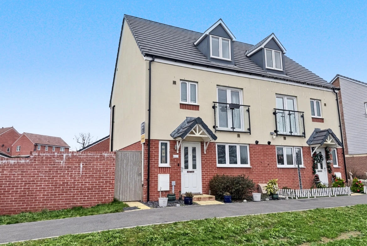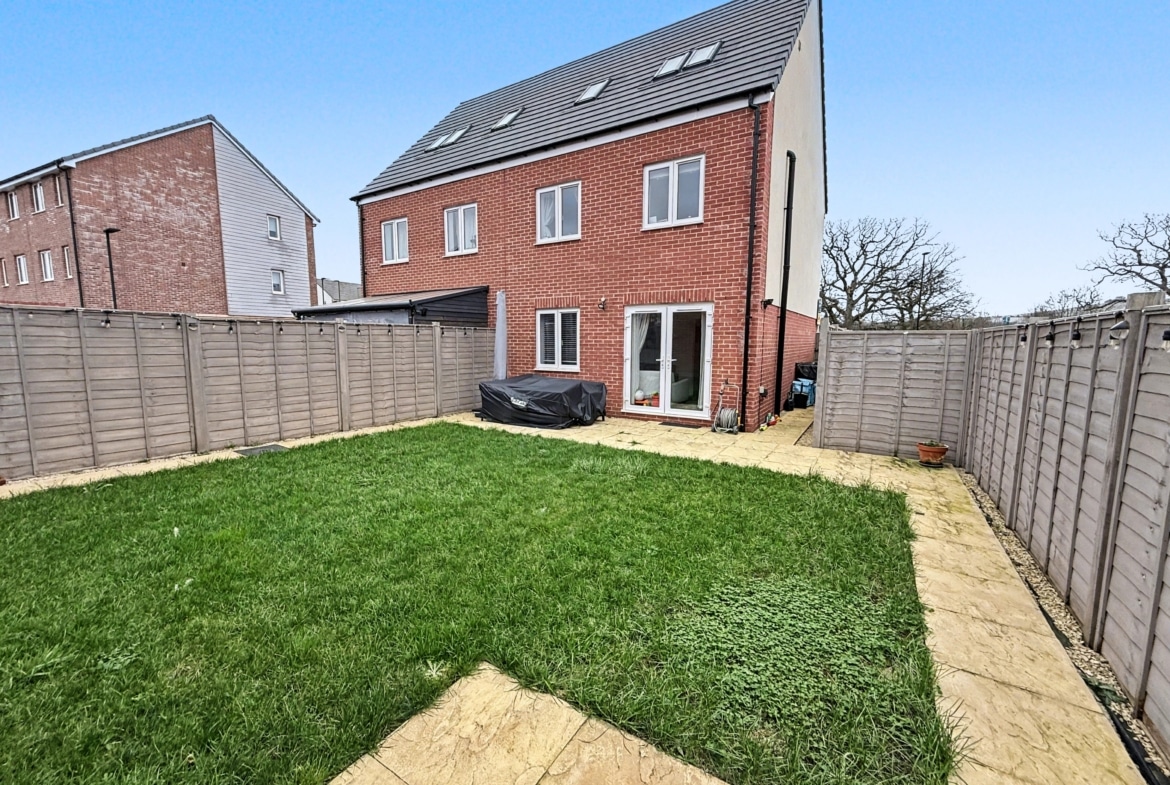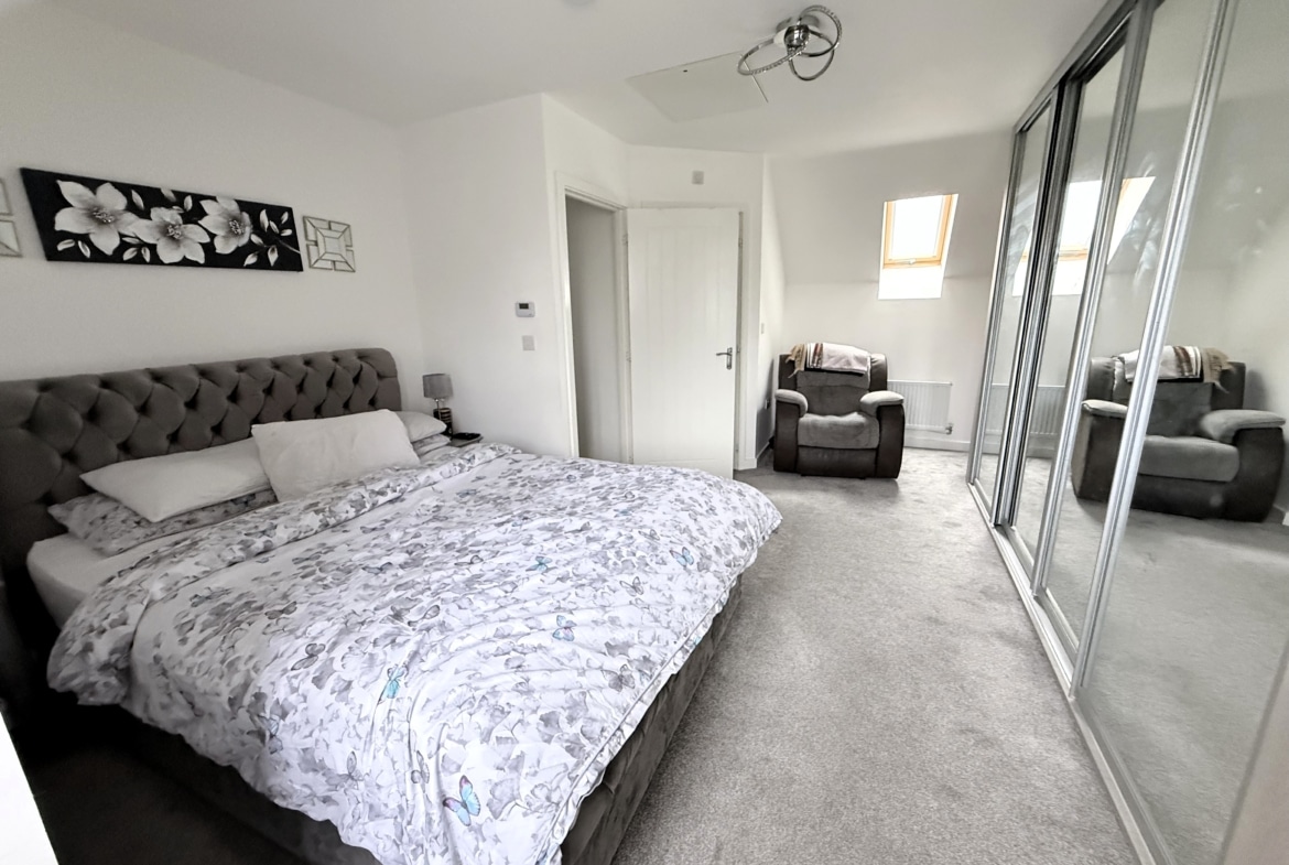 The deceptively spacious accommodation offers nearly 1200sqft of living space, which comprises: Hall, Cloakroom, fitted 15′ Kitchen/Dining Room and 16′ Sitting Room with PVCu double doors opening into the pleasant Rear Garden. To the first floor, you’ll find three of the Bedrooms with ‘Juliette’ balcony leading out from the third Bedroom, as well as the Family Bathroom, with white three piece suite. With additional built-in wardrobes to both Bedroom Two & Three. With an impressive 19′ Master Bedroom with fitted wardrobes and En-suite Shower Room, to the top floor.