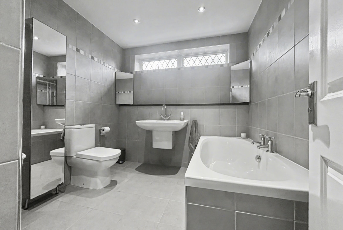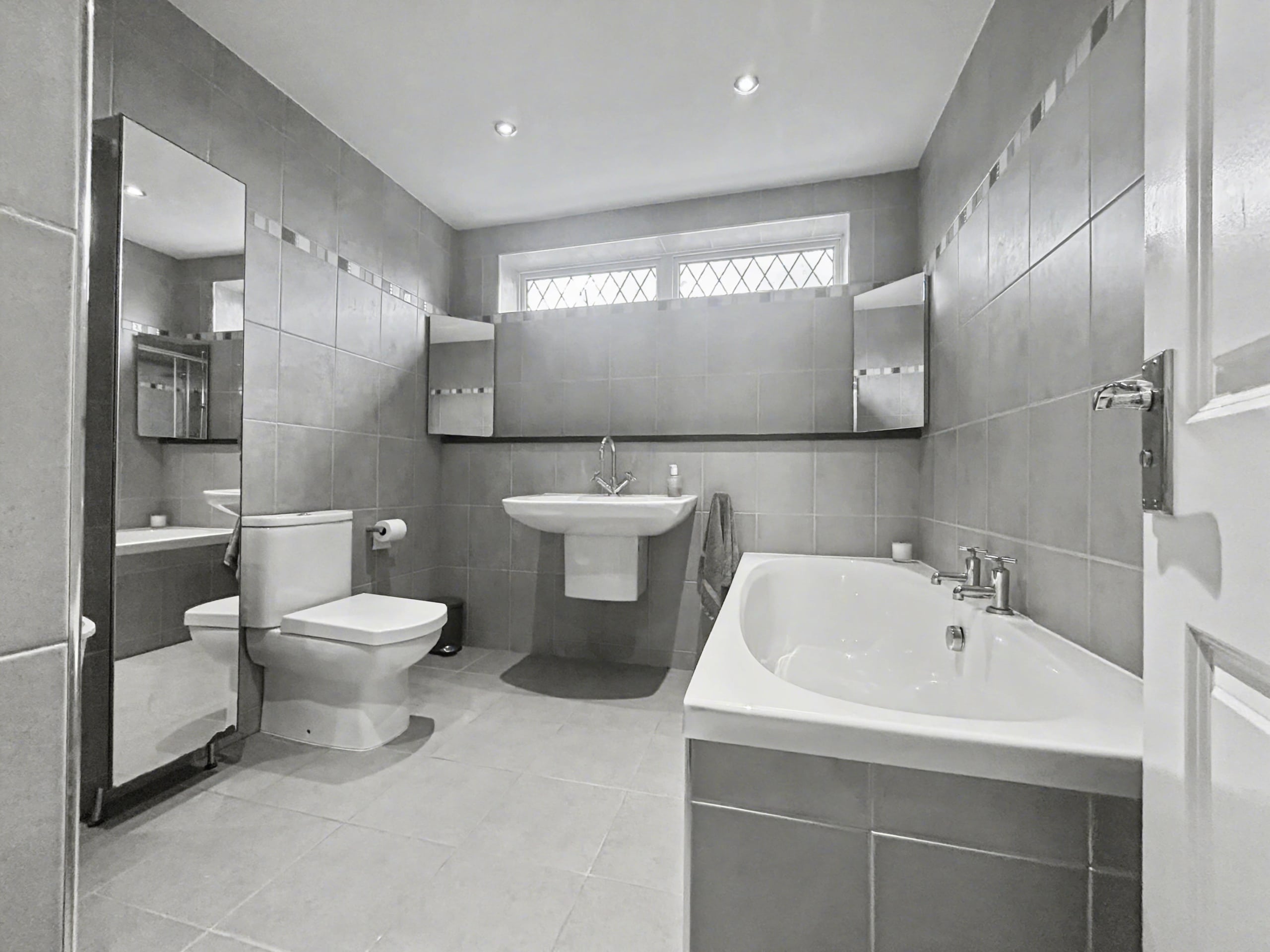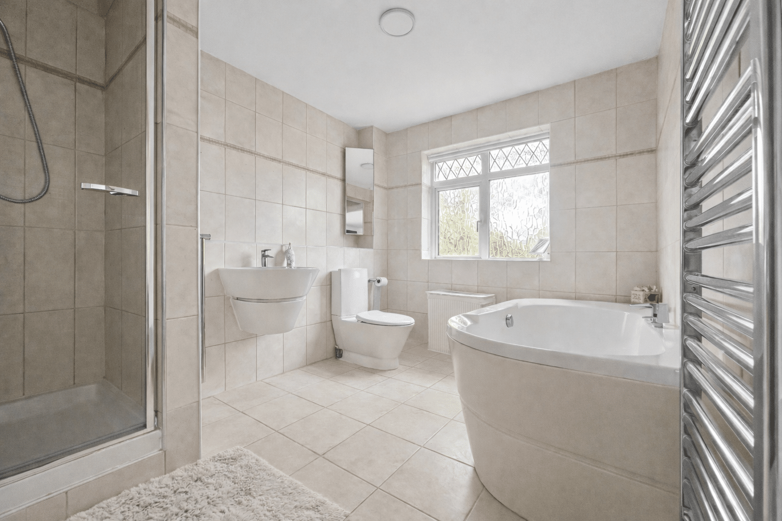 Upstairs, a spacious landing provides access to all rooms and includes an airing cupboard housing a gas-fired Worcester Bosch boiler. The principal bedroom features a stylish four-piece en-suite bathroom and a walk-in wardrobe. There are three further well-proportioned bedrooms, along with a large family bathroom fitted with a four-piece suite, including a separate bath and shower.