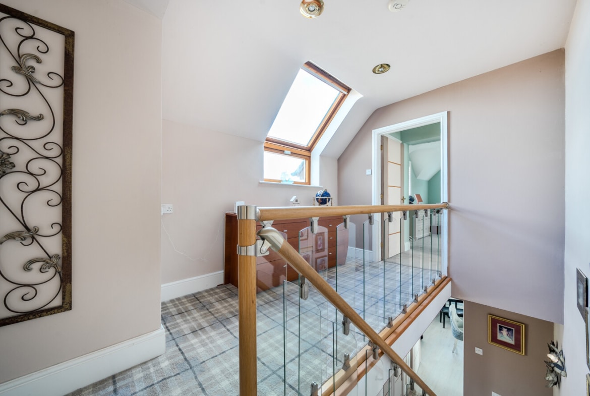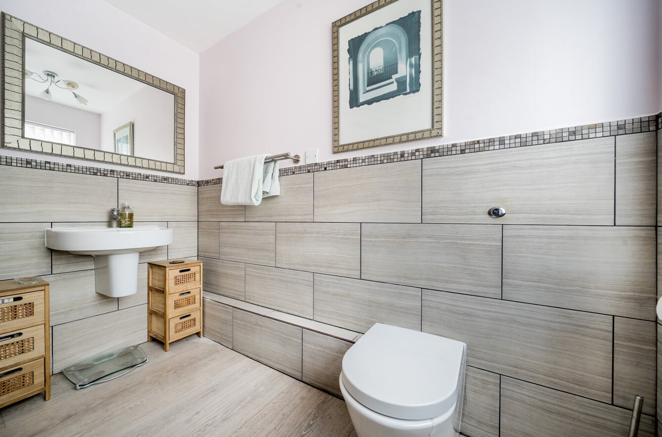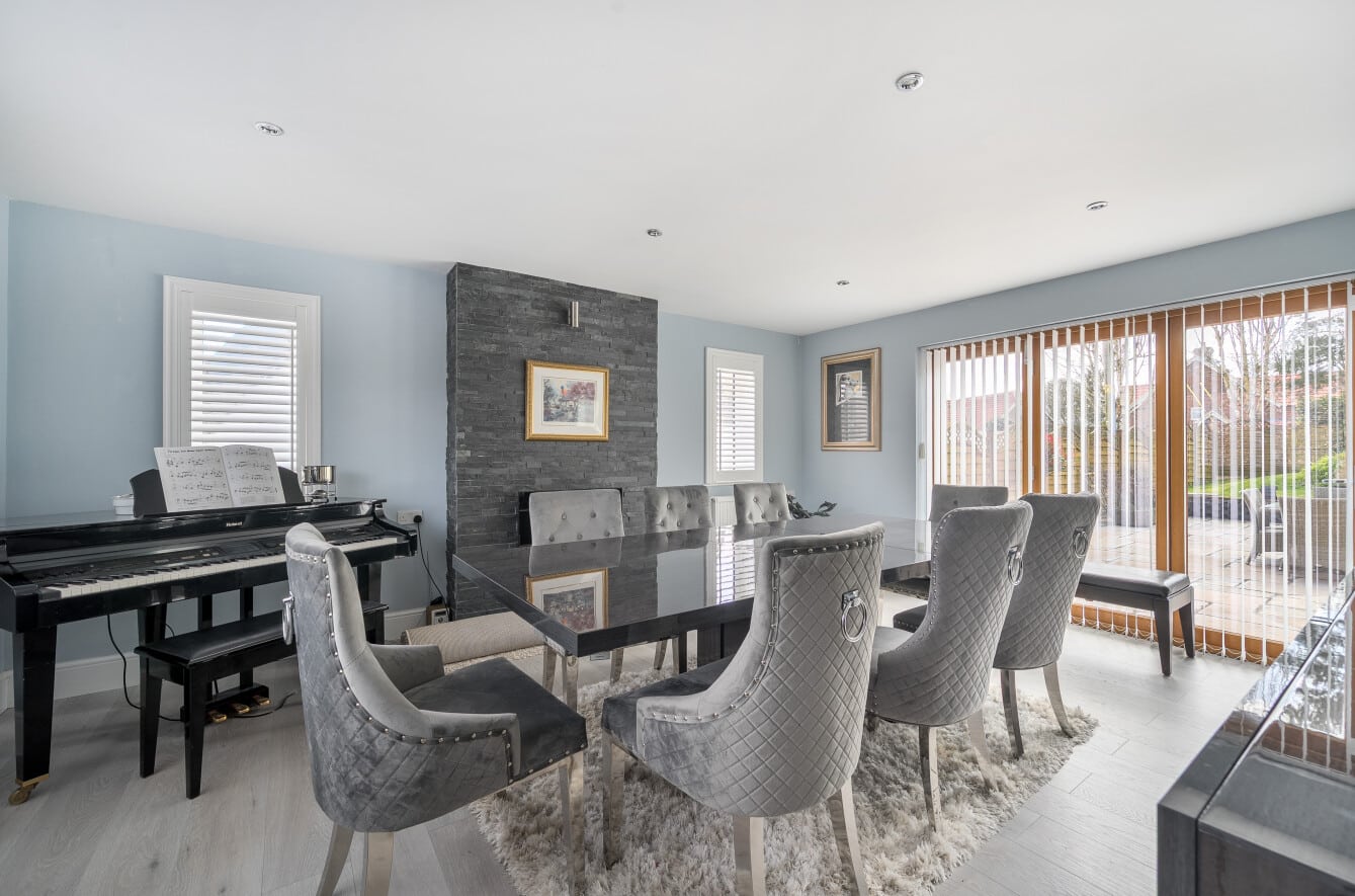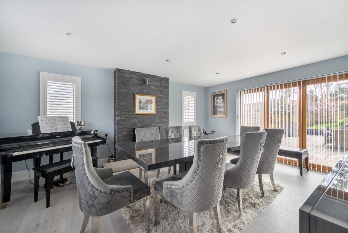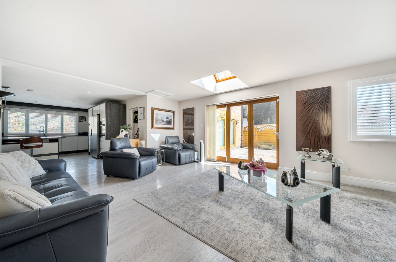 The ground floor is thoughtfully laid out, with a large and welcoming entrance hallway setting the tone for the rest of the home. Leading to the right is a large open plan living space complete with impressive kitchen/breakfast room. While leading to the left is a separate reception room used as a formal dining area. Both rooms benefit from double doors leading out to a courtyard, creating a seamless connection between indoor and outdoor spaces—perfect for modern inside-outside living. A useful utility room and ground floor cloakroom add further practicality.