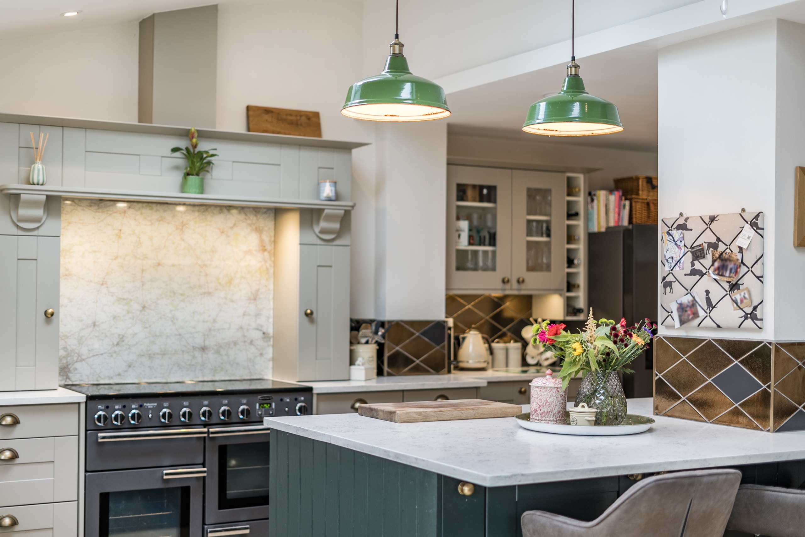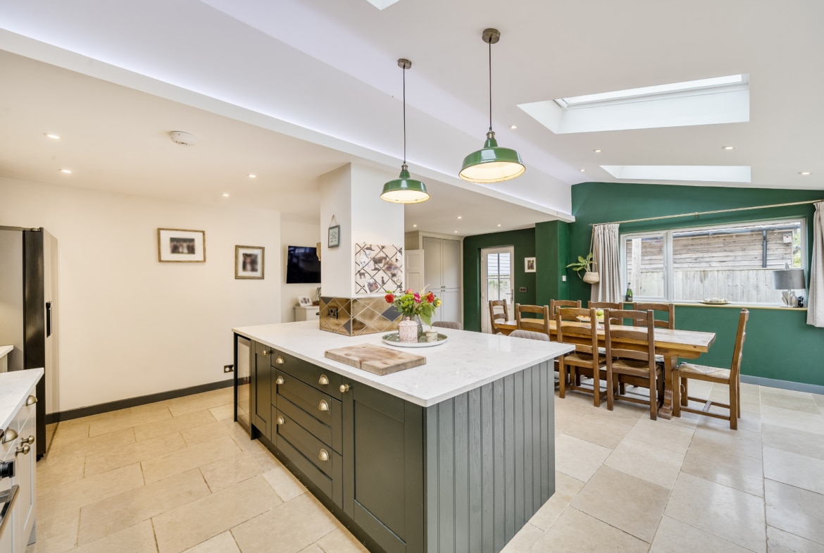 The show-stopping kitchen/dining area is the true heart of the home. Filled with natural light from skylights and bifold doors, it features striking cabinetry, stunning antique brass fixtures, and a design that allows the outdoors to seamlessly flow in—ideal for entertaining or family gatherings.