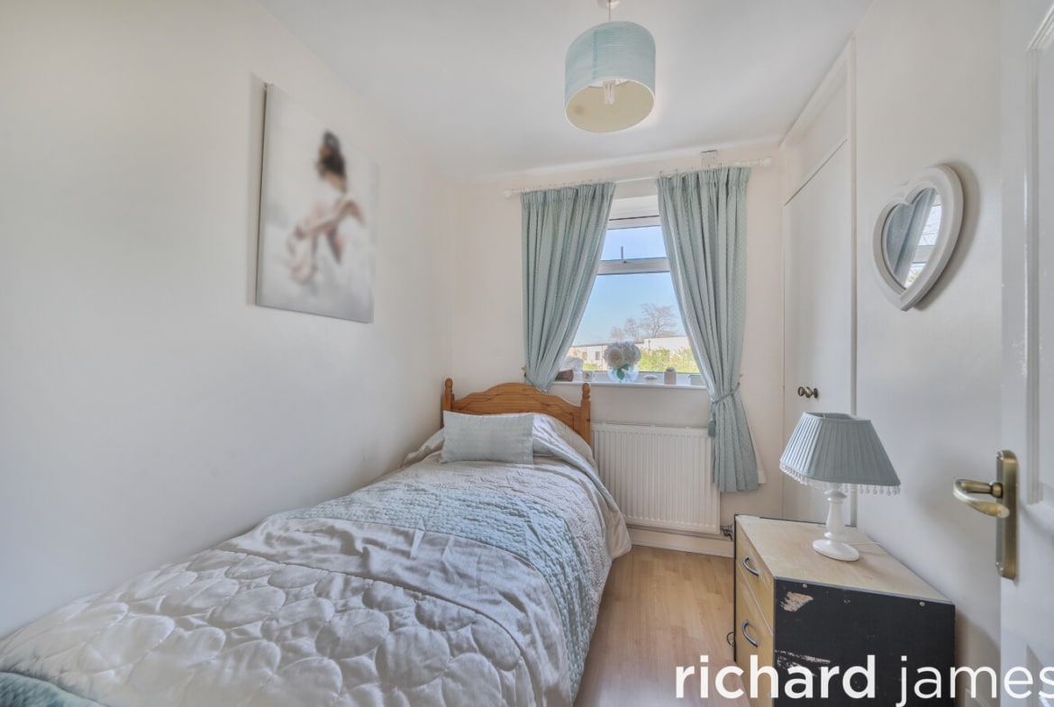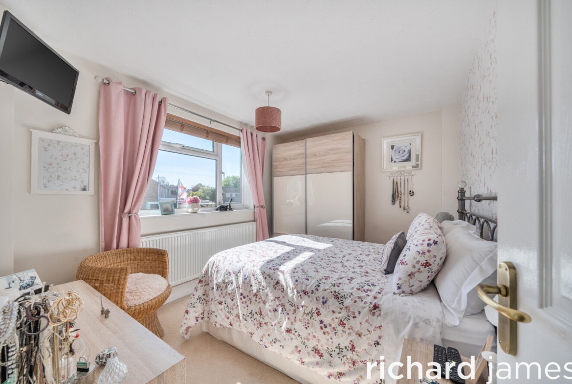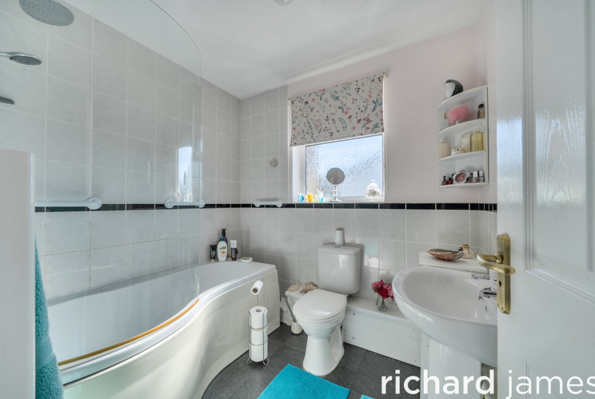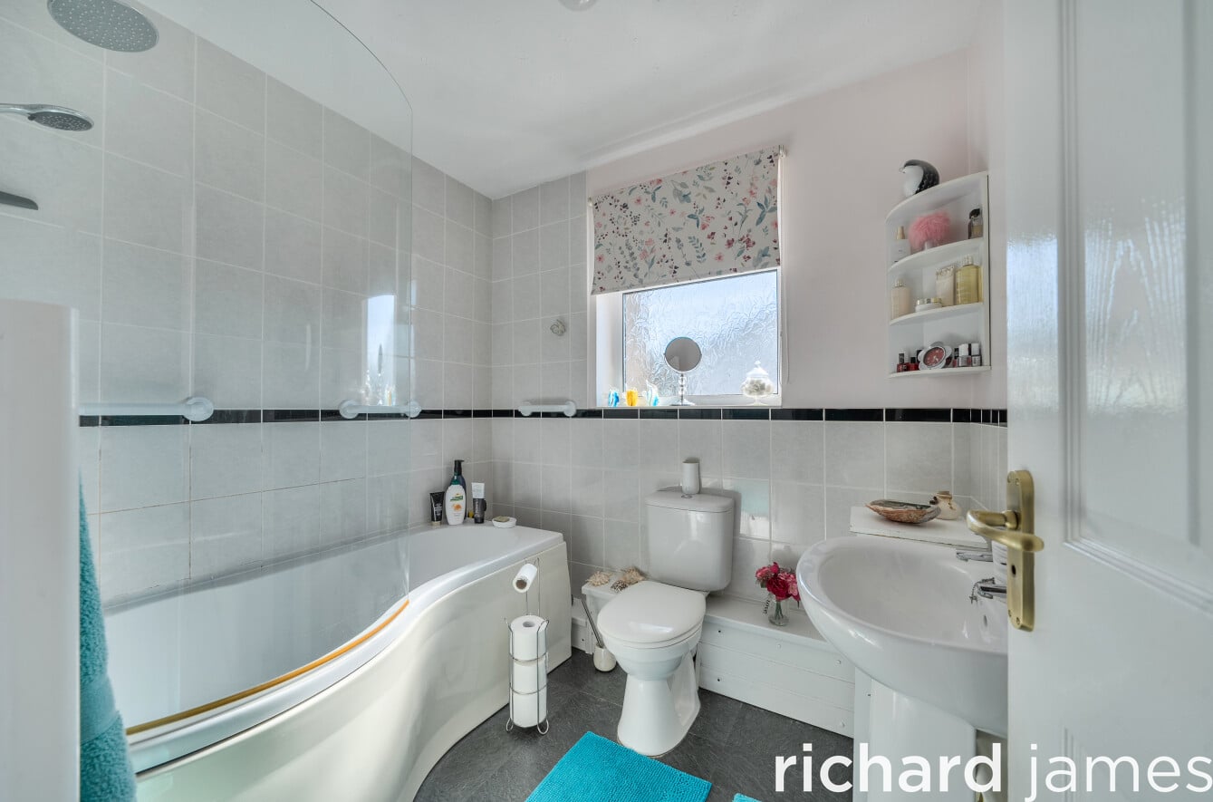 Upstairs, three bedrooms are served by a refitted white bathroom suite, WC and wash hand basin. The principal bedroom sits to the front and is a comfortable double, with two further bedrooms to the rear, one of which has a built-in cupboard.