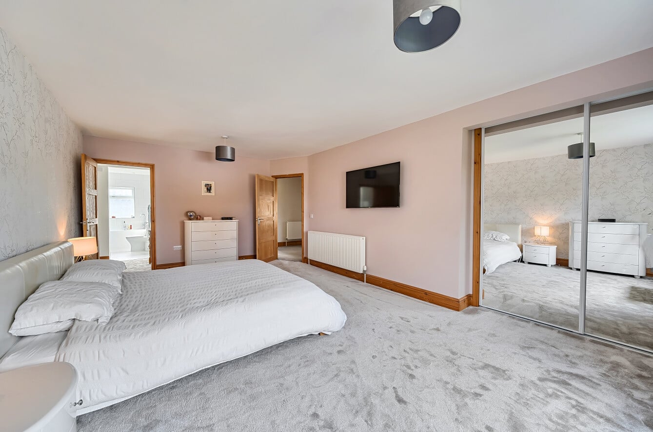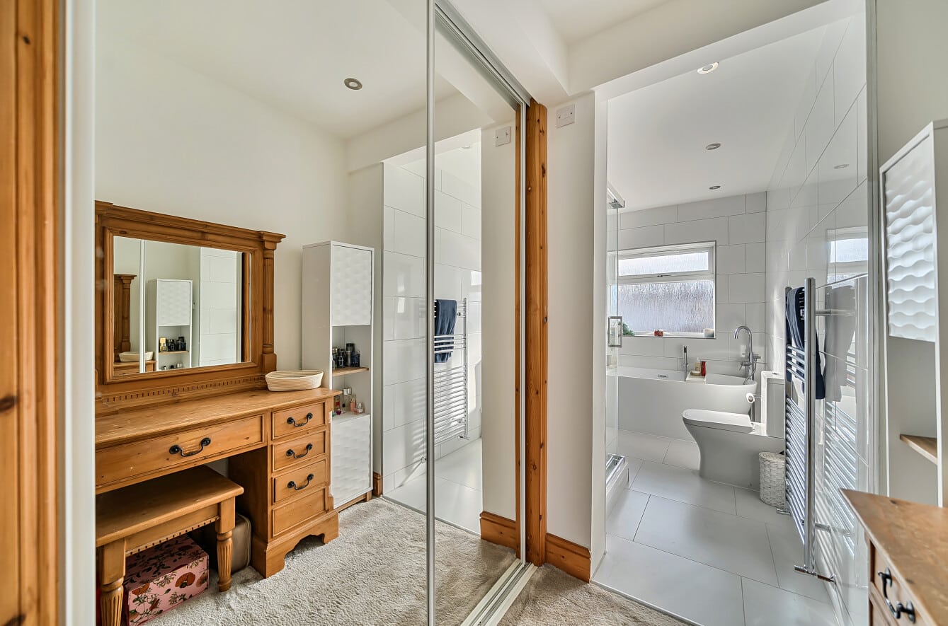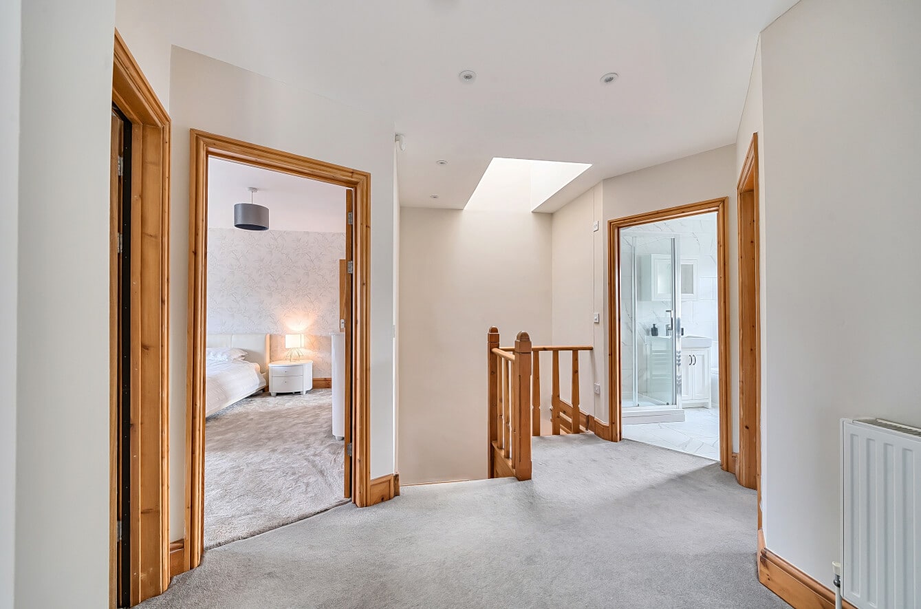 To the first floor, a generous landing leads to the spacious master suite, complete with a 19′ Bedroom, Dressing Room with fitted wardrobes and refitted modern En-suite Bathroom with underfloor heating. There are two further double Bedrooms and a refitted four-piece Family Bathroom, also with underfloor heating.