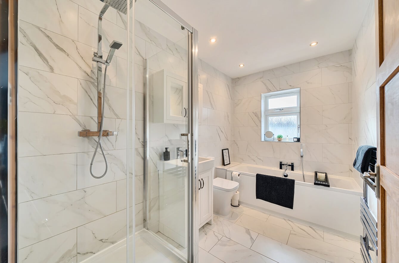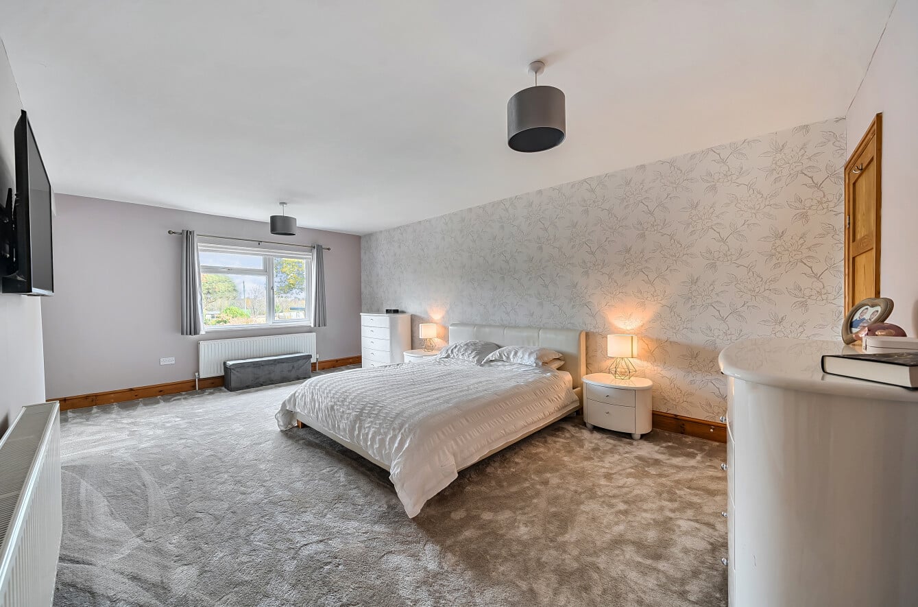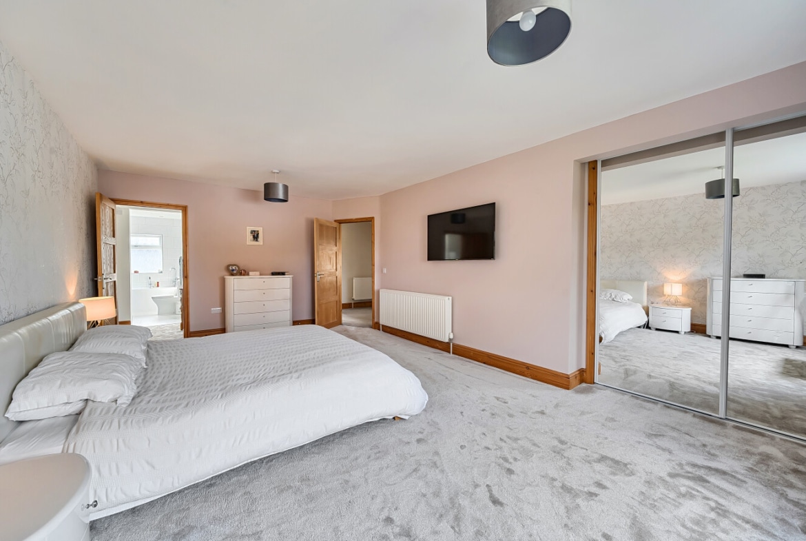 To the first floor, a generous landing leads to the spacious master suite, complete with a 19′ Bedroom, Dressing Room with fitted wardrobes and refitted modern En-suite Bathroom with underfloor heating. There are two further double Bedrooms and a refitted four-piece Family Bathroom, also with underfloor heating.