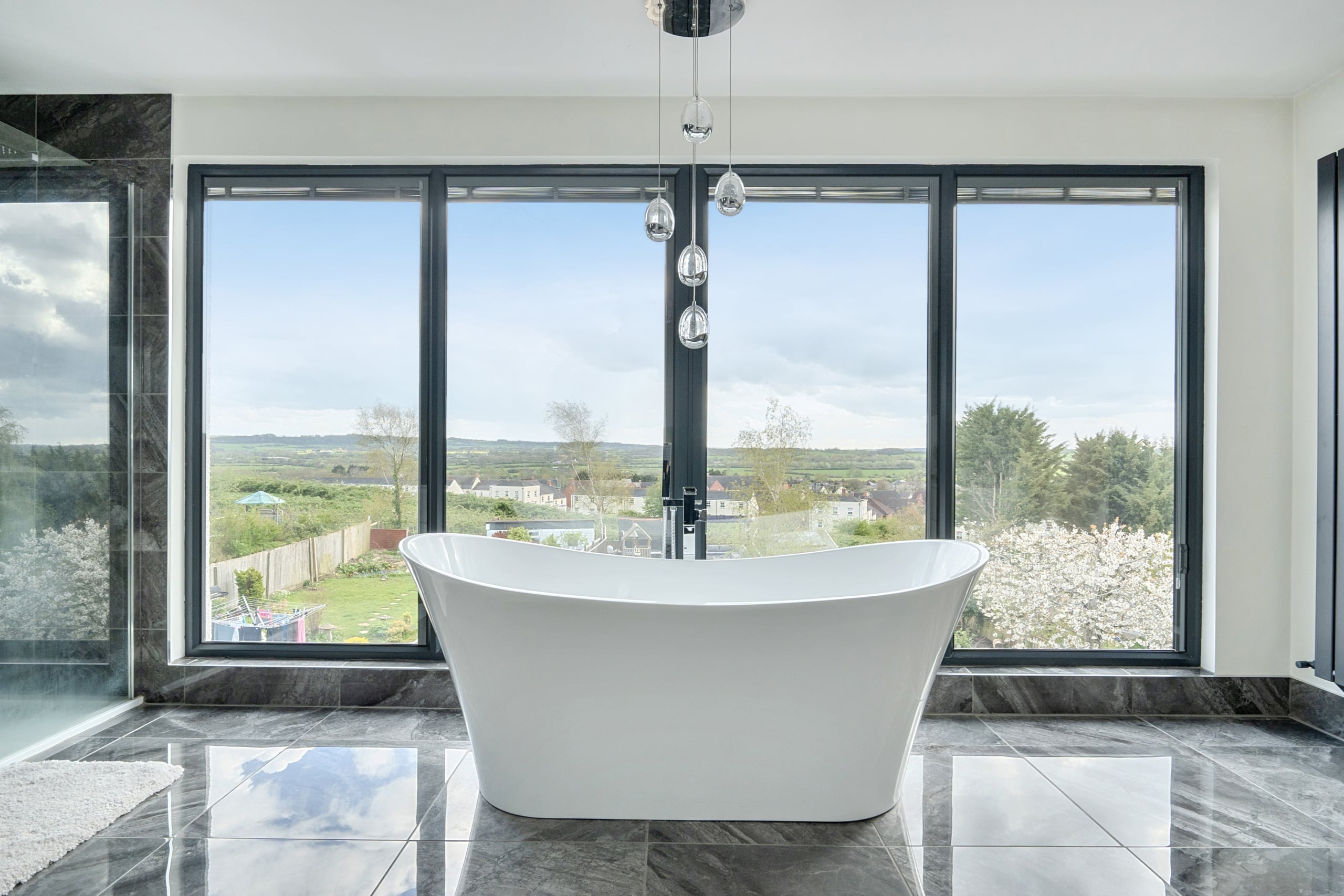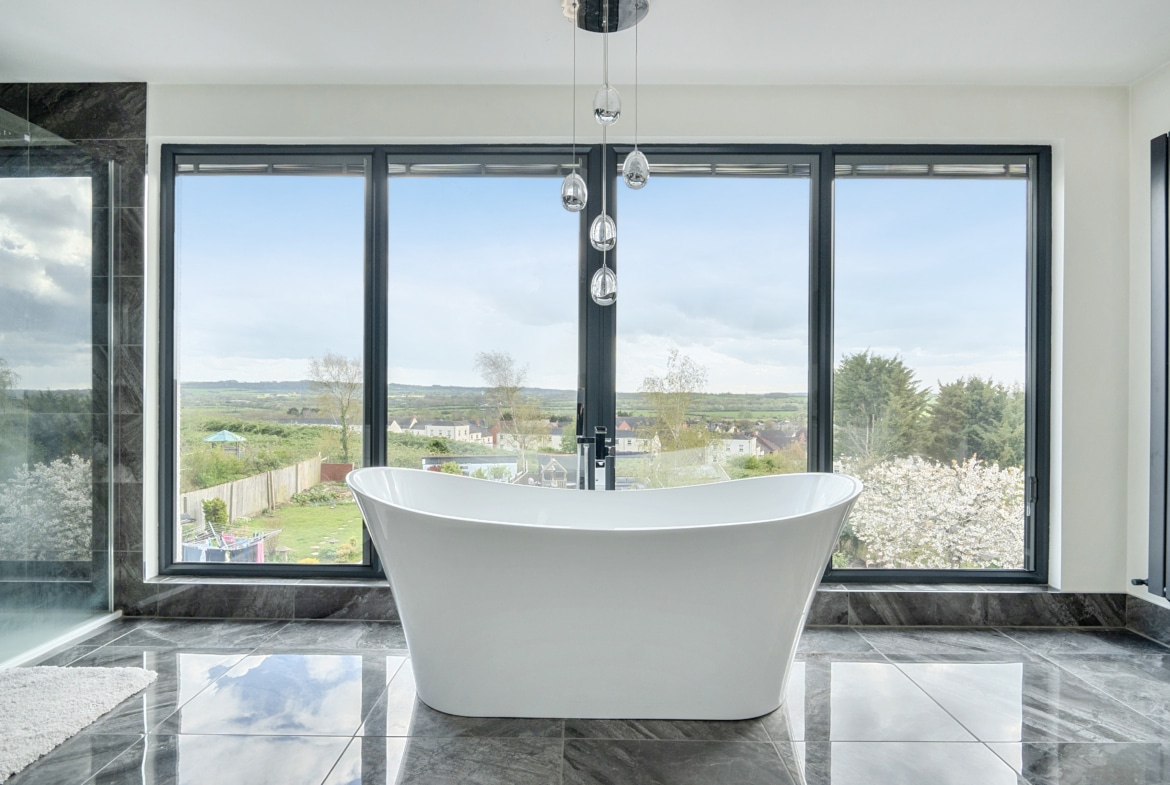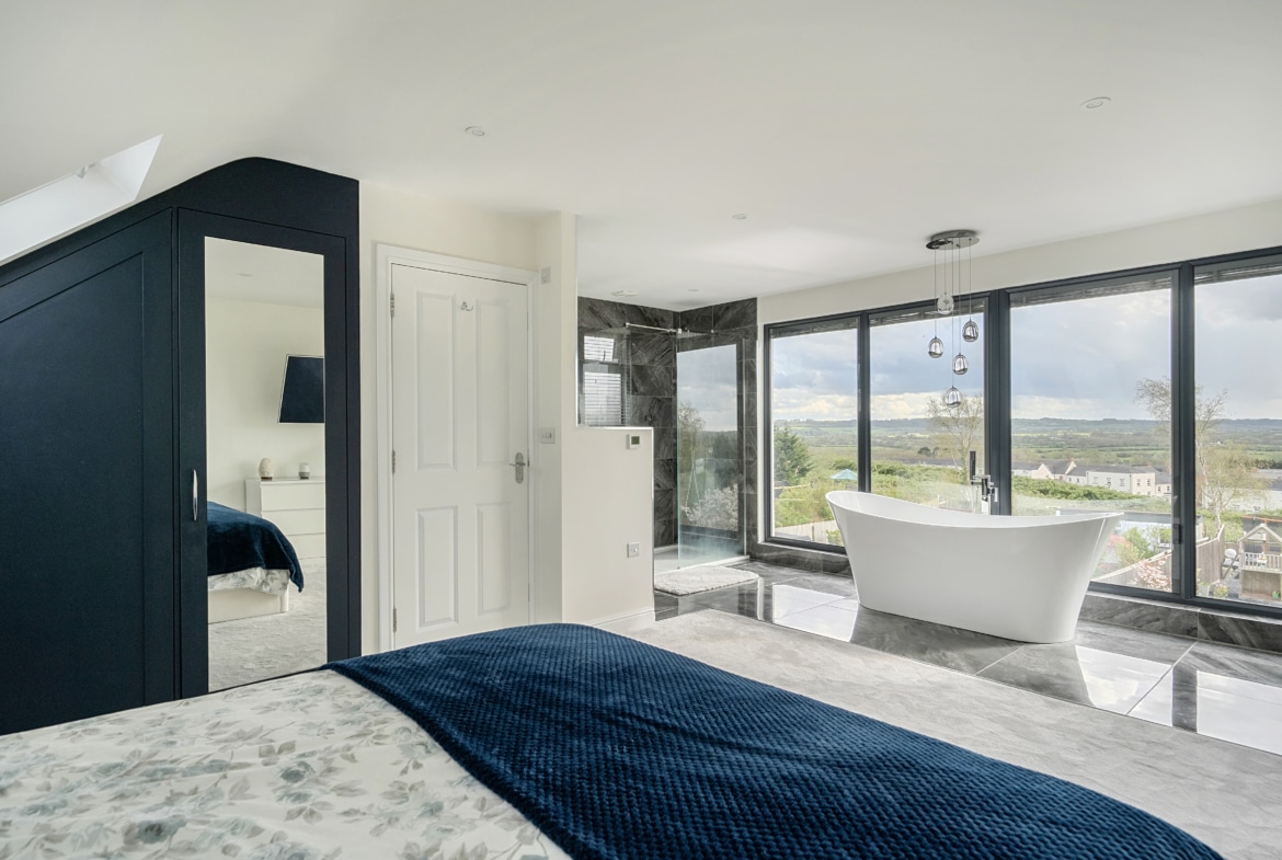 Upstairs, the standout feature is the exceptional loft conversion, complete with a stylish dormer. This luxurious top-floor retreat offers a boutique hotel feel, centred around a stunning freestanding bath positioned to take full advantage of elevated, floor-to-ceiling views. It’s a rare and indulgent space designed for relaxation, blending comfort with a real sense of drama.