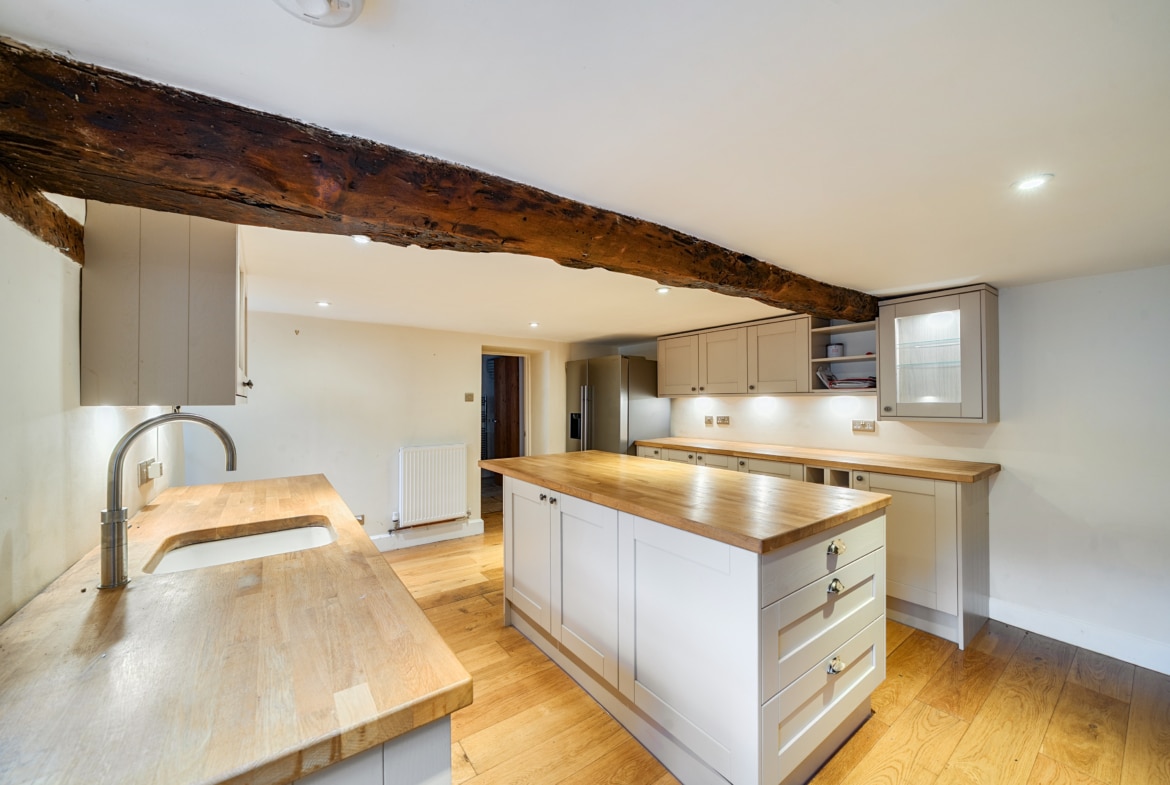Step through the welcoming front door and you’re greeted by a bright and spacious reception room with large windows and natural light flooding through, leading seamlessly to a formal dining room—ideal for entertaining or family gatherings. The bespoke kitchen is a true showstopper, boasting solid wood worktops, an impressive central island, integrated appliances, and rustic timber beams that add warmth and character. Adjacent, a utility/bathroom provides practicality without compromising style.