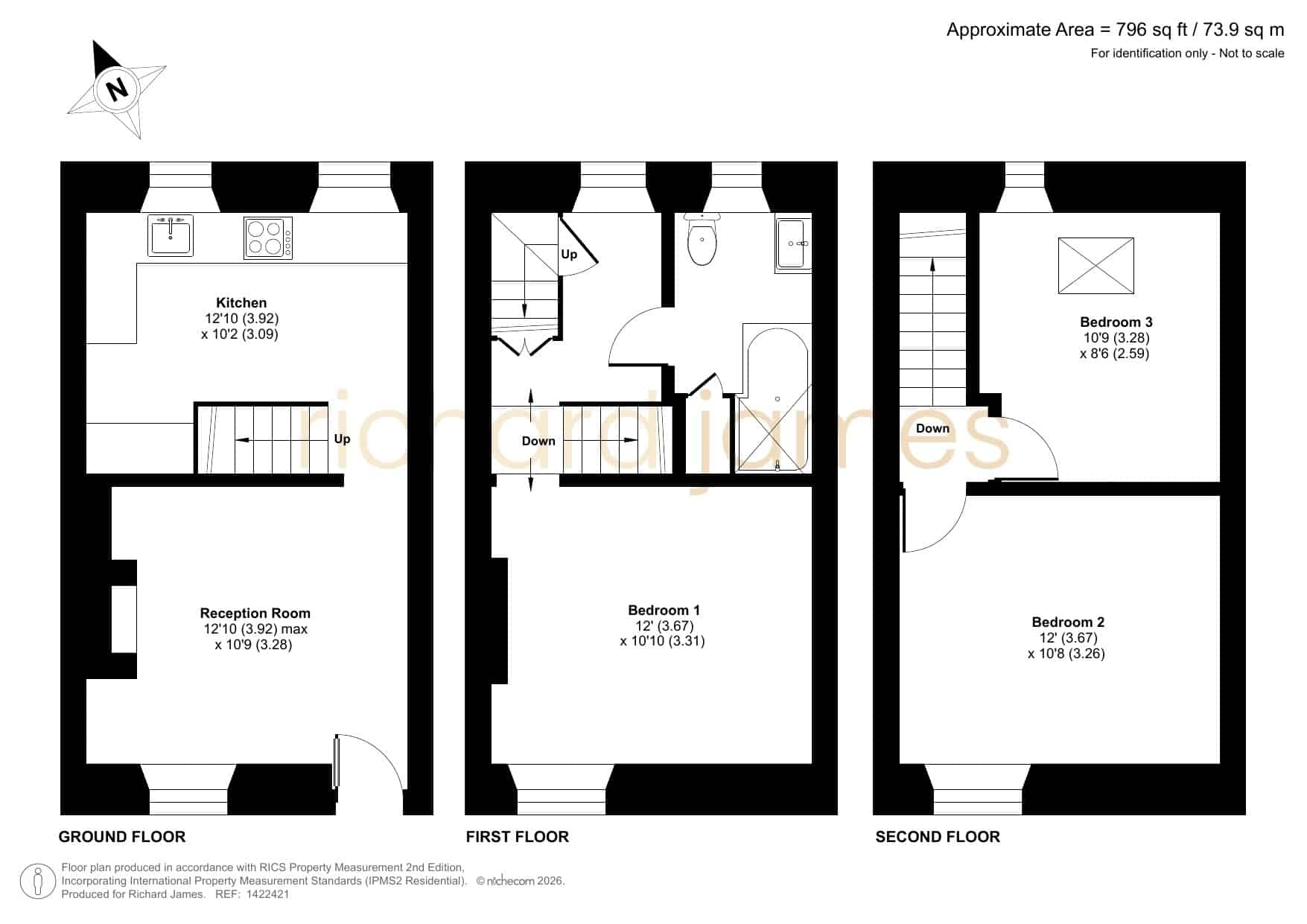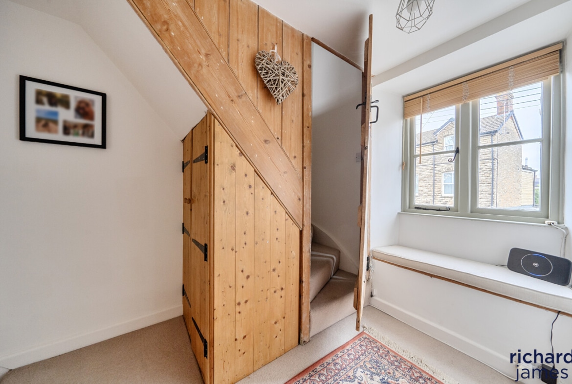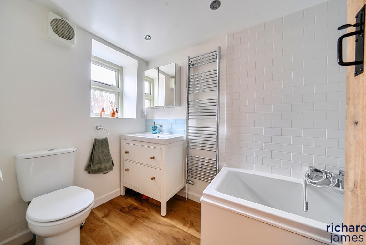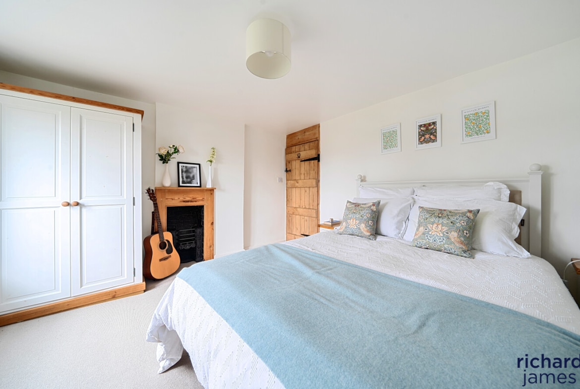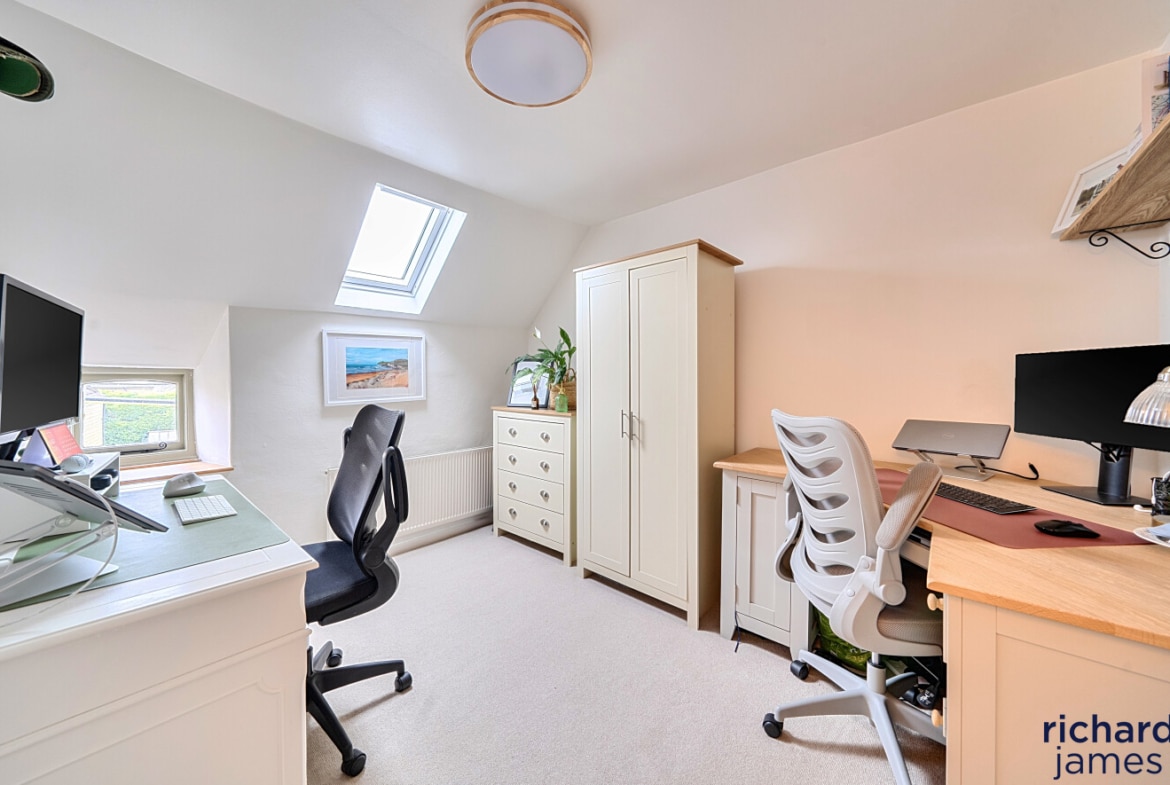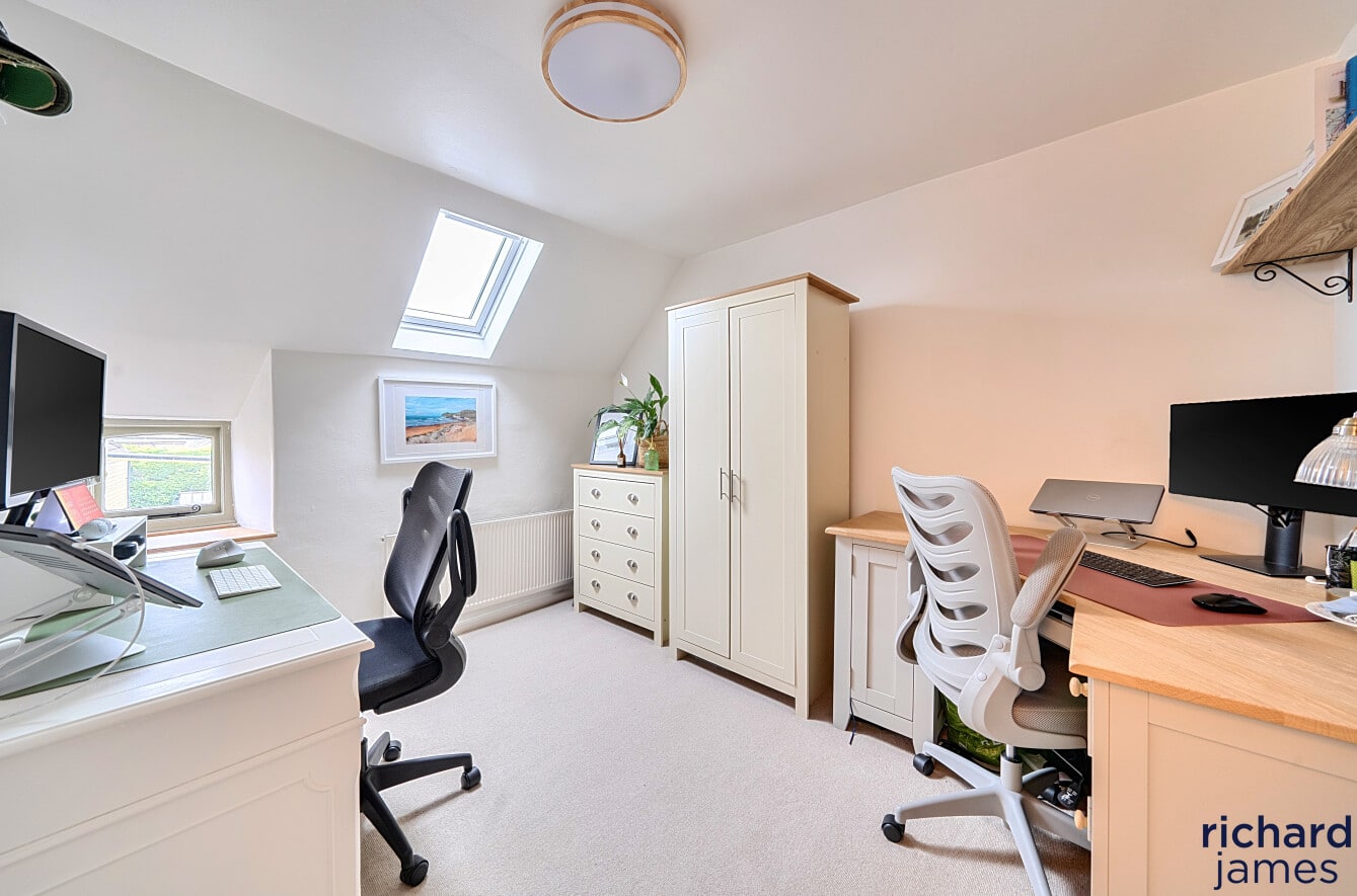 Arranged over three floors, the layout is wonderfully flexible. The first floor offers a generous double bedroom — equally suited as a second sitting room or creative workspace — alongside a stylish bathroom with shower over bath. On the top floor, two further double bedrooms provide peaceful retreats, full of charm and character. Gas-fired central heating ensures comfort year-round.