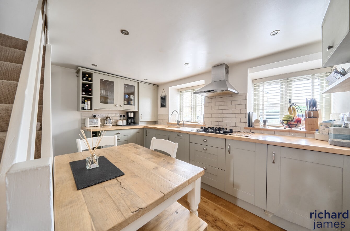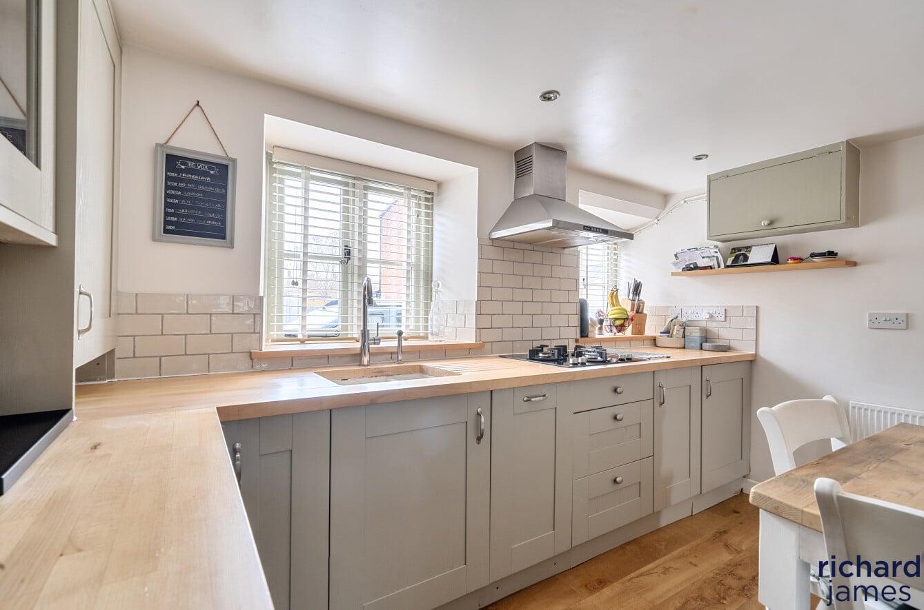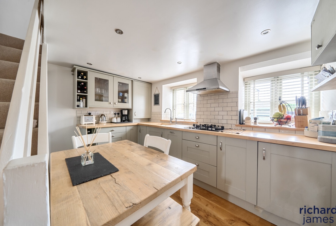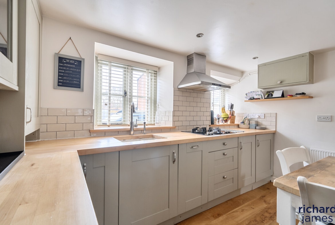 The kitchen/breakfast room flows naturally from here, designed very much as the heart of the home. With its country-style cabinetry, beech worktops and integrated appliances, it’s a space made for morning coffee at the table, relaxed suppers and easy conversation while dinner simmers on the hob. Light pours in, enhancing the sense of warmth and practicality.