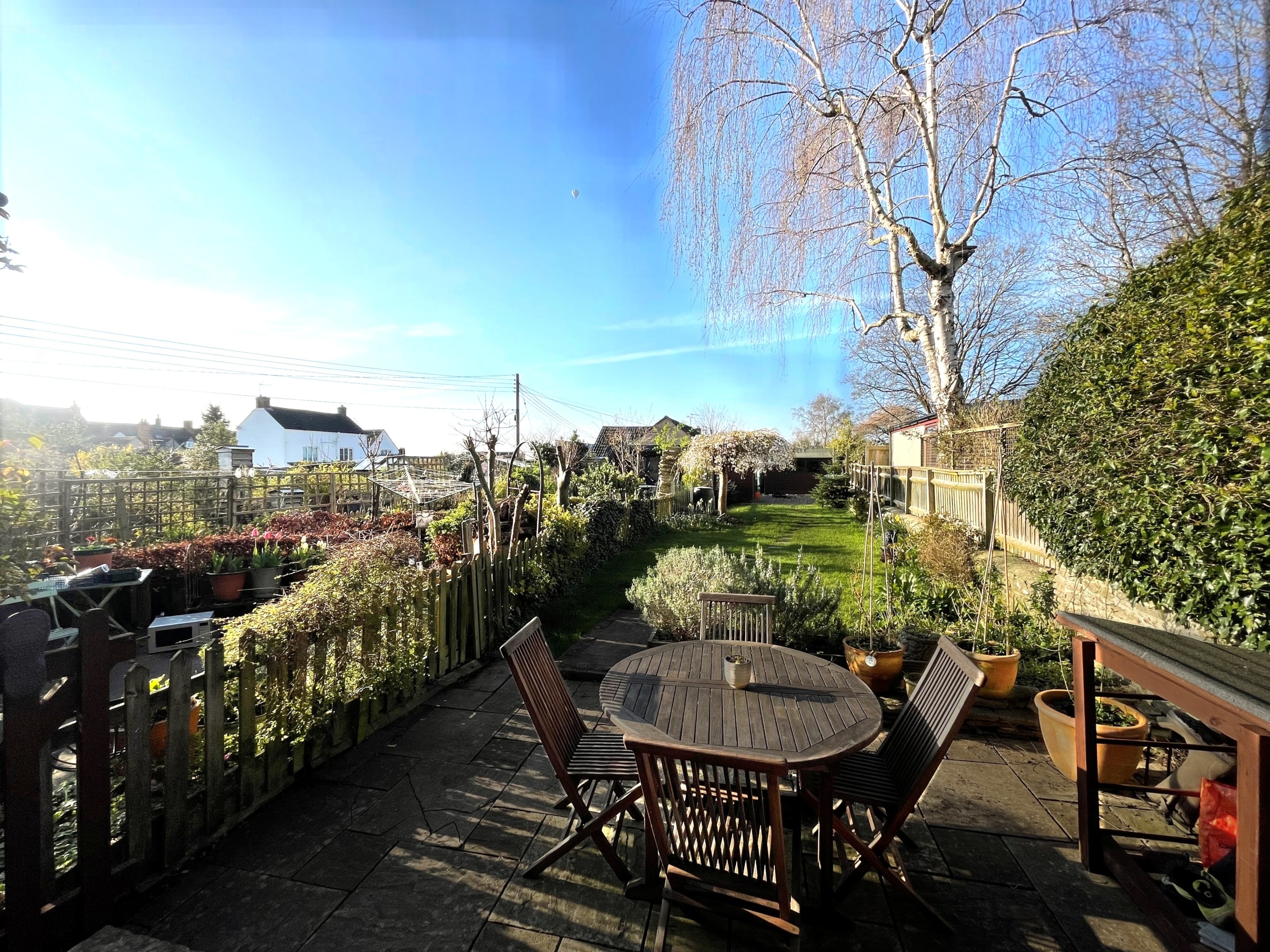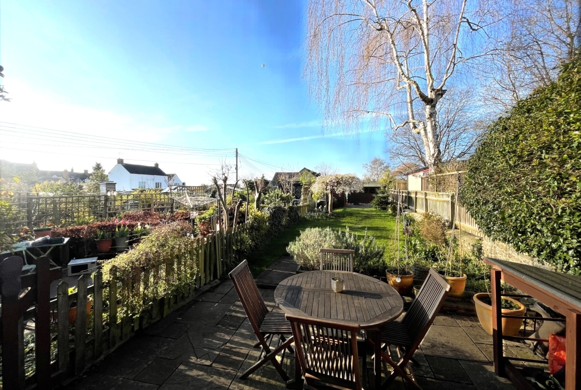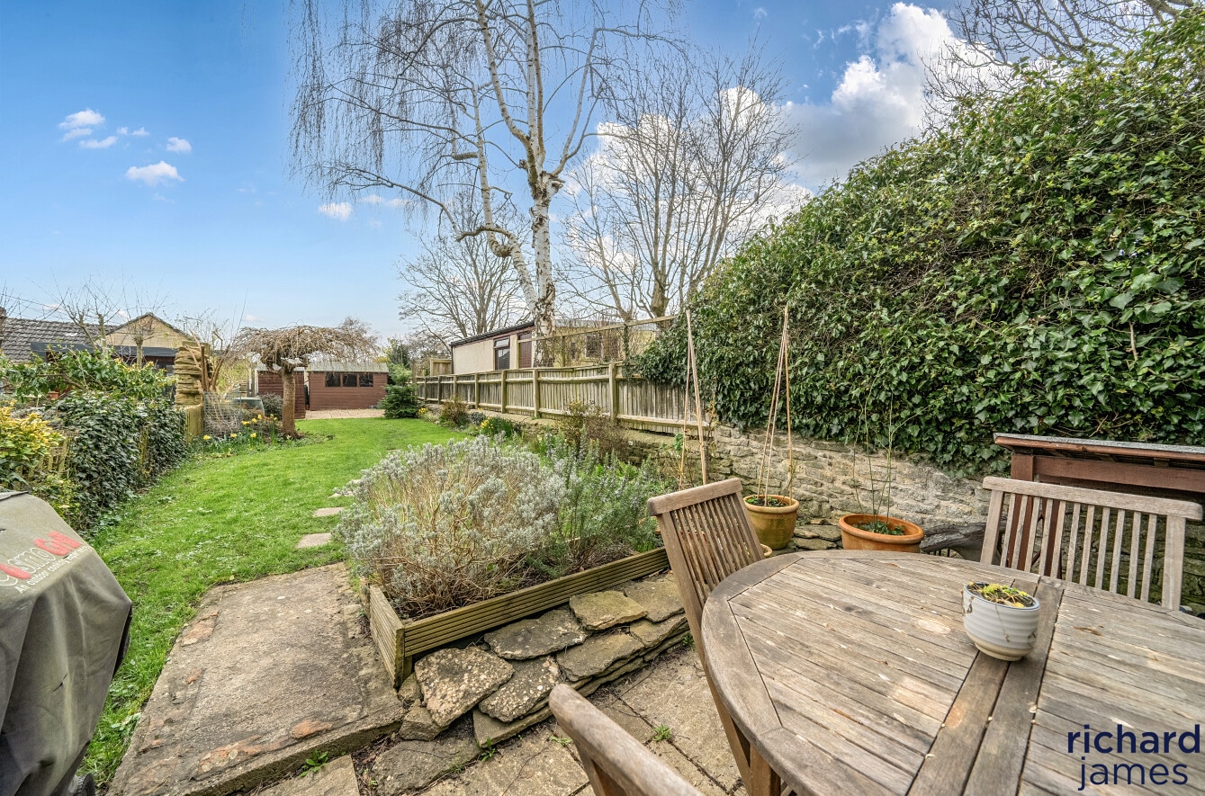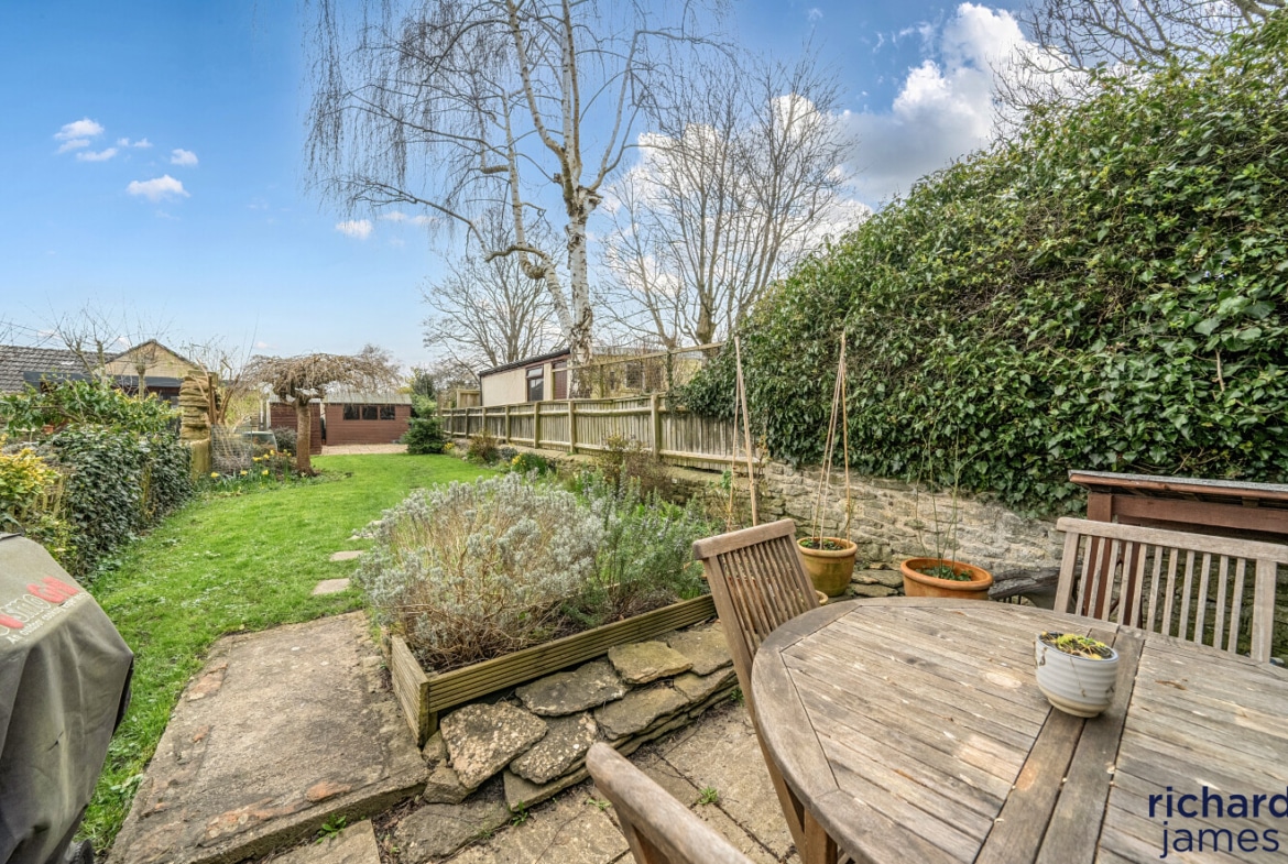 Outside, the garden is a genuine highlight. Positioned to the front, it enjoys a lovely open outlook and a surprising sense of privacy. A patio by the house is ideal for summer lunches, while the lawn stretches down to a further seating area — perfect for evening drinks as the sun lowers. There’s space here for children to play, for keen gardeners to potter, or simply for enjoying the seasons change. A useful storage shed sits neatly at the far end.