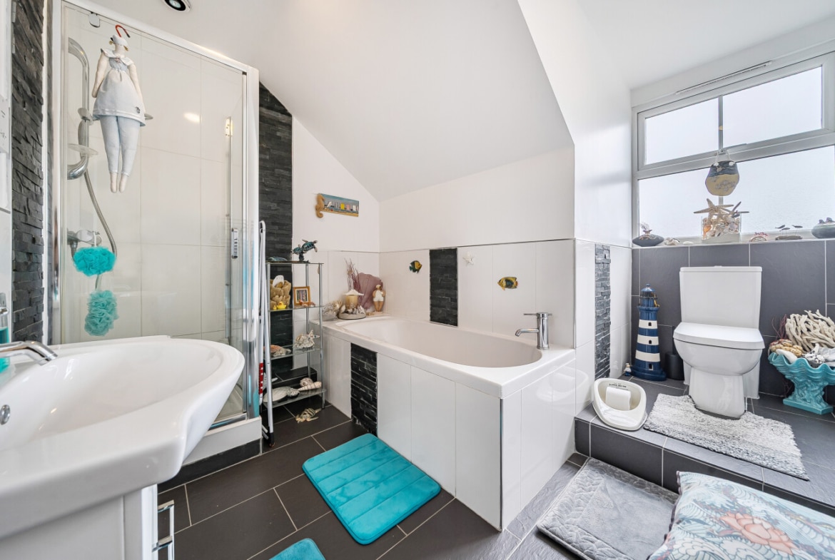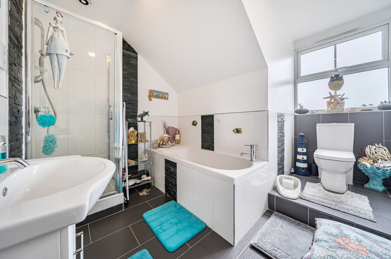 Upstairs, four well-proportioned bedrooms await, two benefitting from en-suite facilities, alongside a family bathroom featuring both bath and separate shower.