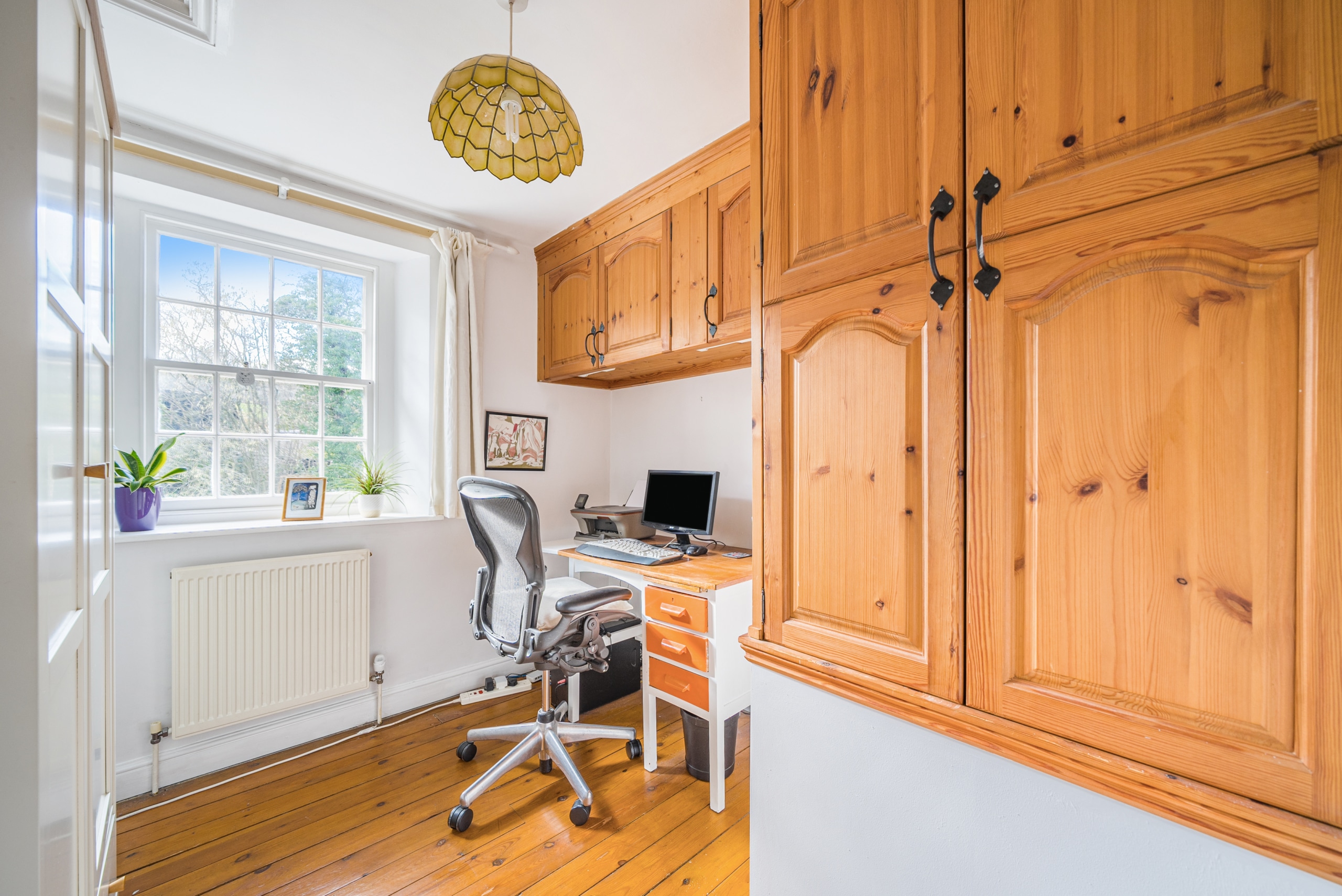 Bedroom three (currently set up as the home office) offers cupboards, polished floorboards and a sash window overlooking the canal.