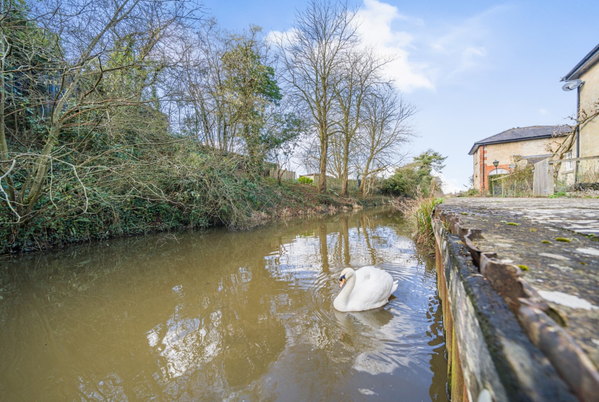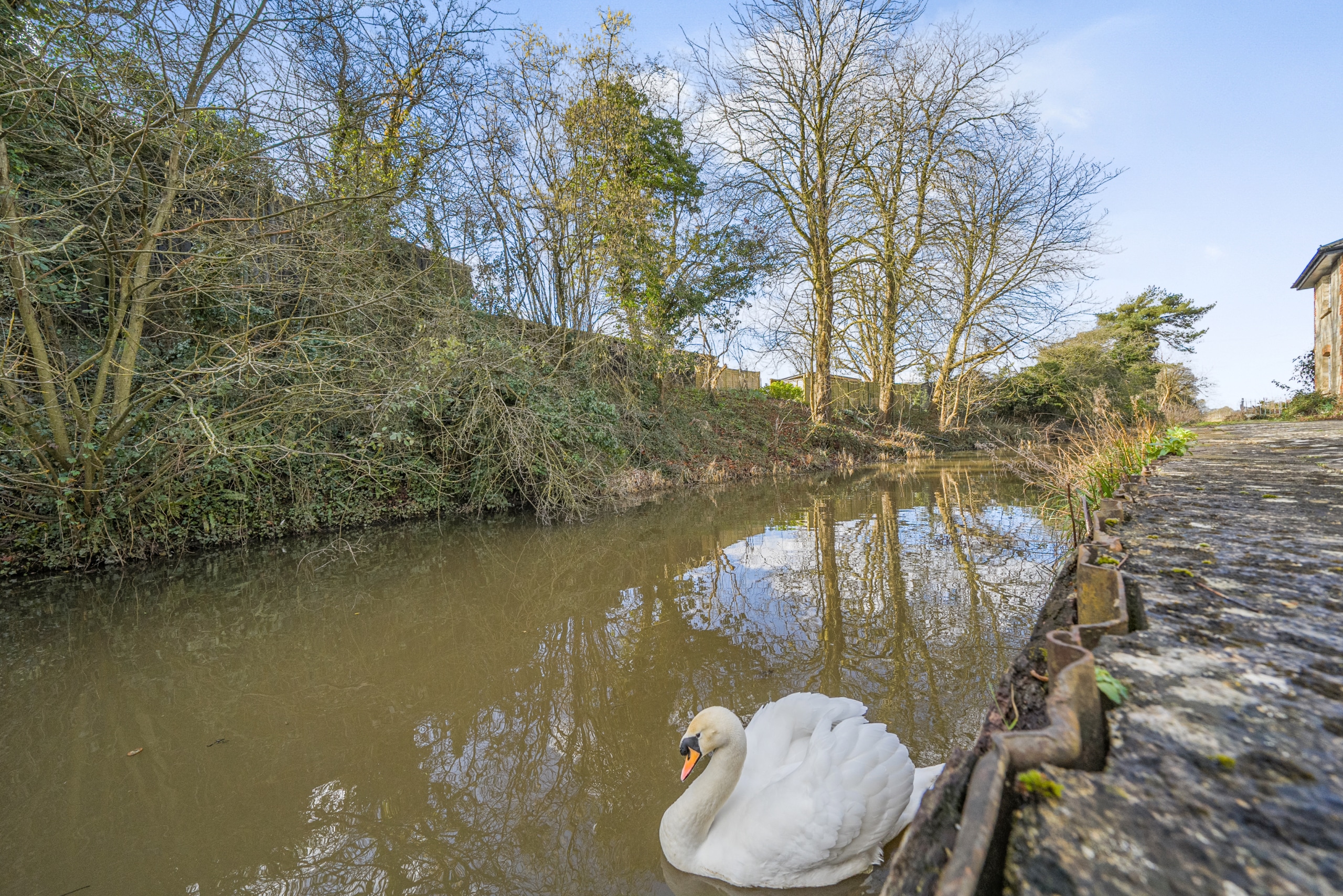 Features include an entrance hall with a storage cupboard. The cosy living room enjoys a sash window overlooking the canal and a bathstone fireplace offering a wood-burning stove.