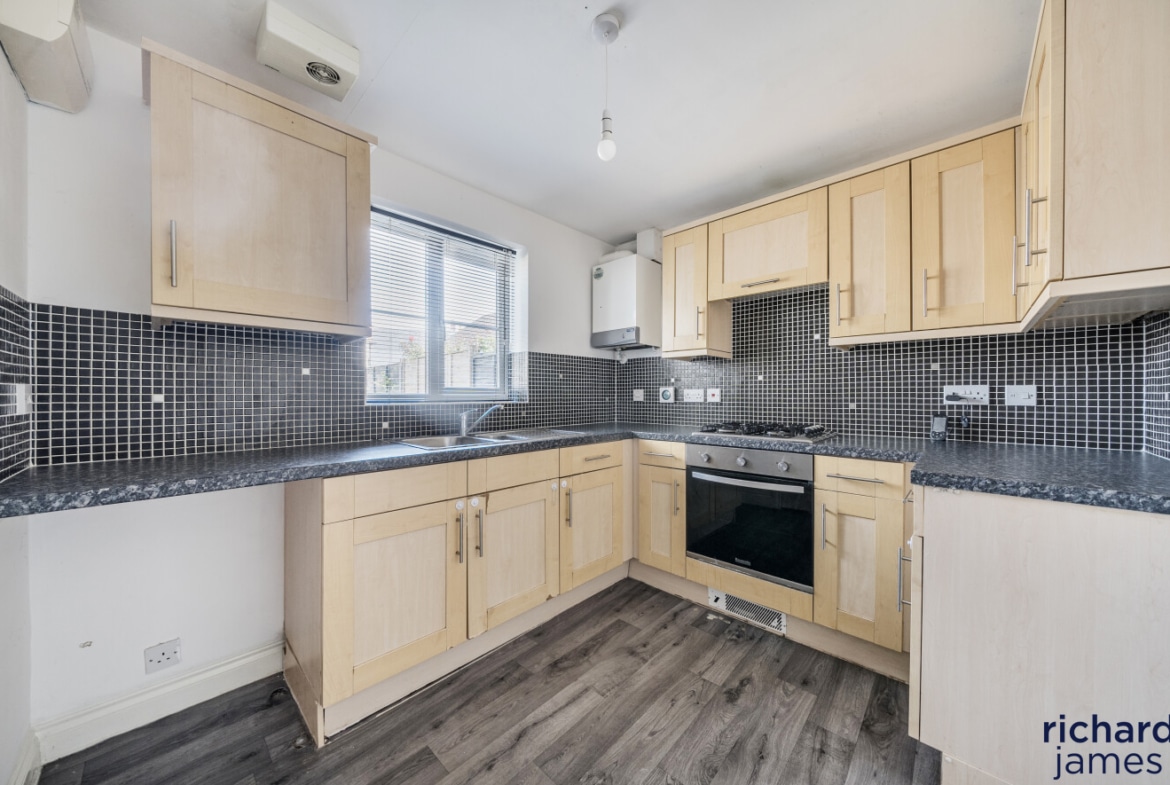 The kitchen offers ample storage and worktop space, with direct access to the dining area and views over the rear garden.