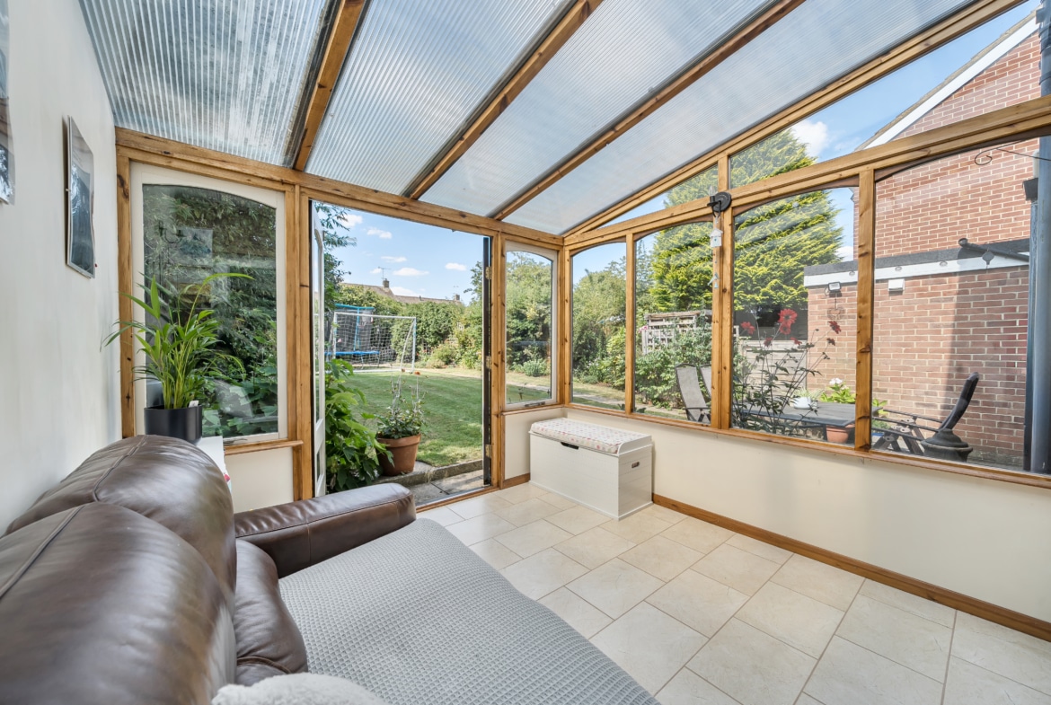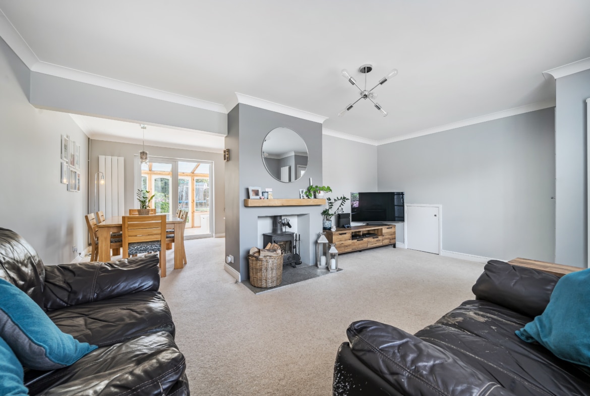 The ground floor features a welcoming entrance hall leading into a generous reception room, stylishly decorated and complete with a feature fireplace and ample space for entertaining. This open-plan living area flows seamlessly into a bright dining room and onward to a charming conservatory with views over the garden, enhancing the sense of light and space.