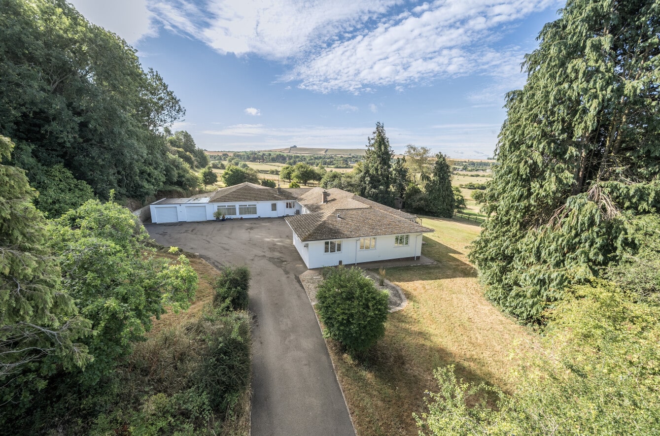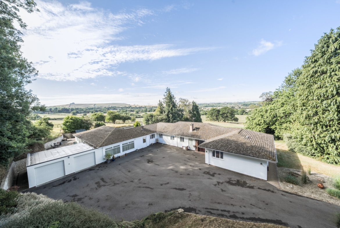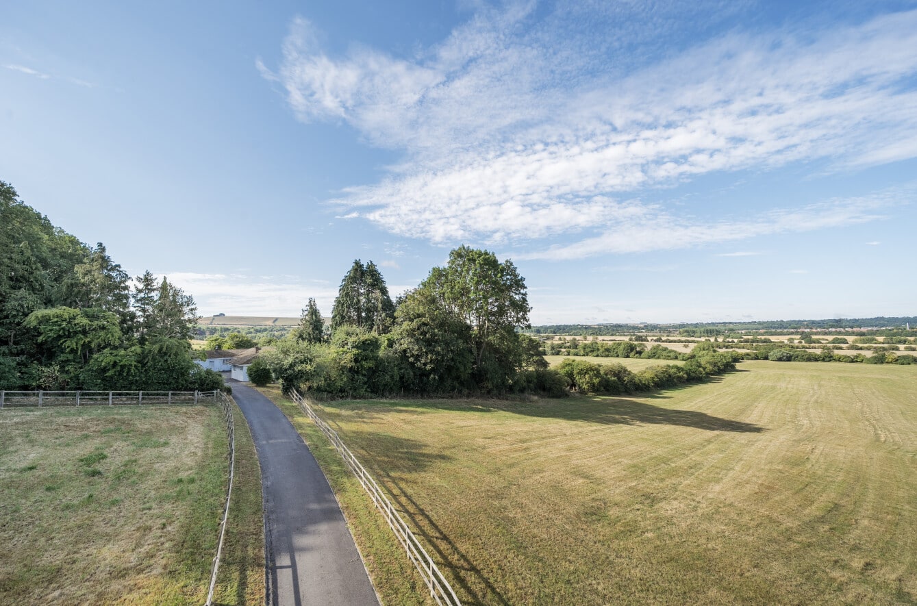 Accessed via a private driveway, the home enjoys complete seclusion and panoramic views across Liddington Hill and the surrounding Wiltshire countryside.
