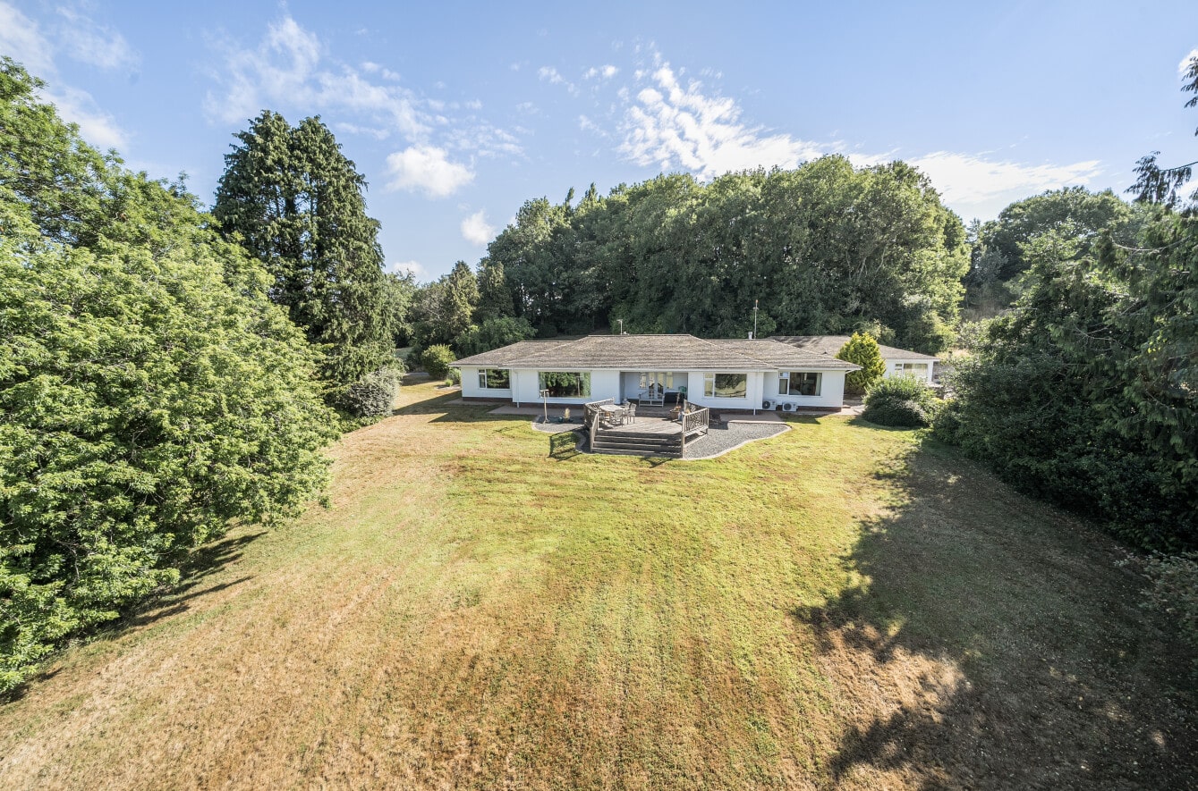 Bushey House is a substantial and secluded four-bedroom detached bungalow, offering over 4,000 sq ft of accommodation, set within approximately five acres of beautifully maintained gardens, paddock, and mature woodland. The property itself provides in excess of 3,600 sq ft of internal living space, plus an additional 400 sq ft double garage, making it ideal for families, those seeking multi-generational living (annexe adaptable very easily), or anyone looking for a spacious rural retreat.