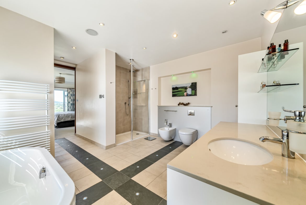 Internally, the property is exceptionally versatile and thoughtfully arranged. Accommodation includes a generous entrance hall, a large kitchen/breakfast room fitted by Hobsons Choice, separate dining room, and a bright, spacious lounge with expansive windows that frame breath taking views. There are four double bedrooms, including three with en-suite bathrooms, a family shower room, and additional reception rooms, offering flexible space for home offices, hobbies, or potential annex accommodation.