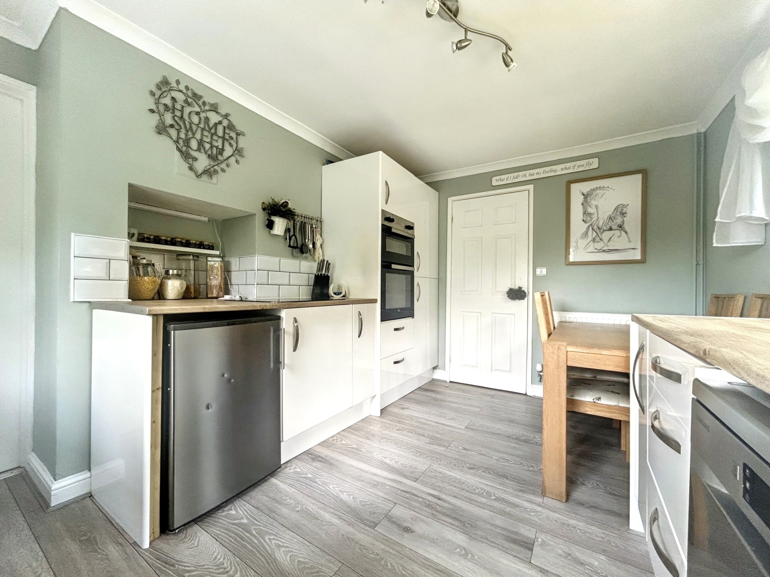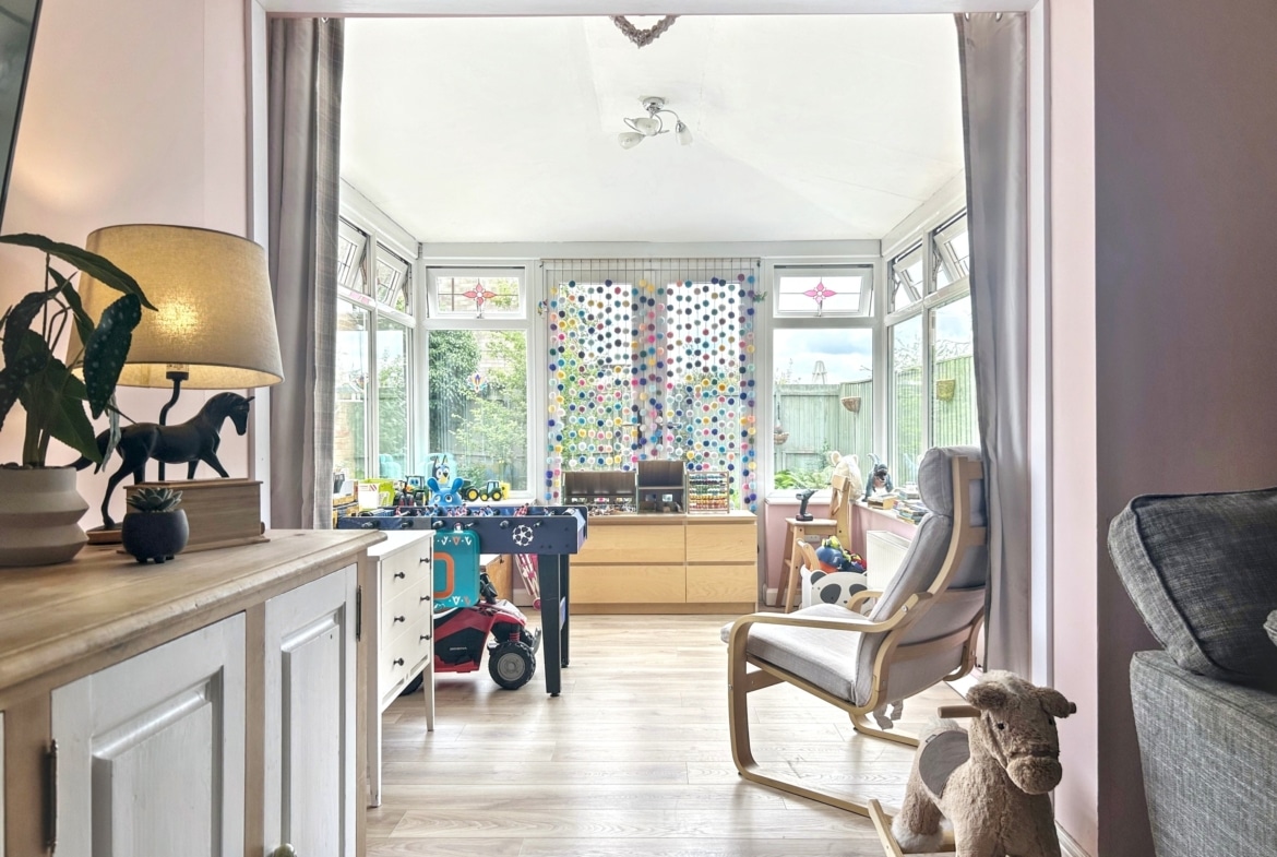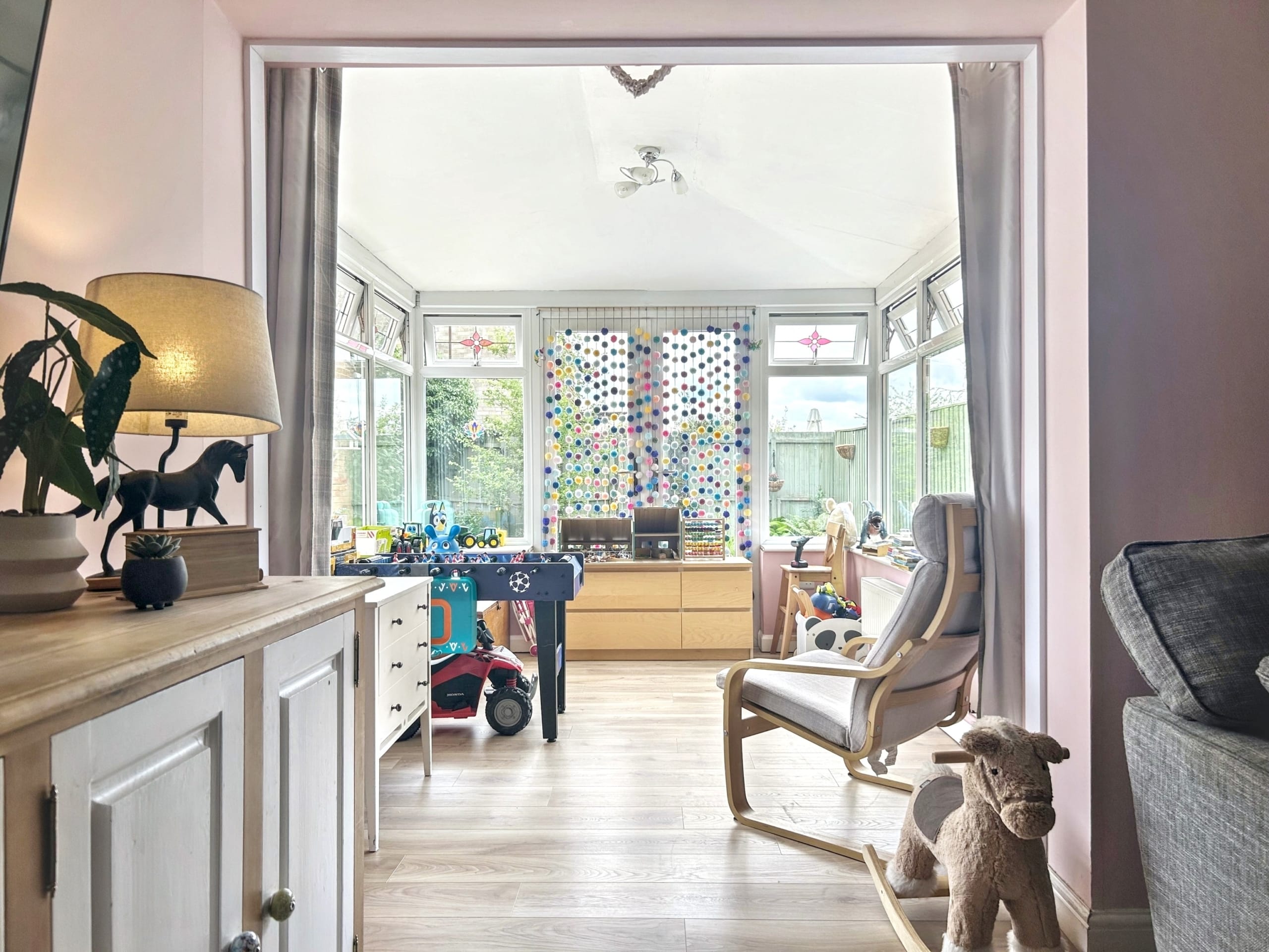 Internally, the home is decorated in a natural palette throughout, creating a light and welcoming atmosphere. The ground floor comprises a spacious kitchen/diner with modern fittings, a separate utility room, and a comfortable living room featuring an open (non-operational) fireplace. The adjoining conservatory, recently upgraded with a new roof, offers year-round use and overlooks the garden — perfect as an additional reception or garden room.