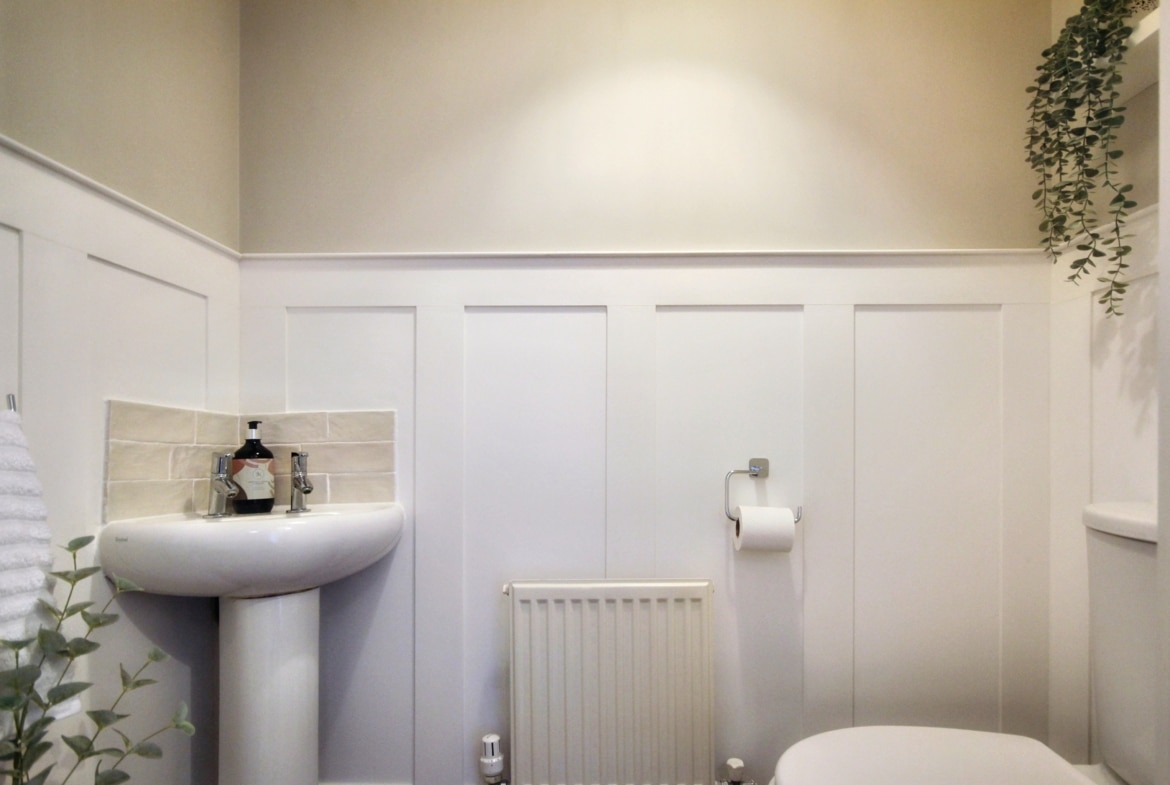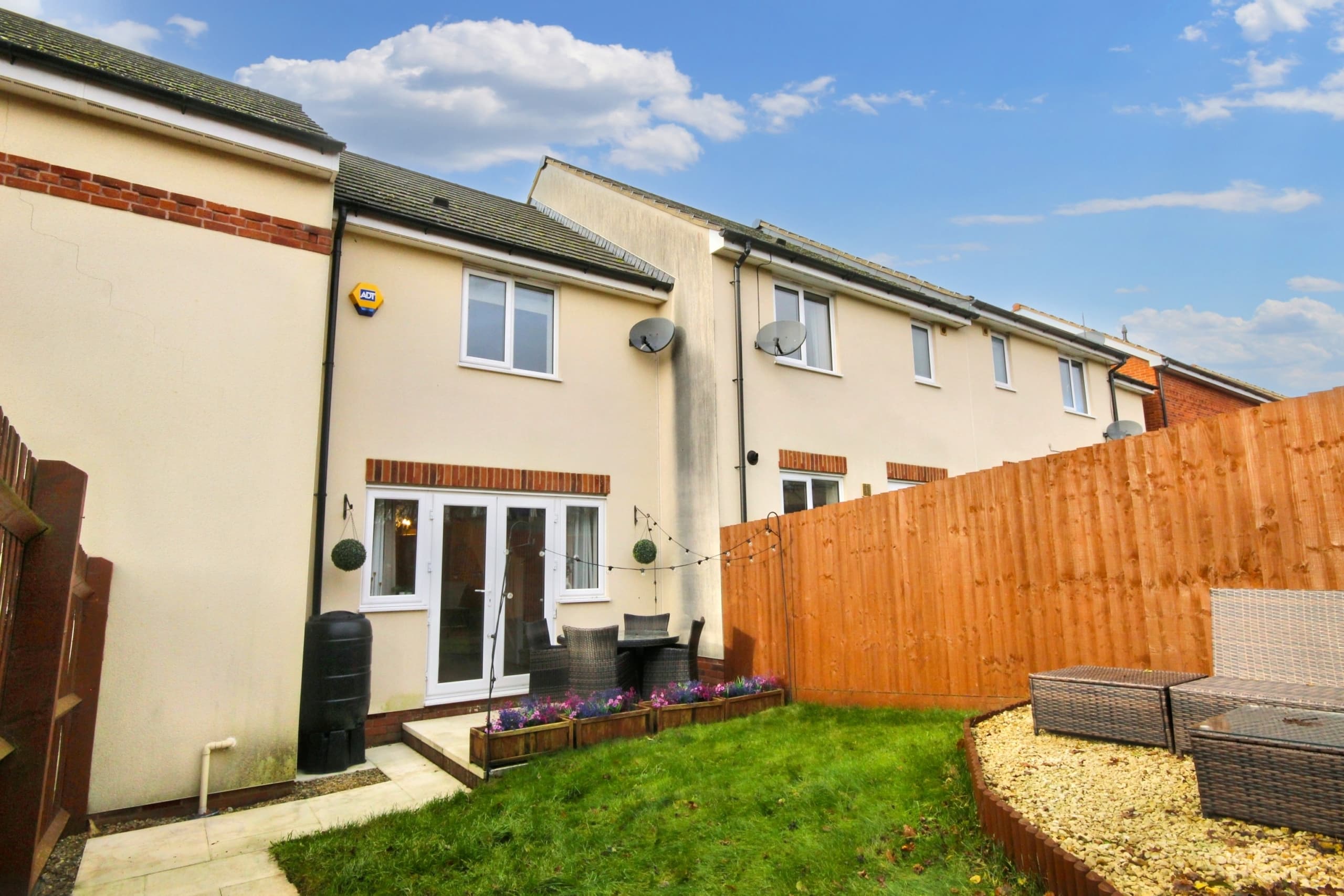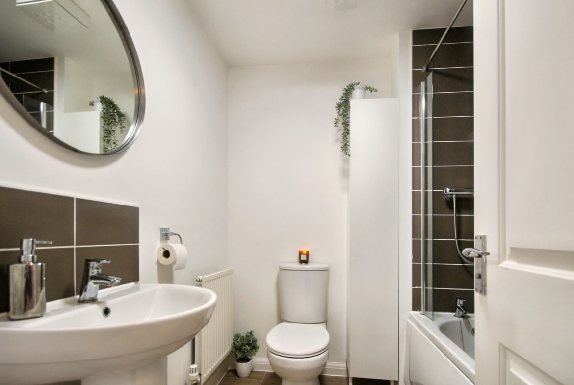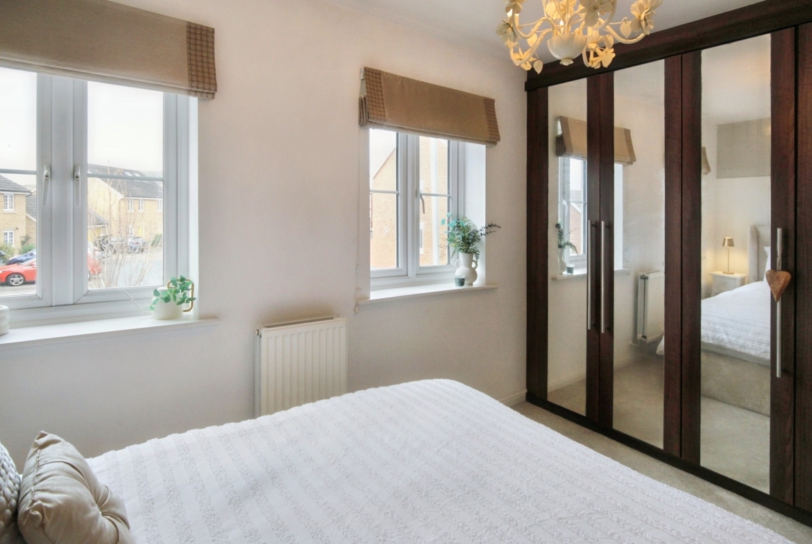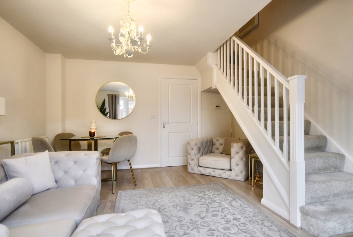 On entering, you’re greeted by a well-appointed kitchen and a convenient WC, leading through to a spacious lounge/diner with French doors opening out onto the rear garden – perfect for entertaining or enjoying the outdoors. Upstairs, you’ll find two generously-sized double bedrooms, both featuring fitted wardrobes, offering plenty of storage space. The family bathroom is also on this level, presented to the highest standard.