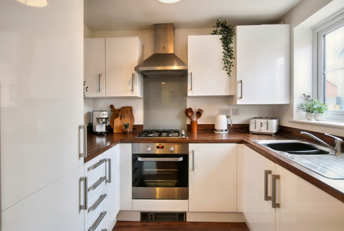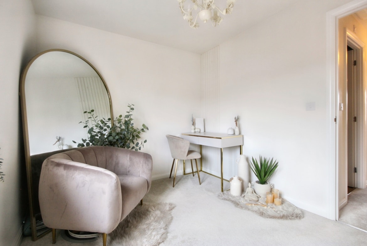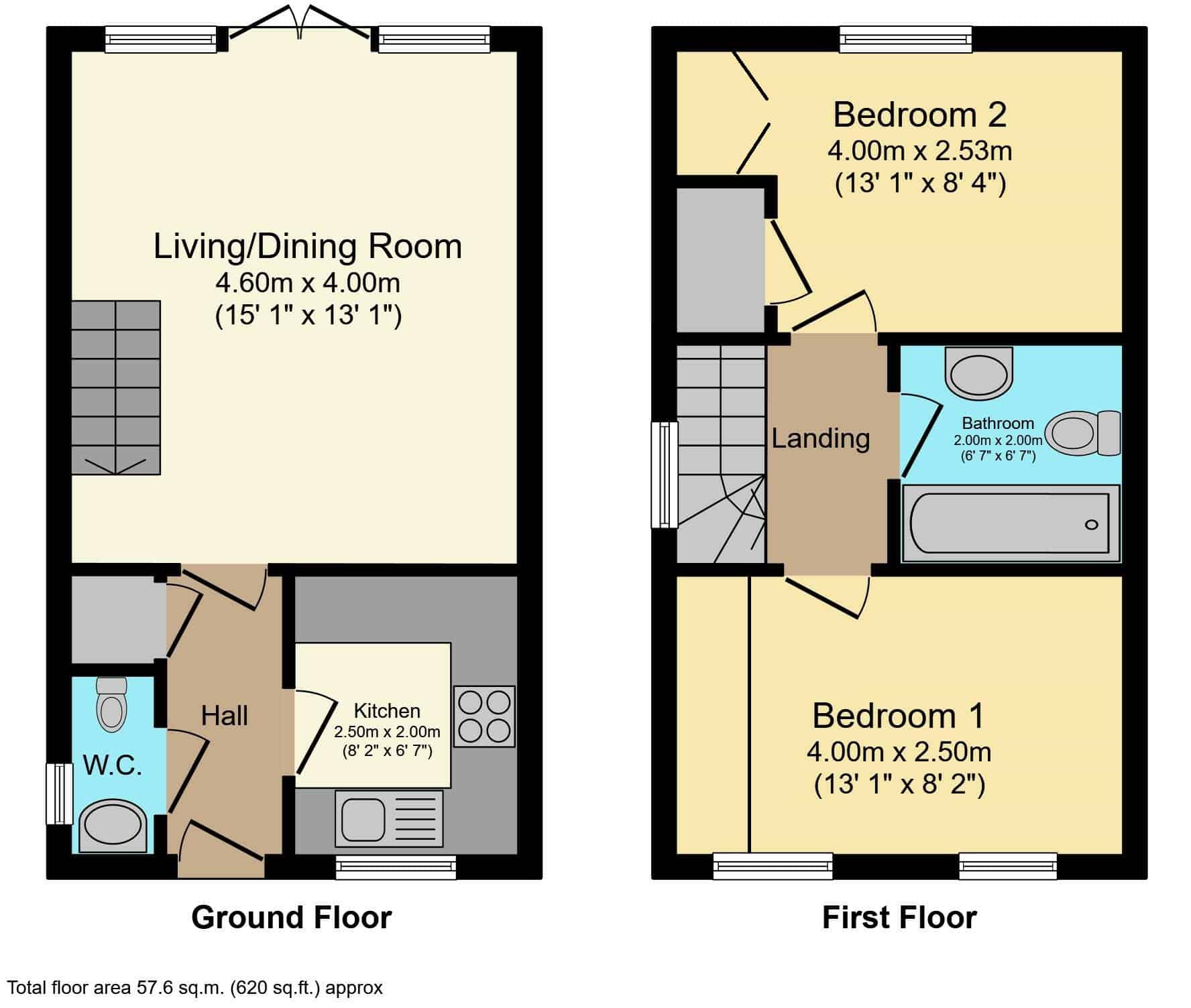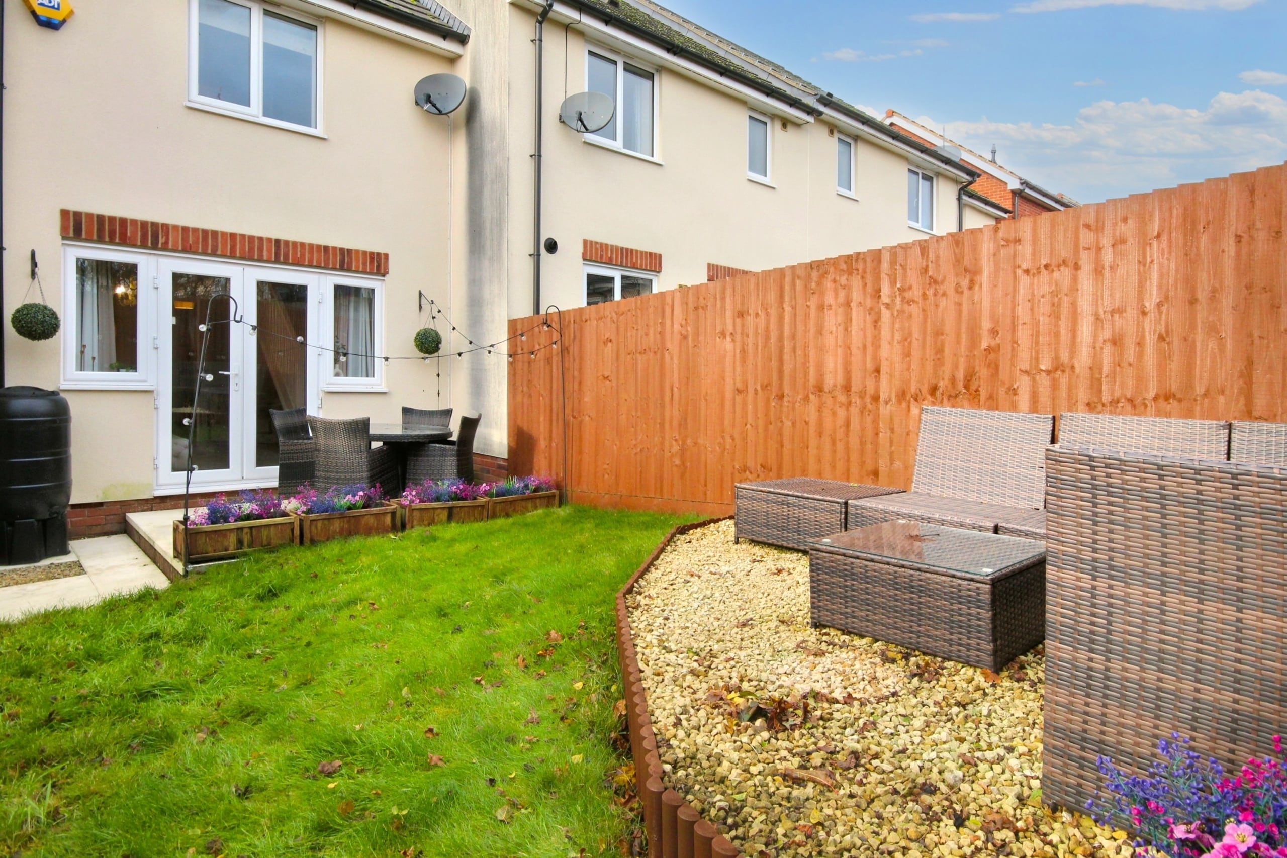 On entering, you’re greeted by a well-appointed kitchen and a convenient WC, leading through to a spacious lounge/diner with French doors opening out onto the rear garden – perfect for entertaining or enjoying the outdoors. Upstairs, you’ll find two generously-sized double bedrooms, both featuring fitted wardrobes, offering plenty of storage space. The family bathroom is also on this level, presented to the highest standard.