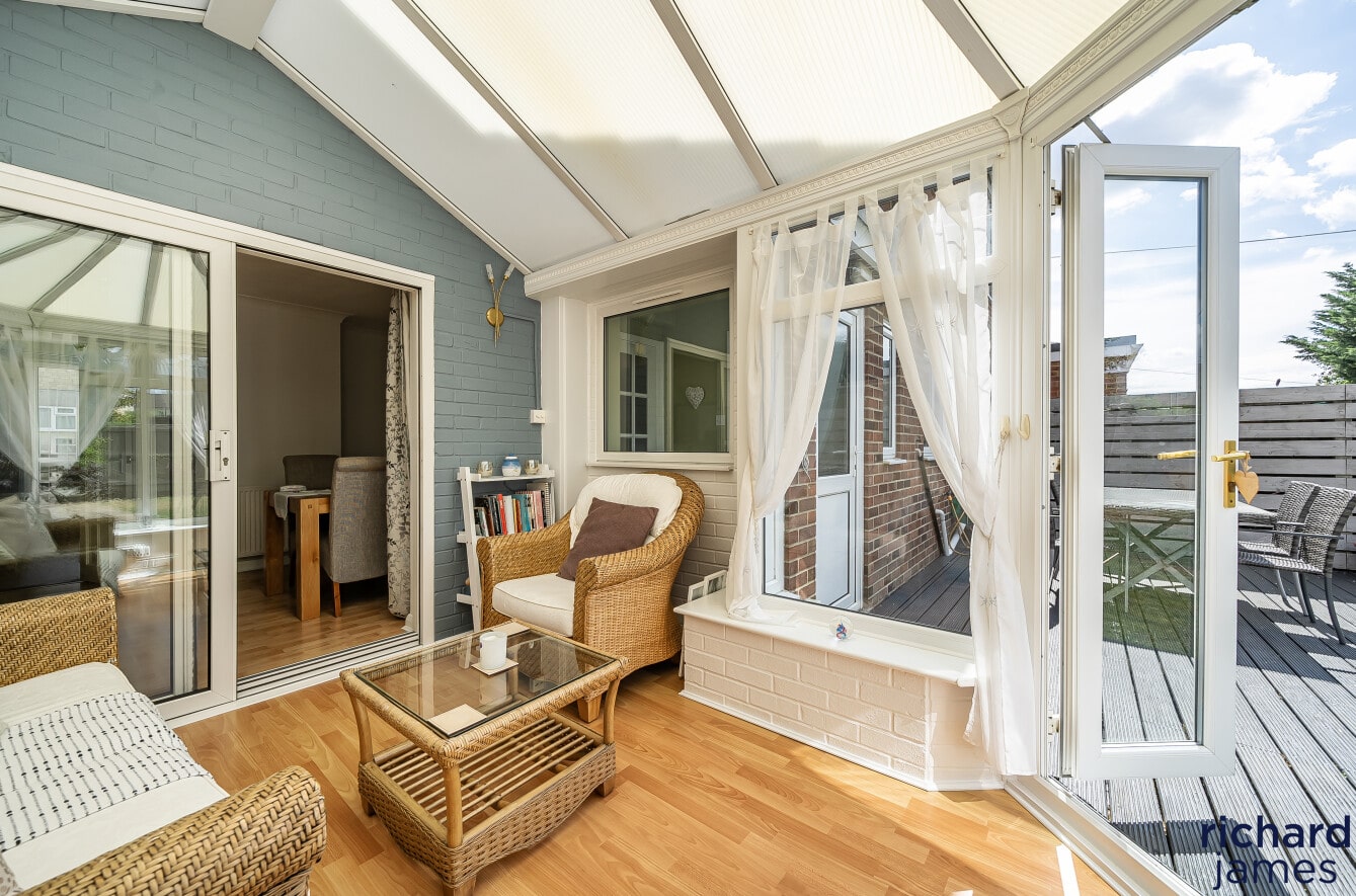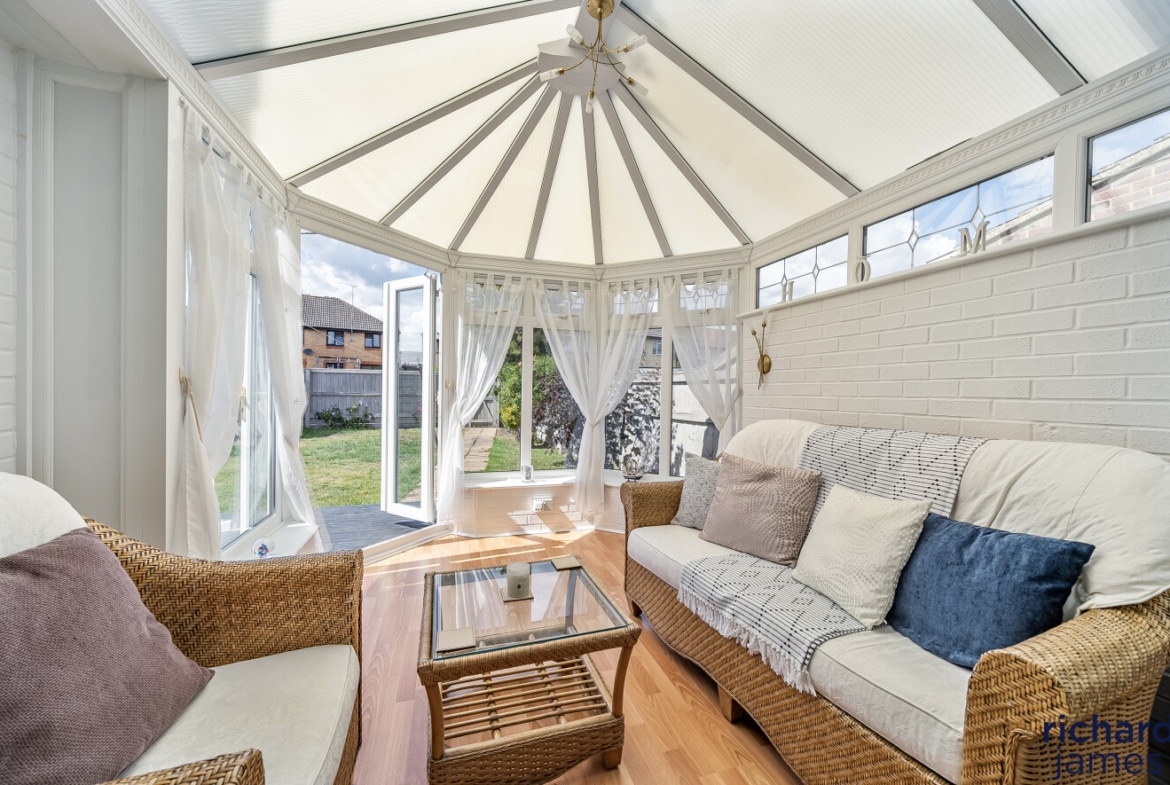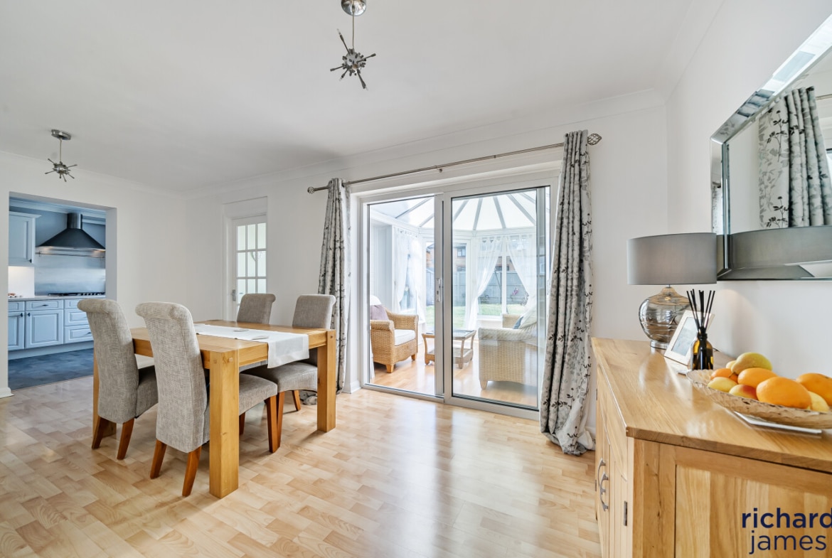 Upon entering, you are welcomed into a generous entrance hall that leads to a large, inviting living room – the perfect space for family gatherings and relaxation. The modern kitchen is complemented by a separate dining area, and sliding doors open to a bright conservatory, with French doors leading out to the beautifully enclosed rear garden, creating a seamless transition between indoor and outdoor living.