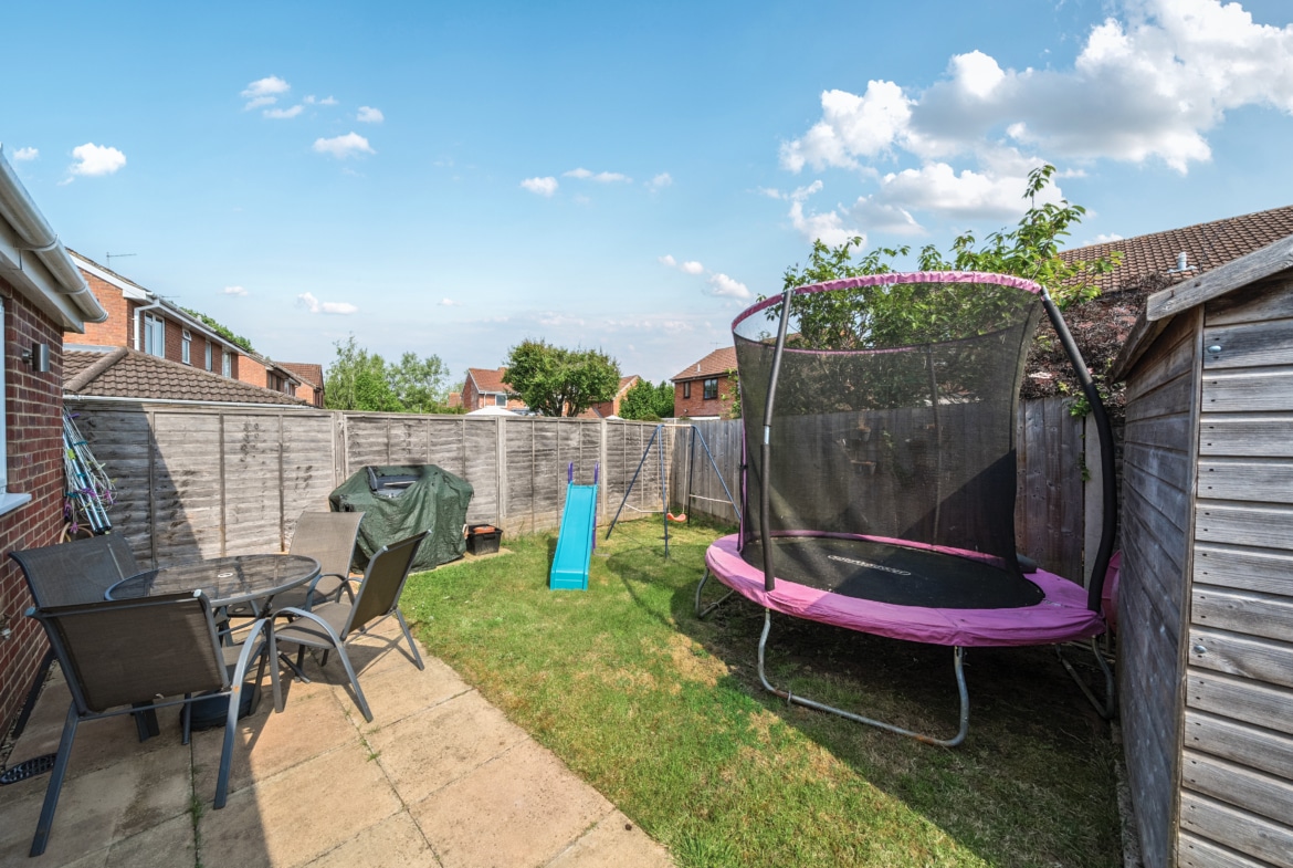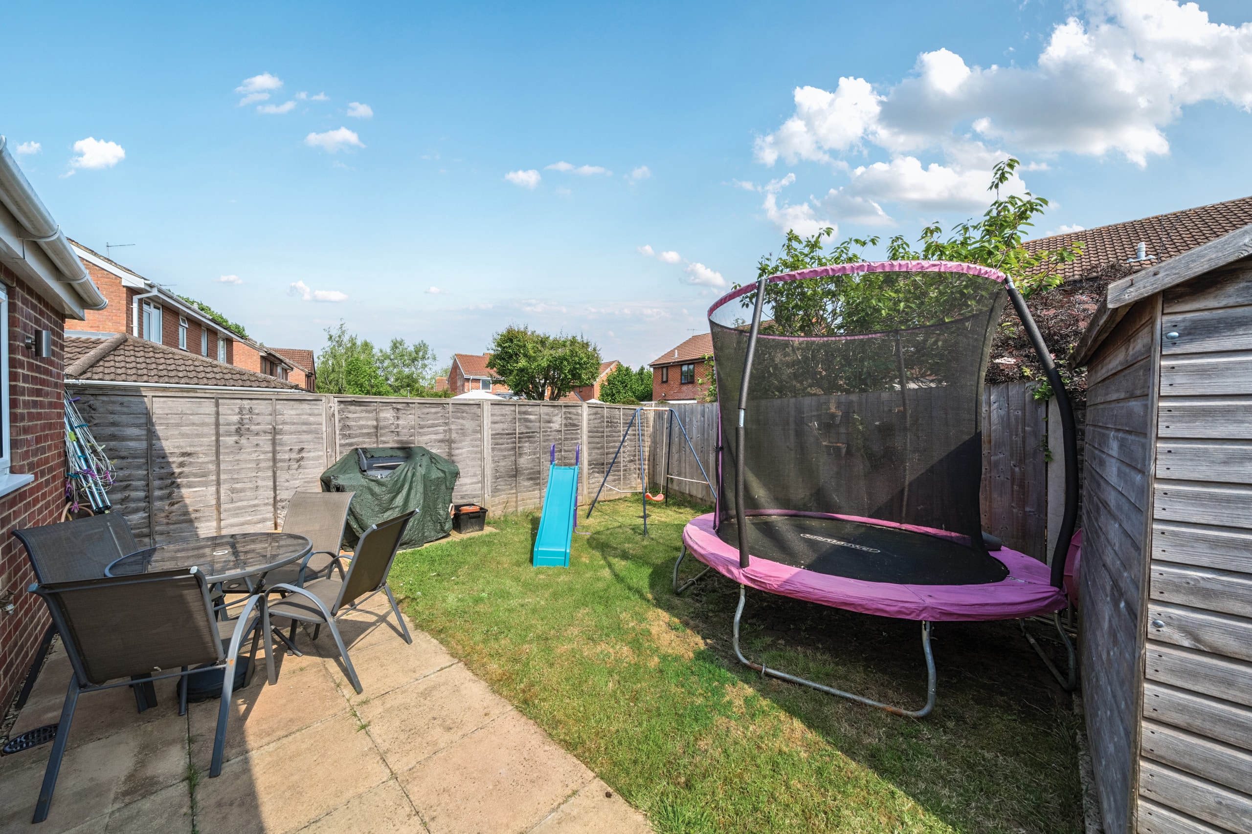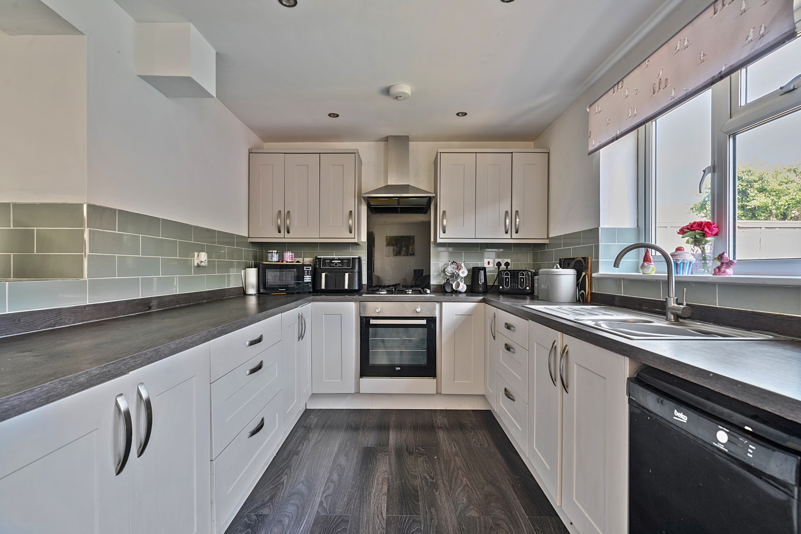 Outside, the private rear garden is mainly laid to lawn, providing a great outdoor area without too much upkeep. To the front, there’s a driveway large enough for two vehicles.
