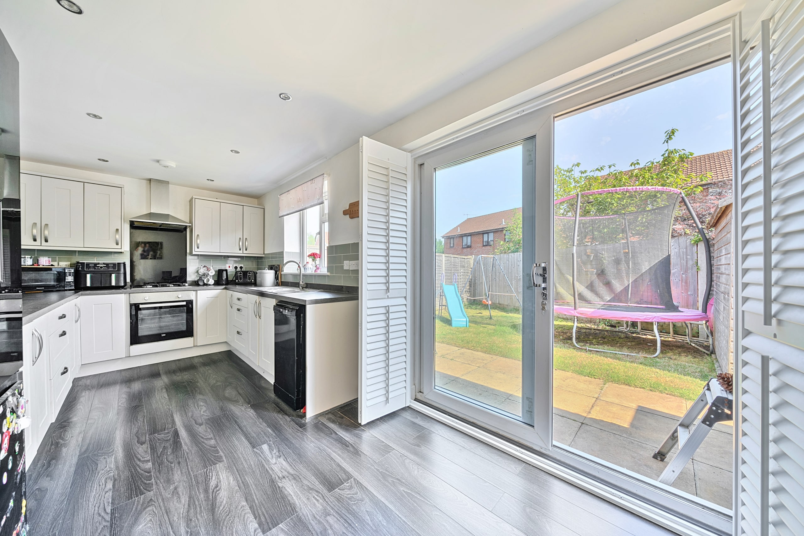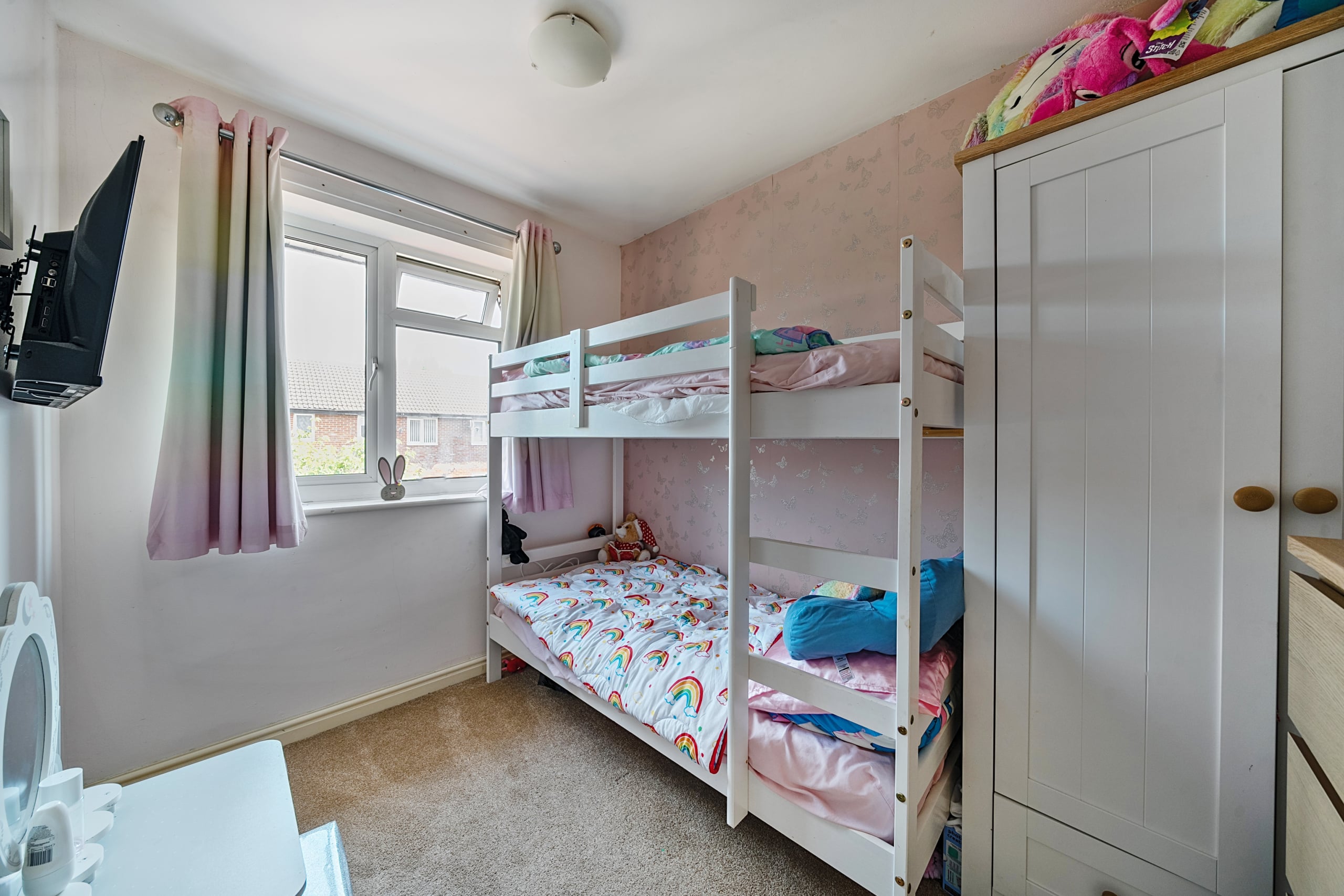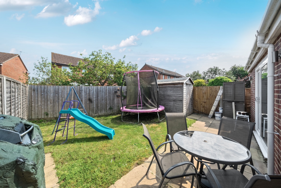 Outside, the private rear garden is mainly laid to lawn, providing a great outdoor area without too much upkeep. To the front, there’s a driveway large enough for two vehicles.