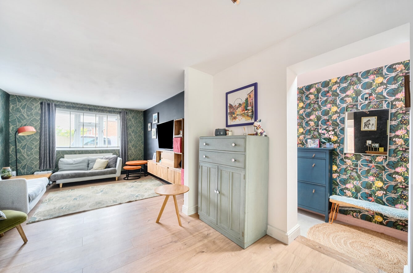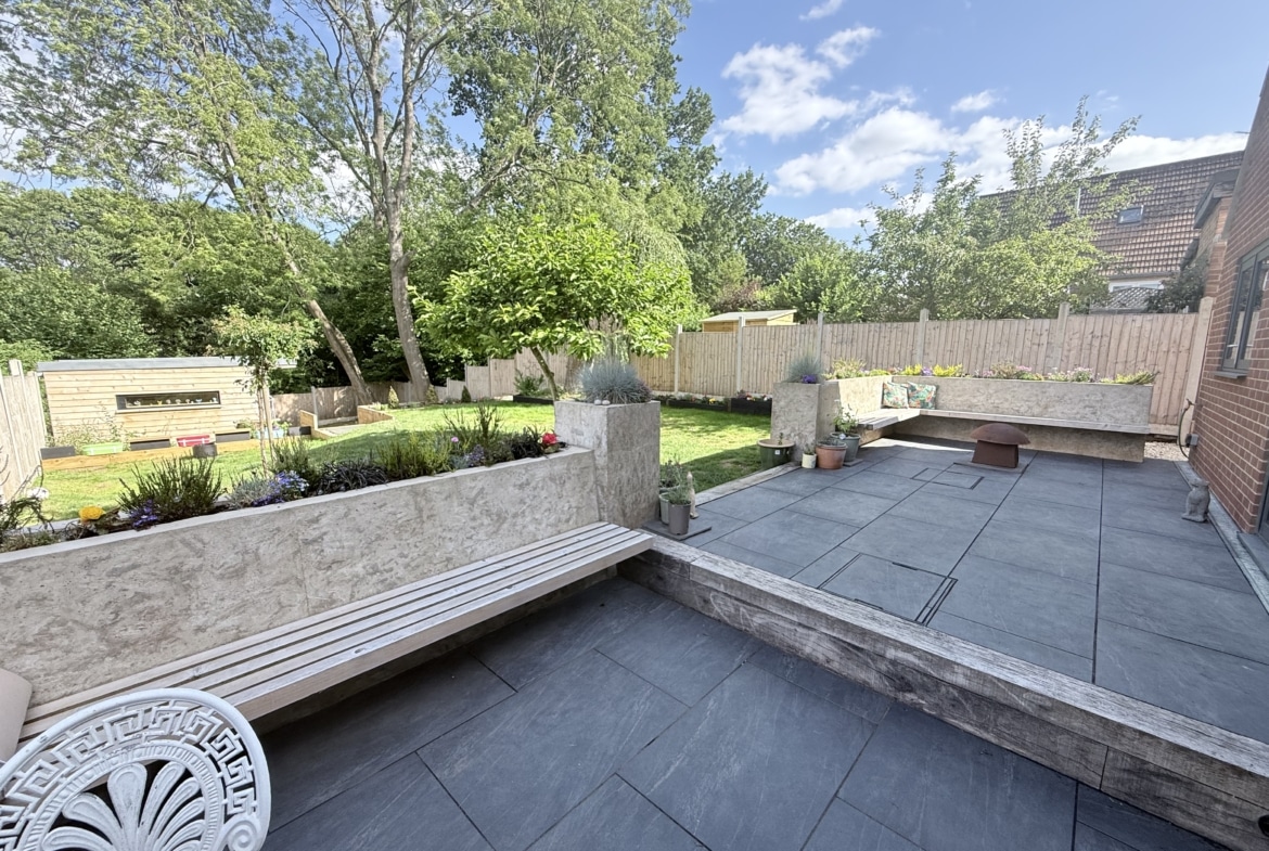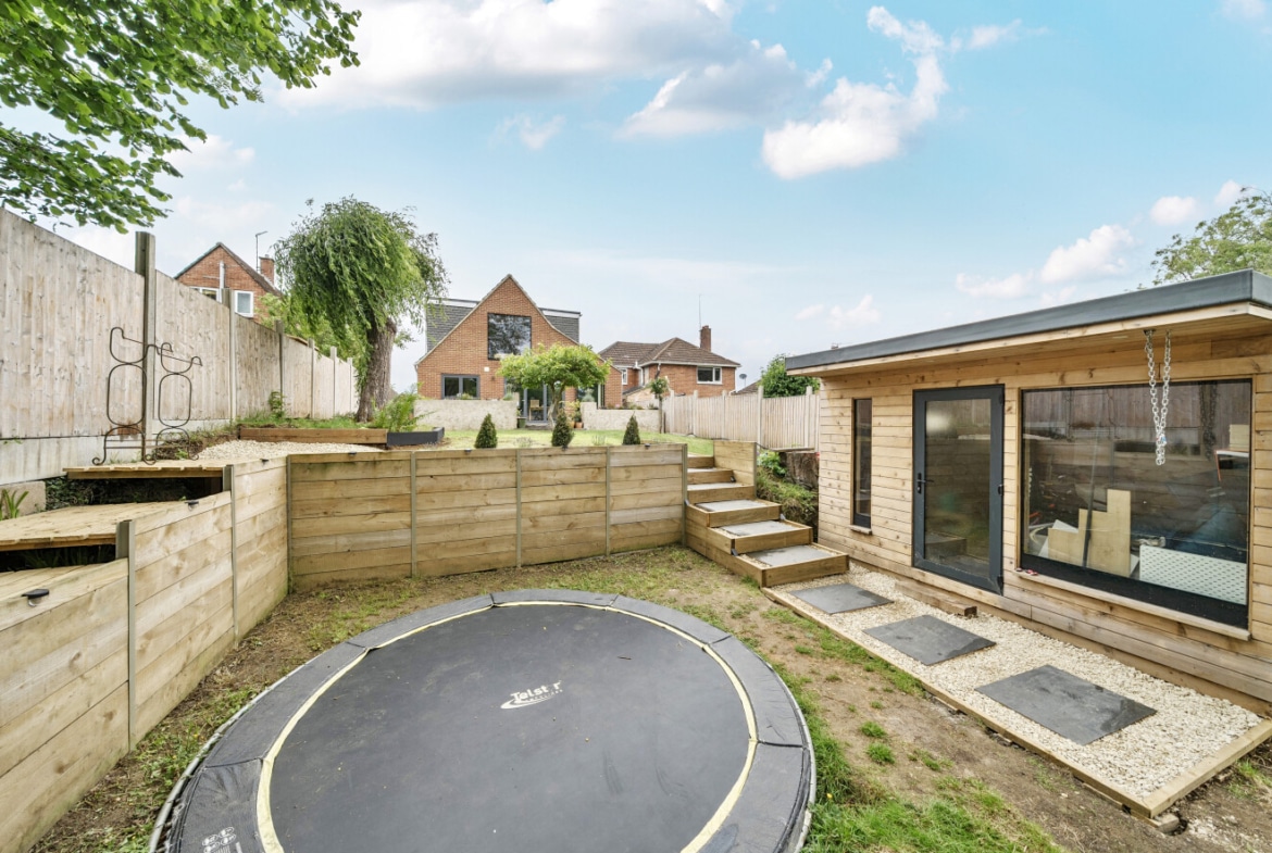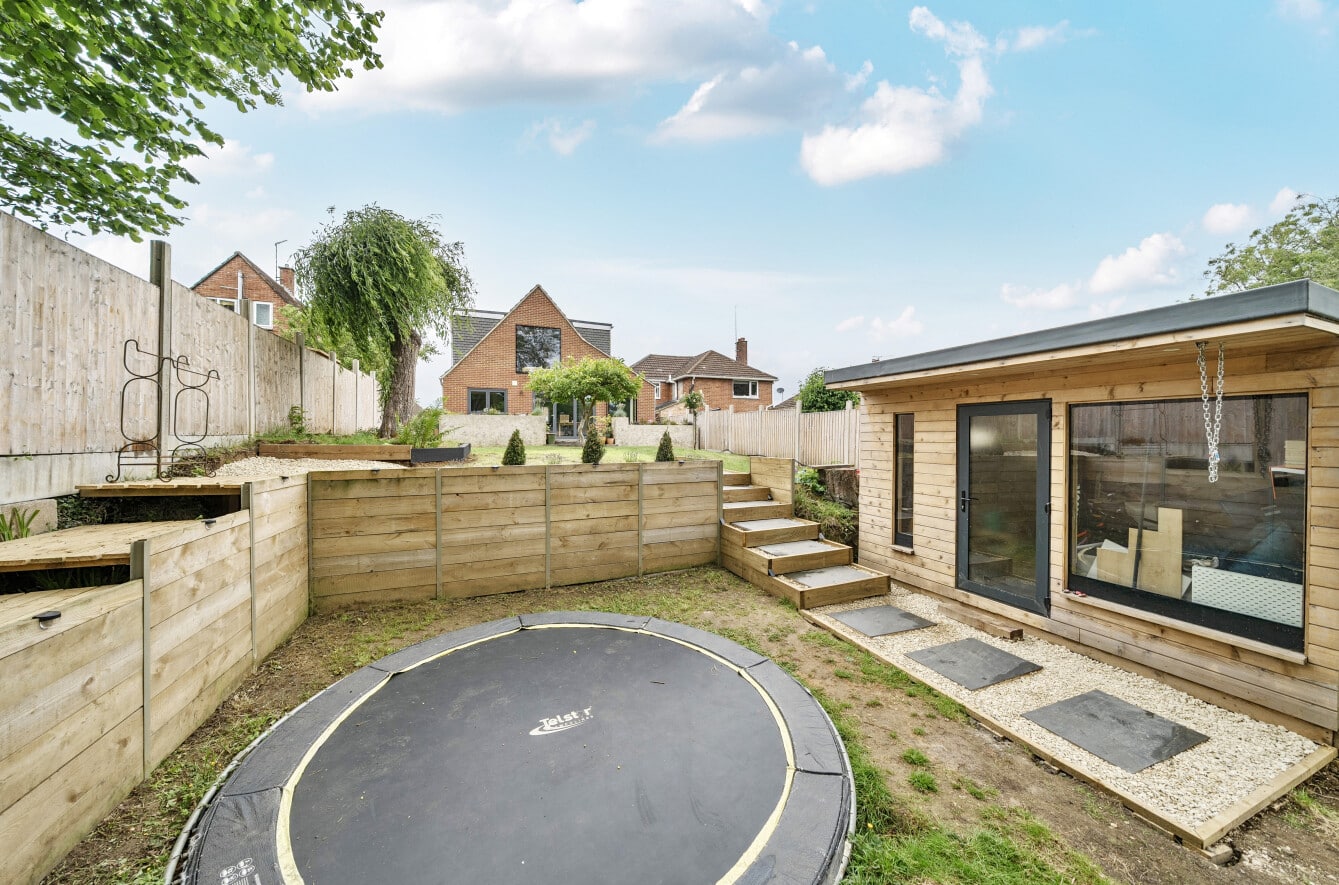 To the outside, the large Rear Garden has been landscaped with spacious patio area with inset seating and opens to the lawn, raised flower borders, steps leading down to further lawned area, Summerhouse, which could make a fantastic Home Office or Games Room for the children, recessed trampoline and all enclosed by timber fencing and enjoying a private natural aspect to the rear. To the front, has had a new driveway laid with Breedon Golden Amber gravel, and providing access to the front door and to the side.