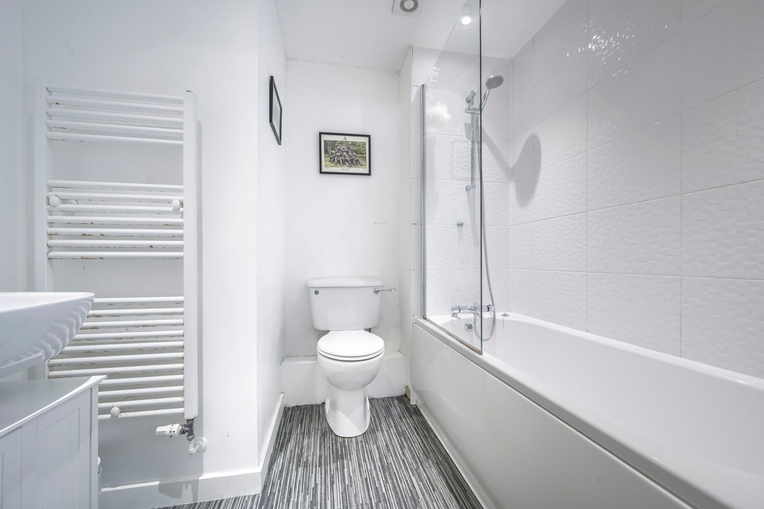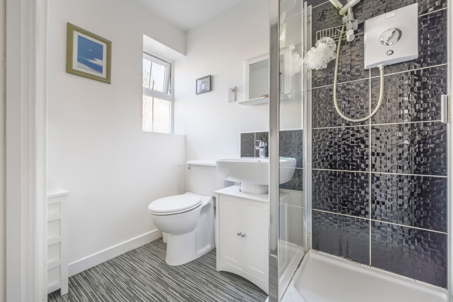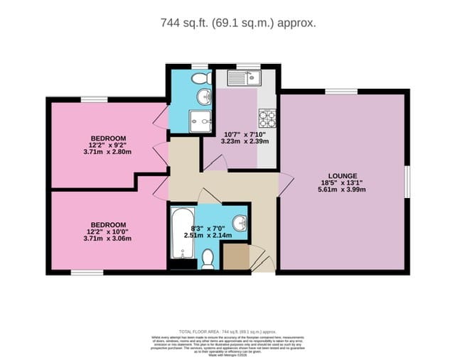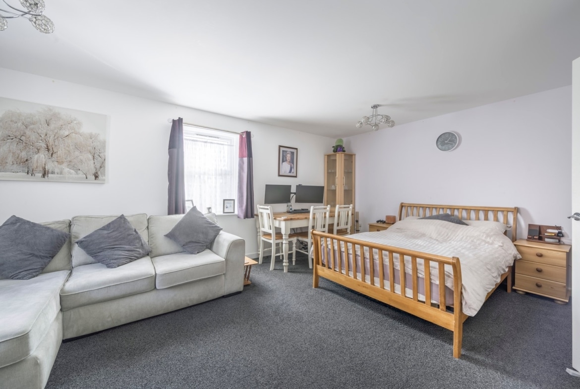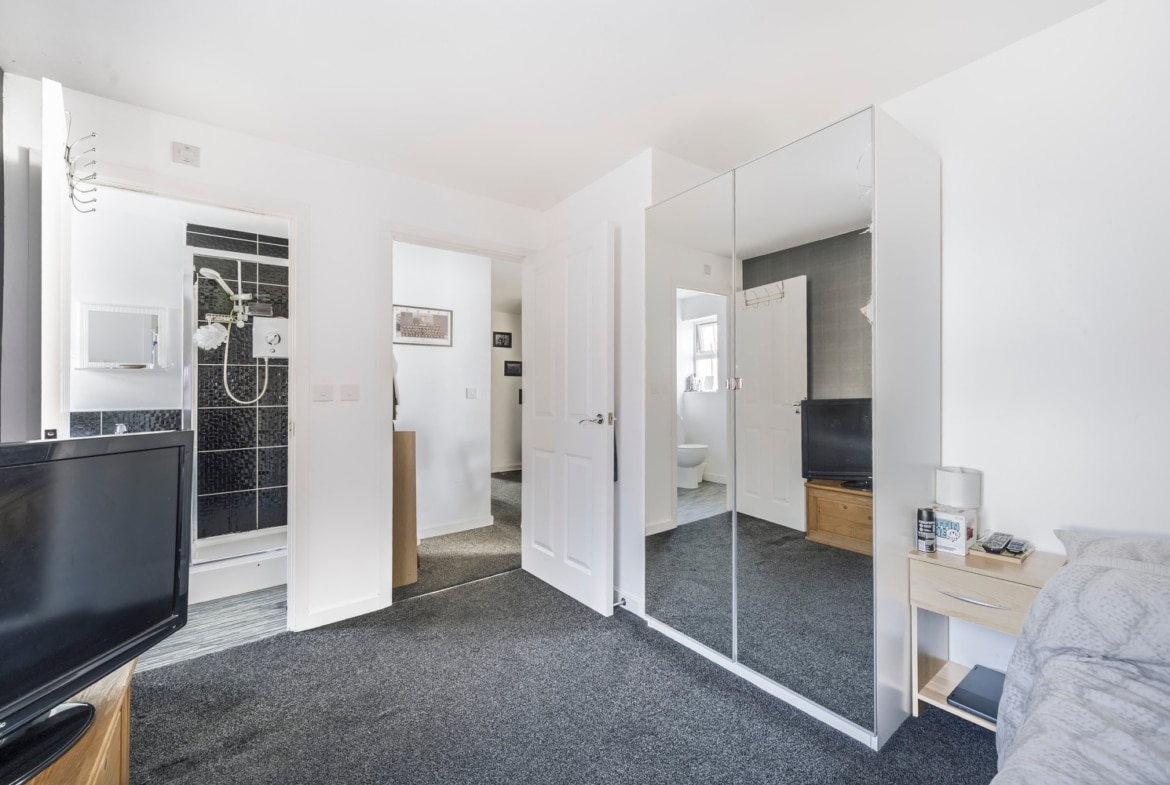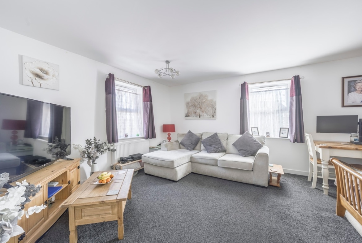 This elegant home features two well-proportioned double bedrooms, with the principal bedroom enjoying its own en-suite shower room. A welcoming entrance hall leads to a bathroom, a separate fitted kitchen, and a bright, spacious living/dining room — the perfect space to relax or entertain.