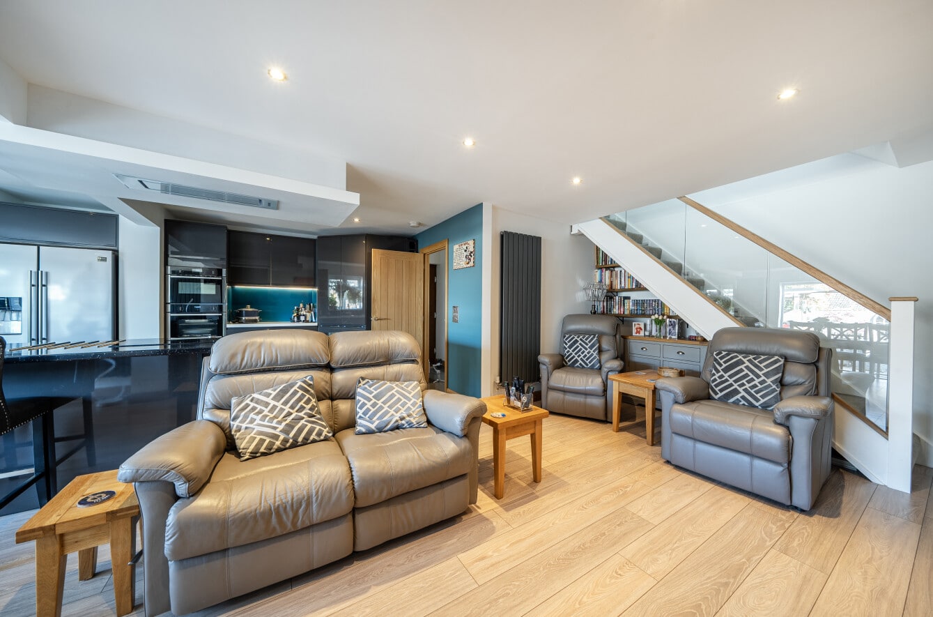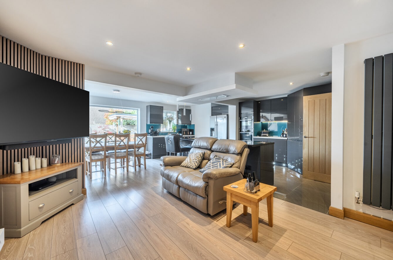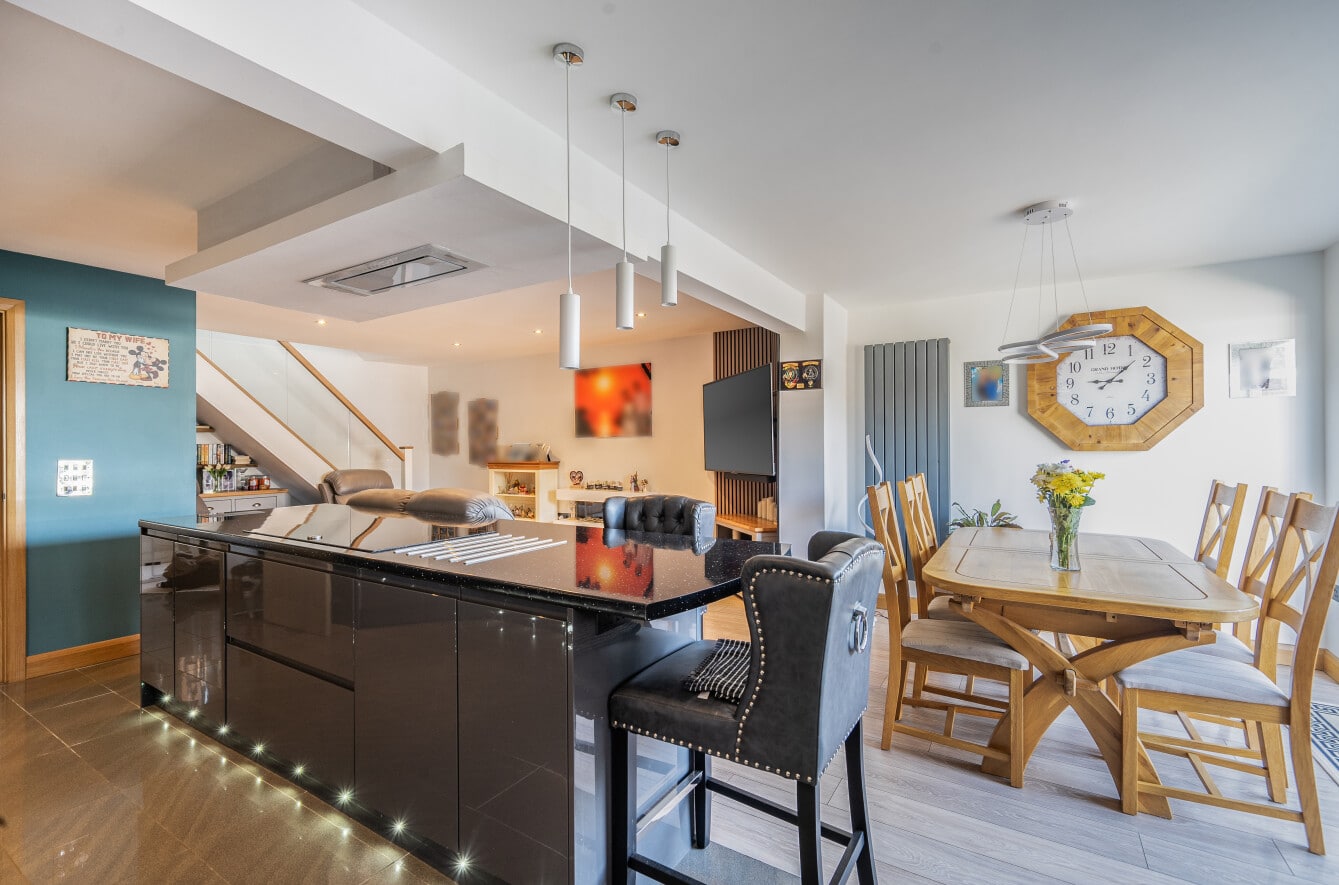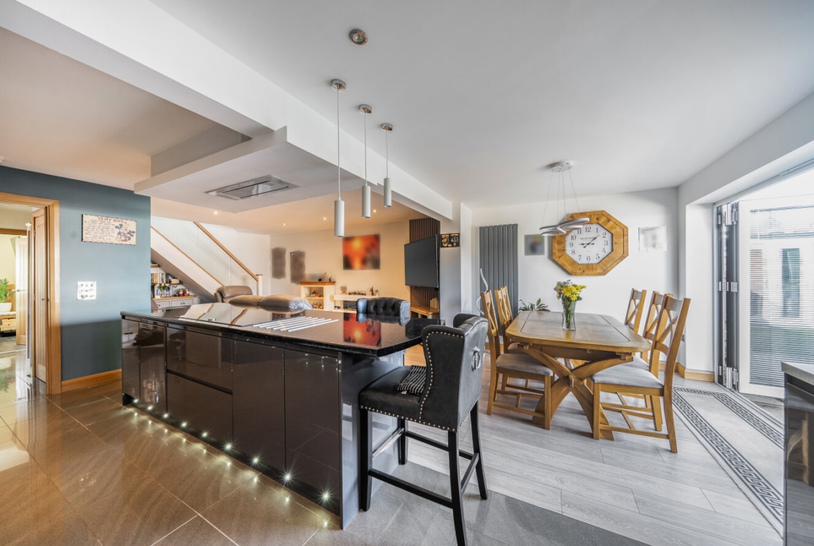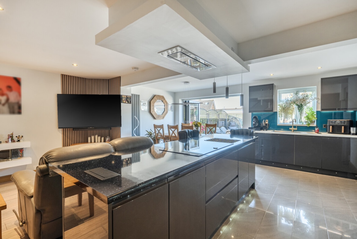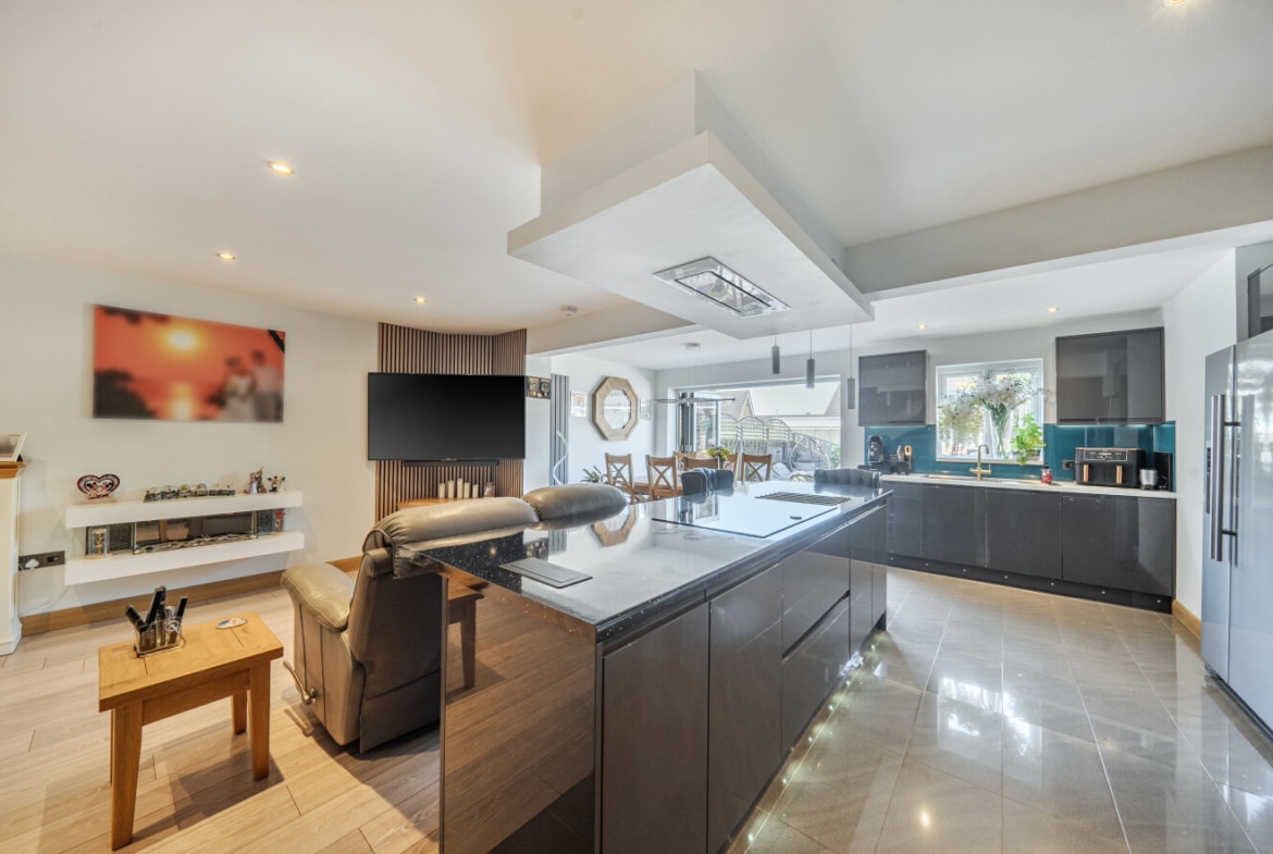 Finished to a high modern standard throughout, the property welcomes you with a spacious and light-filled open-plan kitchen, reception, and dining area — the true heart of the home. Designed for both everyday living and entertaining, this impressive space features sleek cabinetry, quality fittings, and generous room for family gatherings, all enhanced by an abundance of natural light.