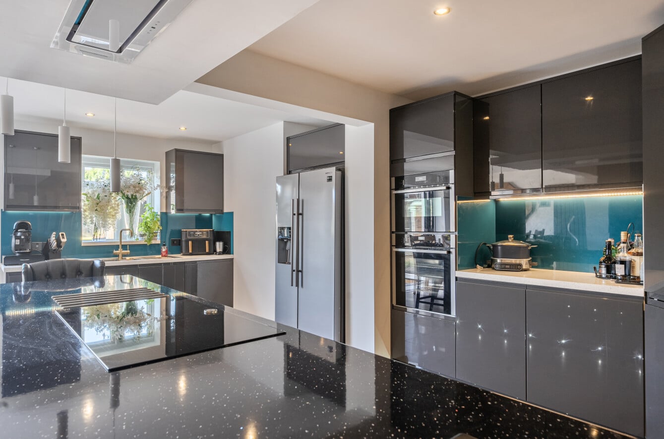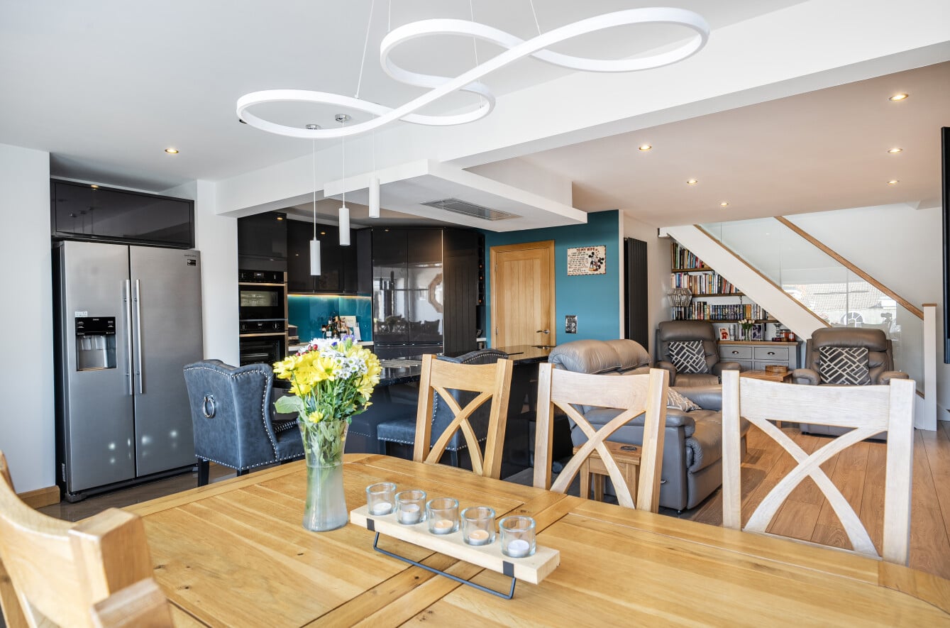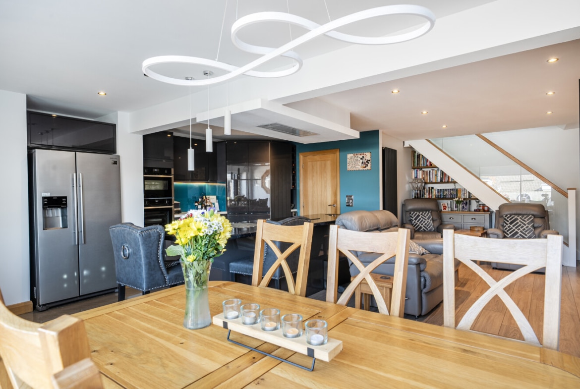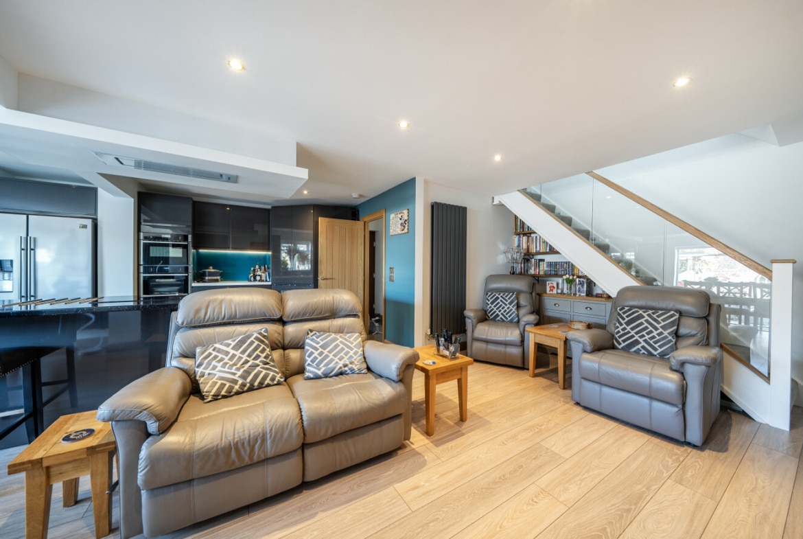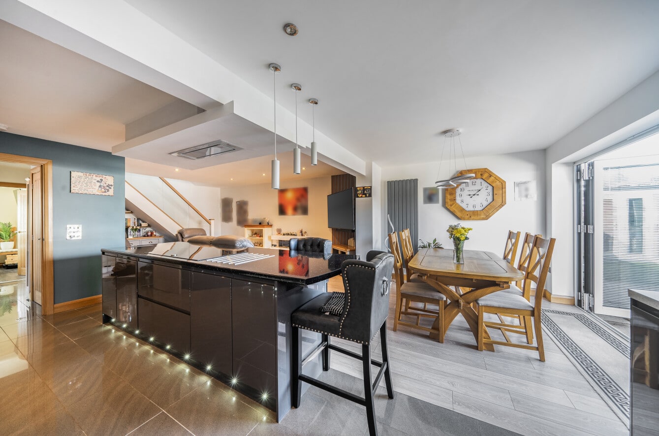 Finished to a high modern standard throughout, the property welcomes you with a spacious and light-filled open-plan kitchen, reception, and dining area — the true heart of the home. Designed for both everyday living and entertaining, this impressive space features sleek cabinetry, quality fittings, and generous room for family gatherings, all enhanced by an abundance of natural light.